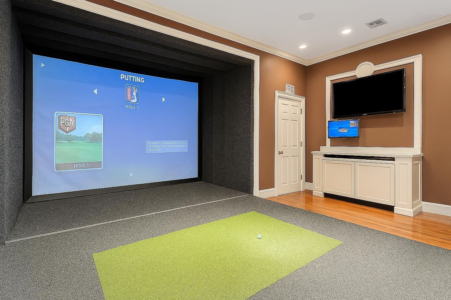 The lower level is designed for entertainment, featuring a dynamic media room with tiered theater seating, a custom golf simulator suite, a full bath, and a spacious 3-car tandem garage with custom Vault cabinetry.
