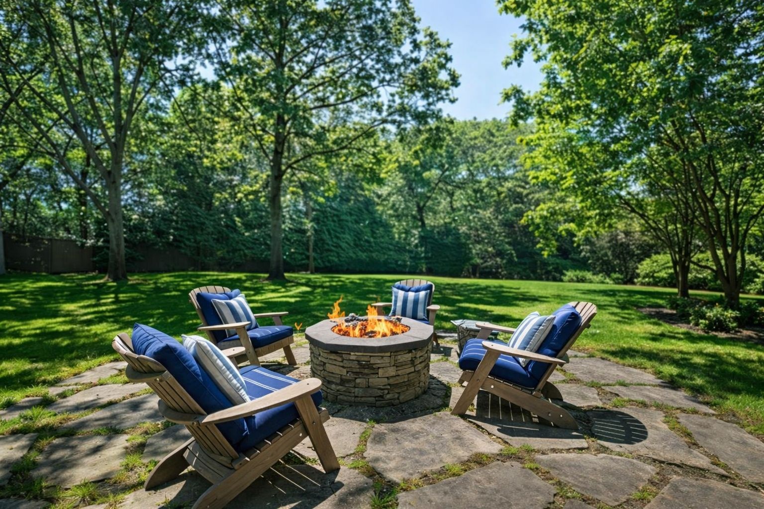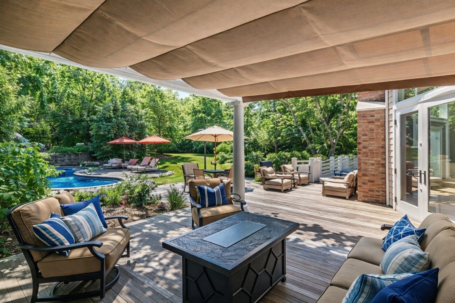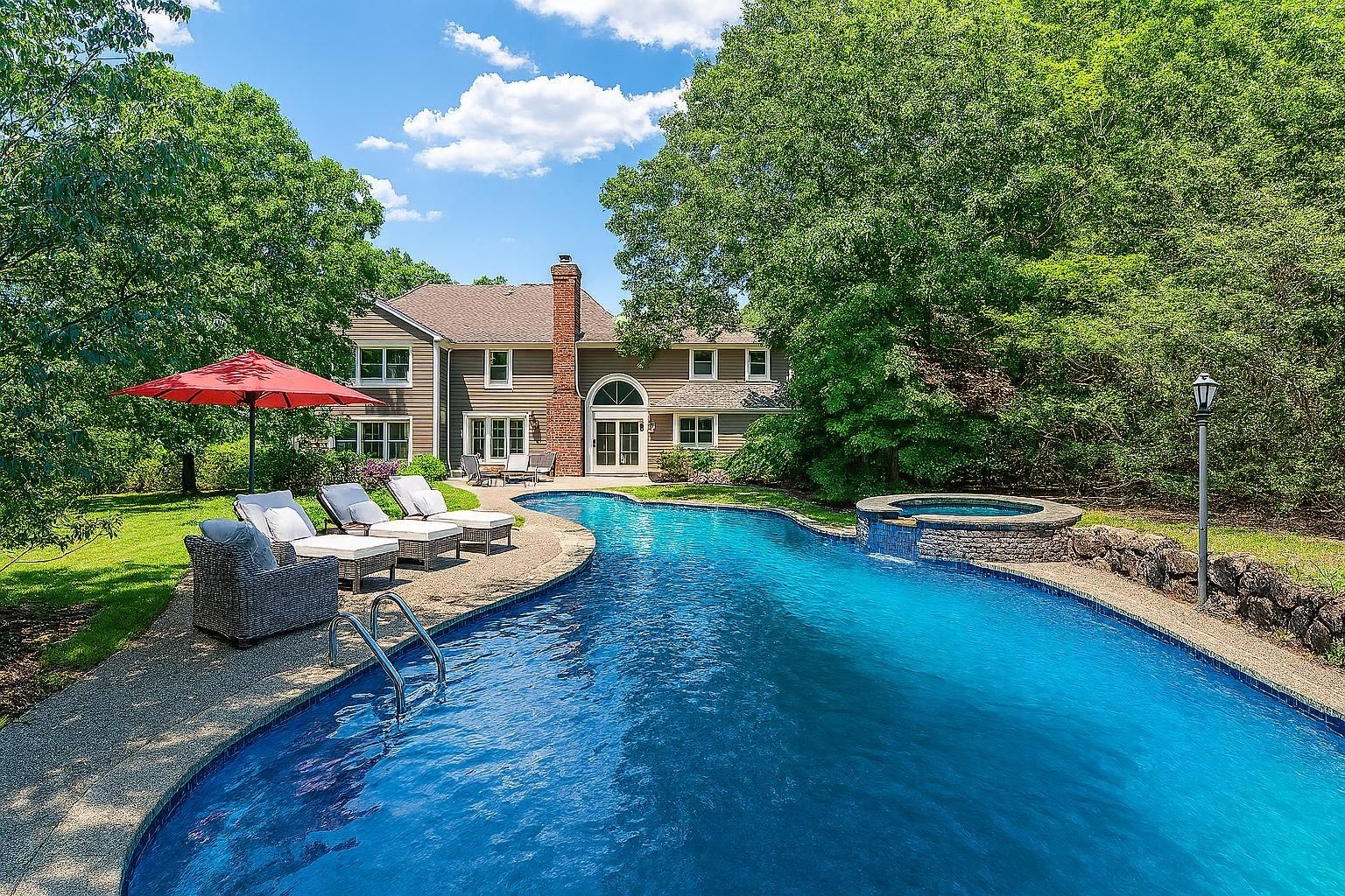 Resort-style living continues outdoors with a heated gunite pool, spa, double waterfalls, and an incredible custom waterslide. The lush, manicured grounds showcase an expansive deck, pergola, bluestone patio, fully equipped outdoor kitchen with wraparound seating, and a gas fire pit. Evening gatherings are elevated by gas tiki torches and thoughtfully designed landscape lighting.