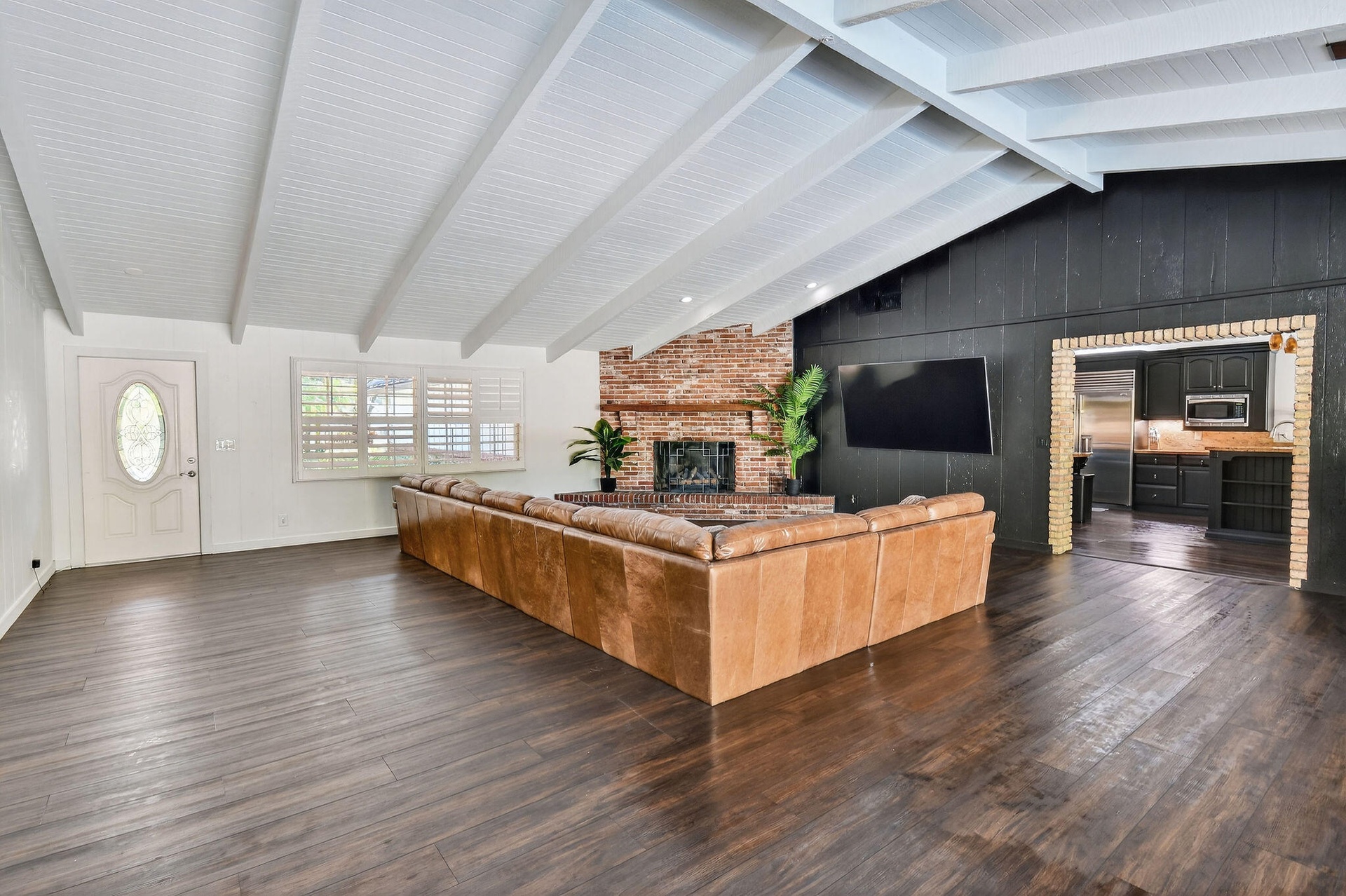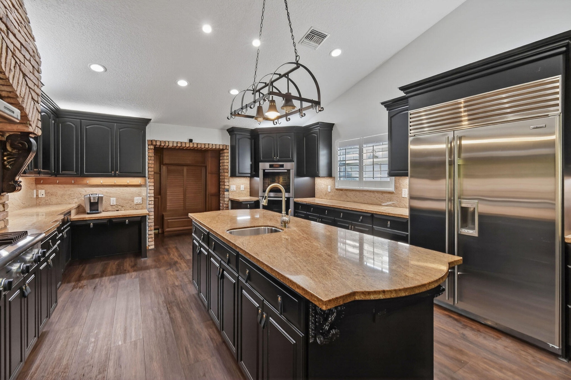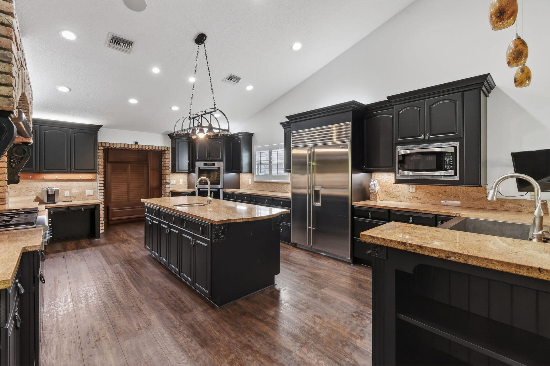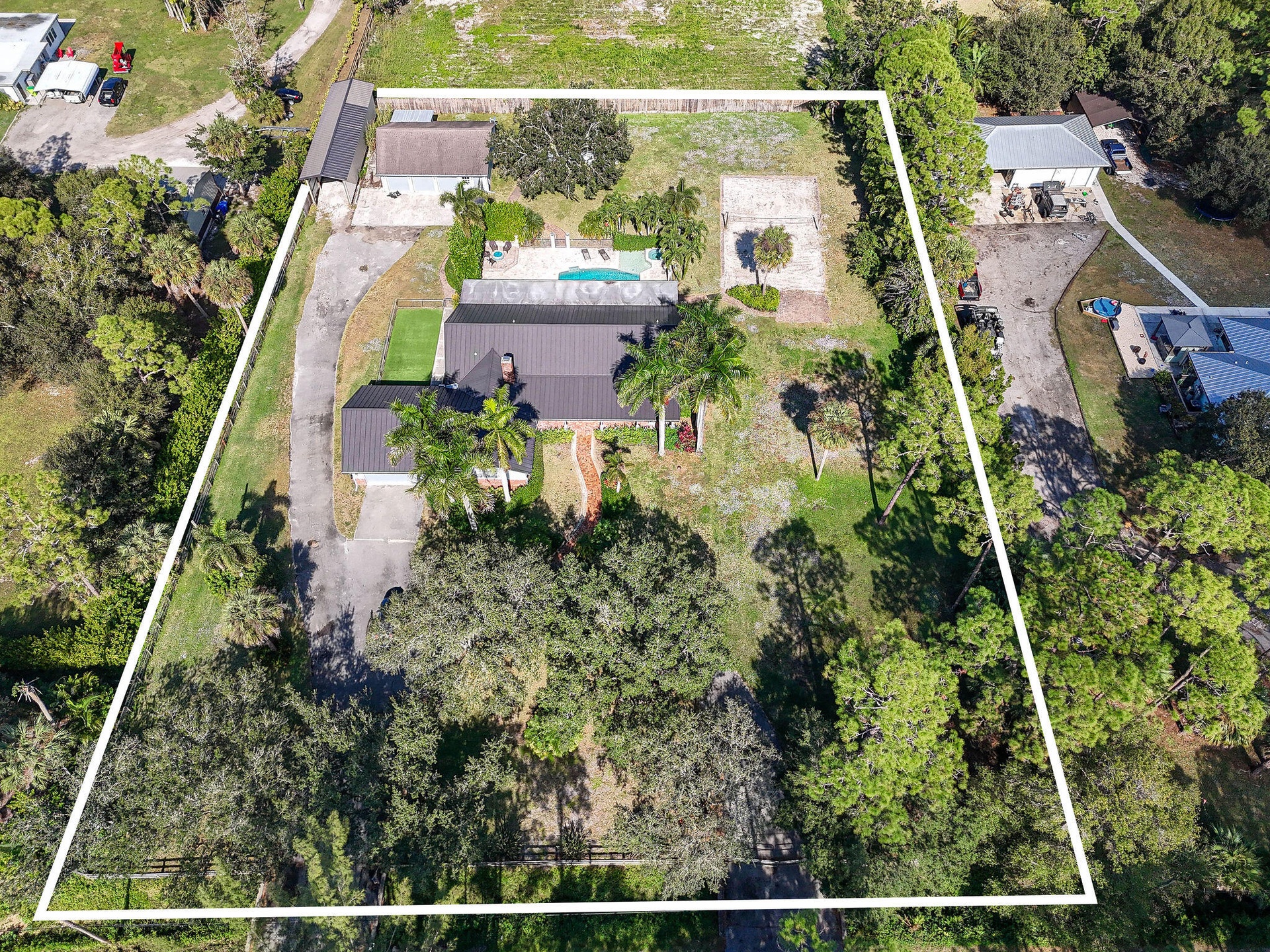 Set on 1.69 acres in 'Loxahatchee Groves', this home offers privacy, generous space, and comfortable indoor and outdoor living. The living room features impact windows, vaulted ceilings, a wood-burning fireplace, and a bar area with a wine cooler, icemaker, wet bar, and built-in TV. The kitchen includes a center island with sink and electric access, a six-burner Thermador gas range, Miele dual wall ovens, and Subzero refrigerator and freezer. Plantation shutters and laminate flooring run throughout much of the home. The primary suite offers a spacious sitting area, custom built-in closet wall, and a beautifully finished bathroom with a garden tub, walk-in shower with glass enclosure, mosaic tile accents, and a vanity at the sink. The fourth bedroom serves well as a VIP suite, featuring recessed lighting, a walk-in shower, a garden tub, dual sinks, and built-in closet storage. Bedrooms two and three include recessed lighting and built-in cabinetry, and they share a hallway bathroom with a tub and shower combination. The laundry room includes a sink, folding space, and a built-in workspace. Outdoor living is a highlight, with a covered patio, swimming pool with sun shelf and spa, an outdoor kitchen with KitchenAid grill and cooktop, a fire pit area, a dog run, a sand volleyball court, and multiple storage buildings. The detached three-bay garage, paved driveway, and RV parking provide flexibility for vehicles, equipment, or hobbies. Impact glass and thoughtful interior features complete this versatile property, ideal for those looking for room to spread out and enjoy a relaxed country lifestyle.