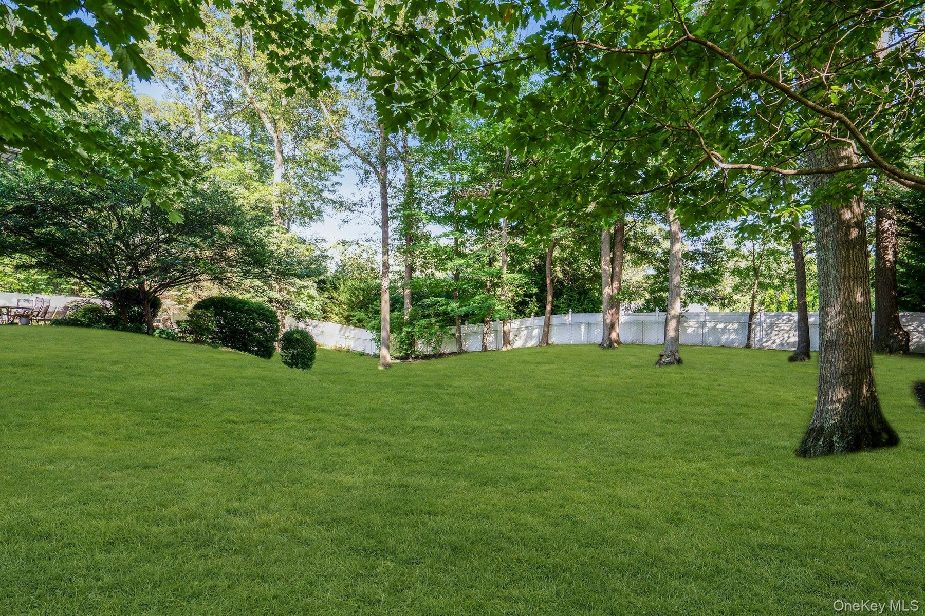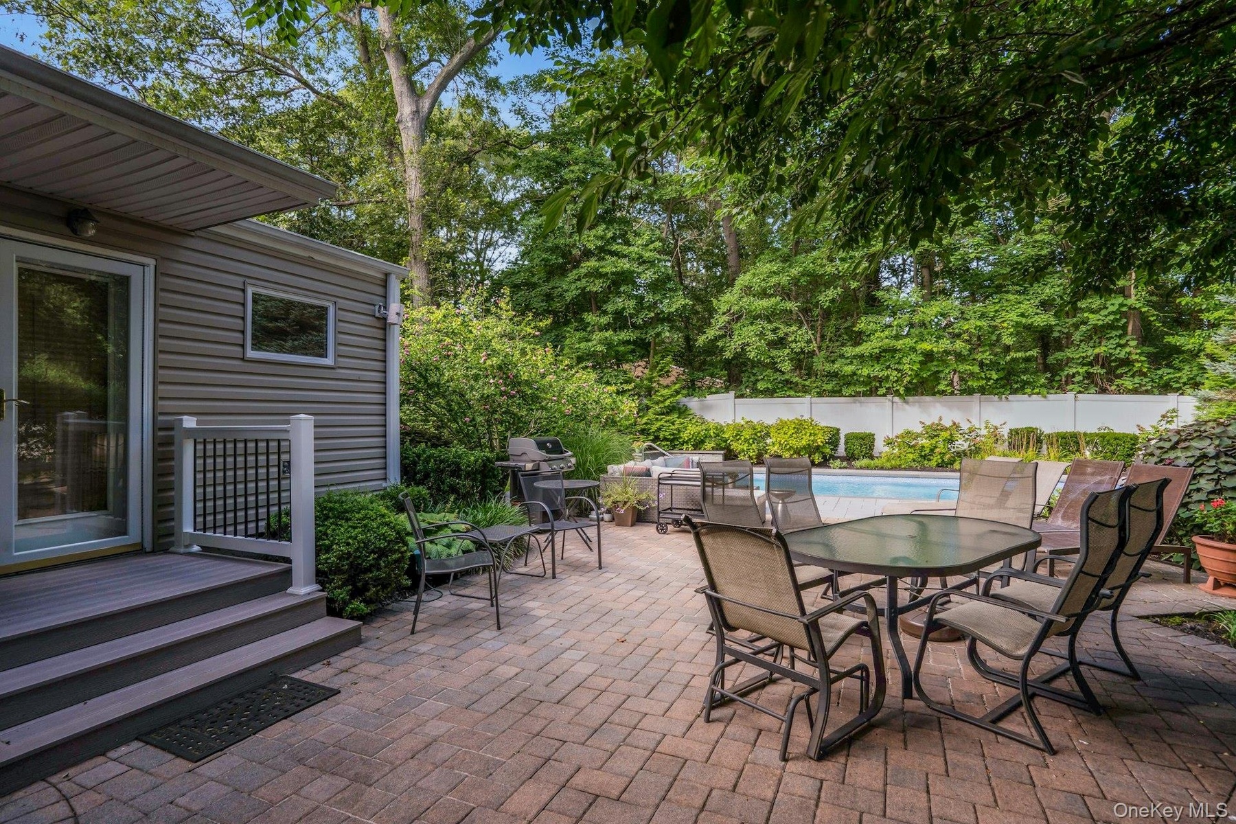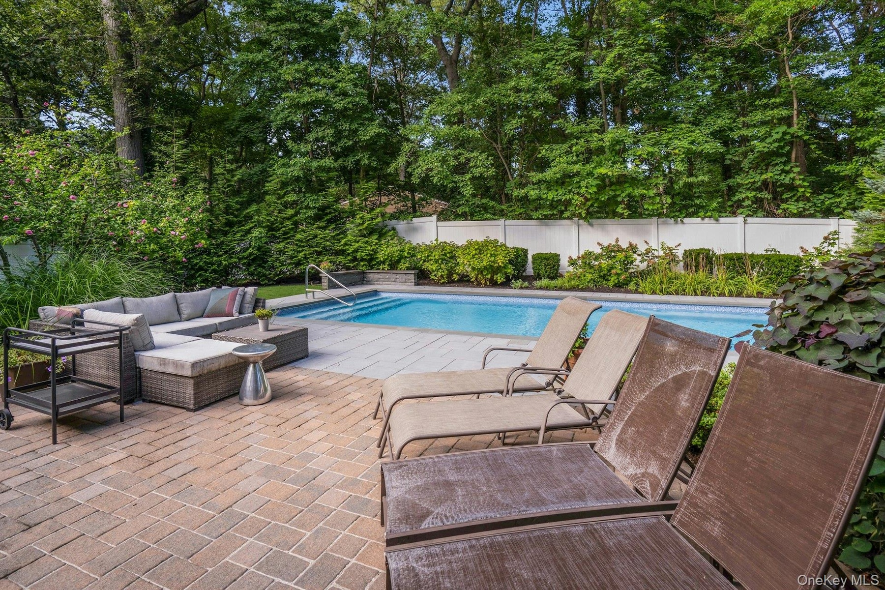 This is a lovely home in a great location in Village on the Hill in Dix Hills. Professionally landscaped home sits on .59 acres with a long driveway, fully fenced yard and in-ground pool. First enter the large foyer with coat closet. This ranch flows like a colonial from room to room. The formal living room has a fabulous window and cathedral ceilings. It flows into the formal dining room which also has a beautiful picture window. The kitchen features custom cabinets and stainless appliances, such as a Thermador gas cooktop, Dacor wall oven, Dacor warming drawer, Dacor microwave, Kitchenaid dishwasher (5 yrs) and a NEW LG refrigerator. The kitchen table overlooks the yard and there is the first of 3 skylights. The family room has a woodburning brick fireplace that brings warmth into the room and a fabulous skylight. The sliders go out to the patio. The primary bedroom was expanded and features vaulted ceilings, 2 walk-in-closets, architctural features and an ensuite bathroom with skylight. A true get away oasis. The best part is that there is also a small office in the bedroom with a glass French door. So pretty. The other 2 bedrooms are nice sizes and the main bathroom has a tub. The basement is newly renovated with a den, storage room and utility room. The 2 car garage enters into the basement at ground floor level. The beautiful yard features a heated, salt-water pool with a vinyl liner (2021). The electric heater was put in in 2024. The rest of the yard has a great lawn for activities, it is fully fenced and of course, has a brand new patio off of the kitchen and den. This is the one you have been looking for! Whirlpool Washer and Dryer (5 yrs), Roof 17 yrs, Cesspool original and pumped 5 years ago. 200 Amp, CAC (16 yrs), Boiler (14 yrs), Hot Water Heater (16 yrs) Chandelier in primary bedroom foyer is excluded.