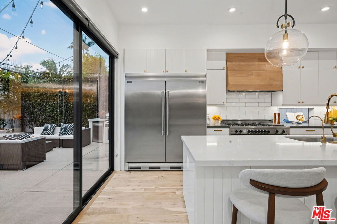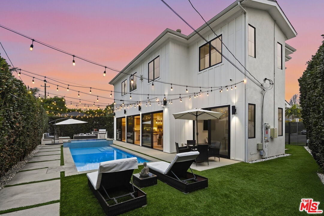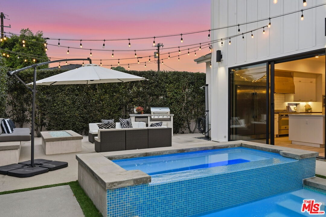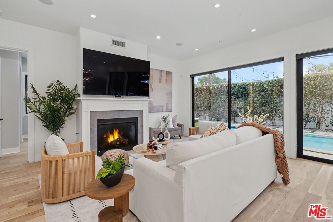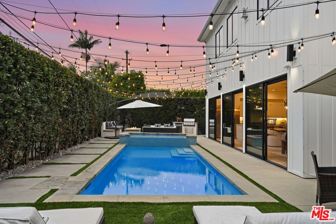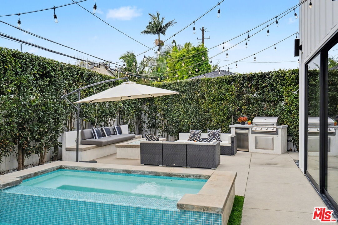 This is a truly exceptional 4 bedroom, 4.5 bath modern farmhouse situated at the end of a charming Venice cul-de-sac. Beautiful wood floors, designer lighting, high ceilings, and abundant natural light create a bright, open, and airy floor plan thoughtfully designed for modern living. The gourmet kitchen is equipped with top of the line appliances, including a Bertazzoni range, and features an expansive kitchen island with bar seating and opens to the dining and living area with a fireplace. A wall of Fleetwood sliding glass doors opens to a private, hedged backyard featuring a beautiful saltwater pool with Italian tile, spa, gas fire pit, built in BBQ, refrigerator, outdoor shower, and exterior bathroom. A flexible downstairs bedroom currently presented as an office adds versatility to the main level, and the home offers direct access from the garage into the kitchen. Upstairs, the landing provides additional flexible space ideal for a reading nook, home office, or gym. The impressive primary suite offers a fireplace, dual vanities, a soaking tub, an oversized separate shower with designer finishes, and a large custom walk in closet. Two additional en-suite bedrooms and a dedicated laundry room complete the upper level. Smart home upgrades include Ring doorbell, security cameras, built in speakers, Nest thermostat, Tesla electric vehicle charger, owned solar, and mobile pool automation. Ideally located near great restaurants, trendy shops, parks, Abbot Kinney, Whole Foods, Penmar Golf Course, and the beach. Rebuilt by Thomas James Homes in 2017.