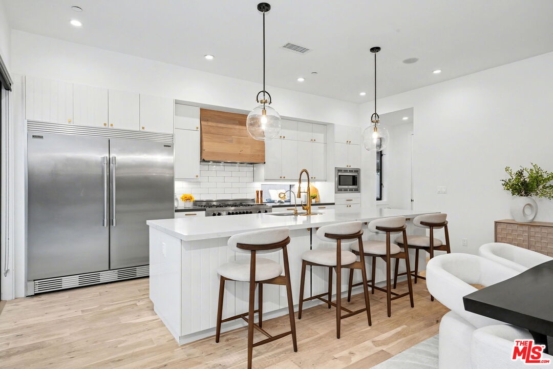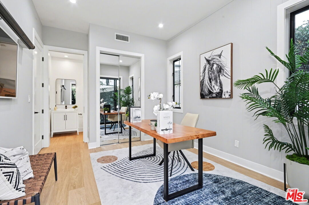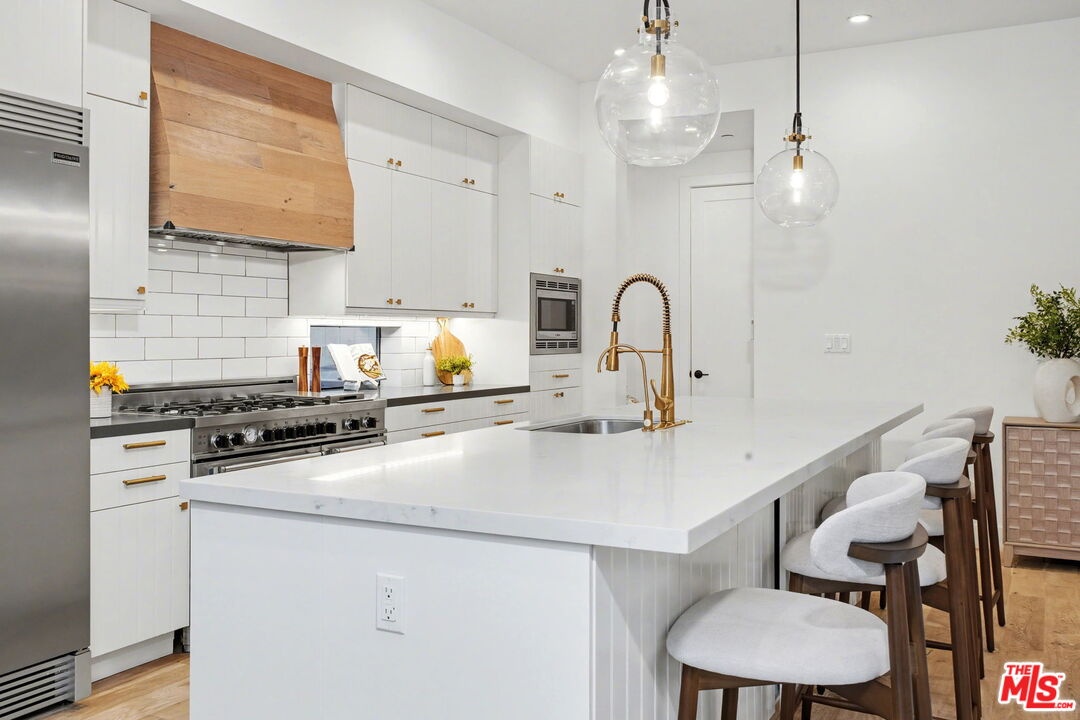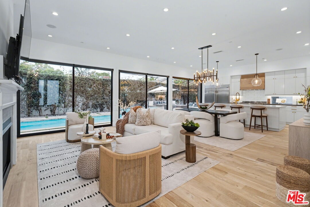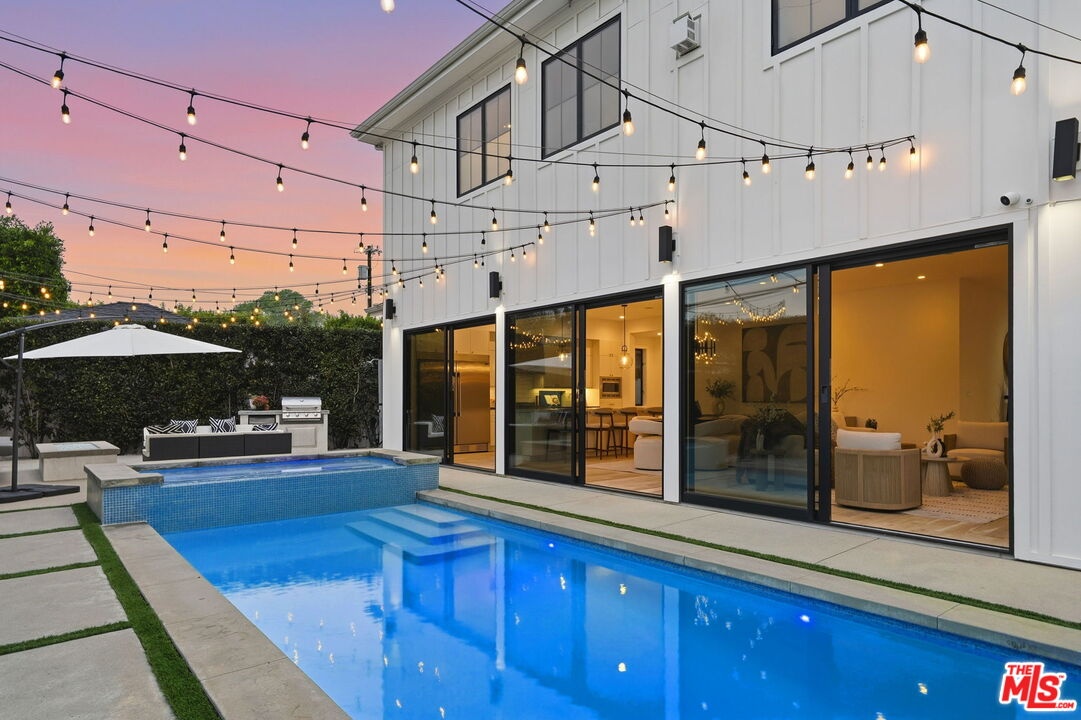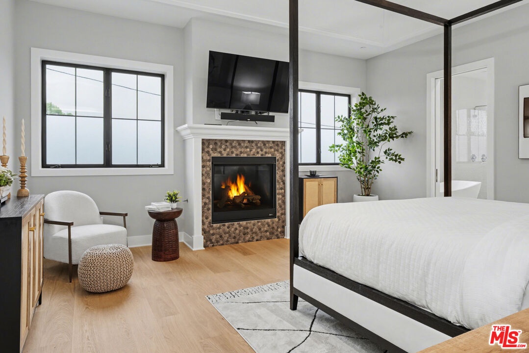 This is a truly exceptional 4 bedroom, 4.5 bath modern farmhouse situated at the end of a charming Venice cul-de-sac. Beautiful wood floors, designer lighting, high ceilings, and abundant natural light create a bright, open, and airy floor plan thoughtfully designed for modern living. The gourmet kitchen is equipped with top of the line appliances, including a Bertazzoni range, and features an expansive kitchen island with bar seating and opens to the dining and living area with a fireplace. A wall of Fleetwood sliding glass doors opens to a private, hedged backyard featuring a beautiful saltwater pool with Italian tile, spa, gas fire pit, built in BBQ, refrigerator, outdoor shower, and exterior bathroom. A flexible downstairs bedroom currently presented as an office adds versatility to the main level, and the home offers direct access from the garage into the kitchen. Upstairs, the landing provides additional flexible space ideal for a reading nook, home office, or gym. The impressive primary suite offers a fireplace, dual vanities, a soaking tub, an oversized separate shower with designer finishes, and a large custom walk in closet. Two additional en-suite bedrooms and a dedicated laundry room complete the upper level. Smart home upgrades include Ring doorbell, security cameras, built in speakers, Nest thermostat, Tesla electric vehicle charger, owned solar, and mobile pool automation. Ideally located near great restaurants, trendy shops, parks, Abbot Kinney, Whole Foods, Penmar Golf Course, and the beach. Rebuilt by Thomas James Homes in 2017.