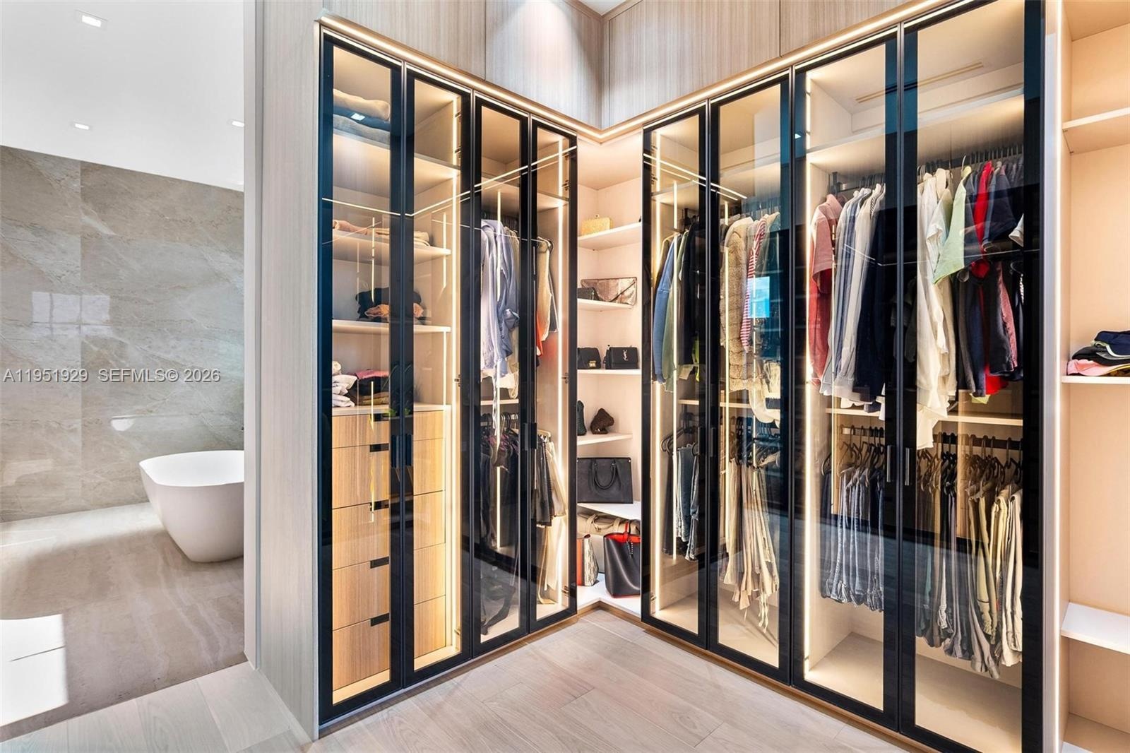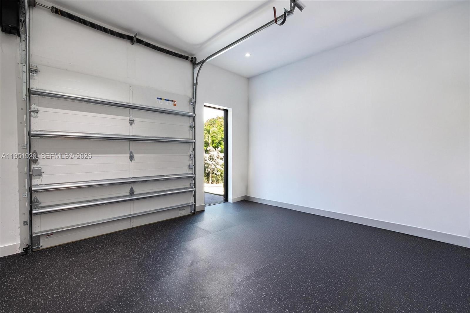 The home opens into a dramatic foyer where soaring ceilings and floor-to-ceiling glass flood the space with natural light. The open-concept design creates a seamless transition to the outdoors, resulting in 4,922 SF of total living area. The exterior is equally impressive, featuring a large private garden anchored by a pool and lush landscape.