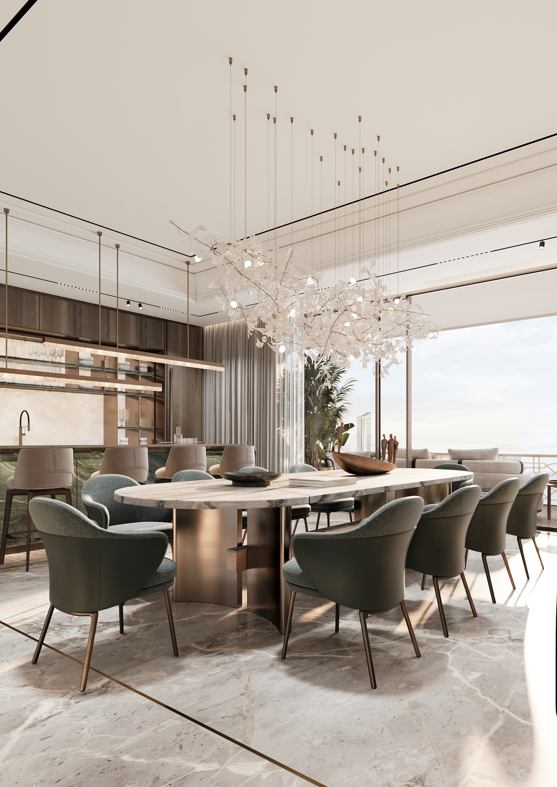 At the upper level, a further living and dining environment is anchored by a refined kitchen with breakfast counter and separate preparation kitchen, creating an ideal setting for hosting while maintaining discreet service. Panoramic terraces on this level offer some of the most commanding outlooks within the entire development.