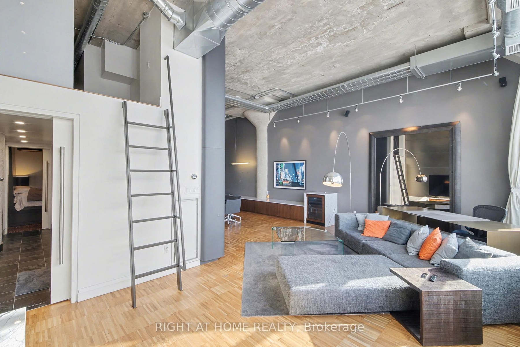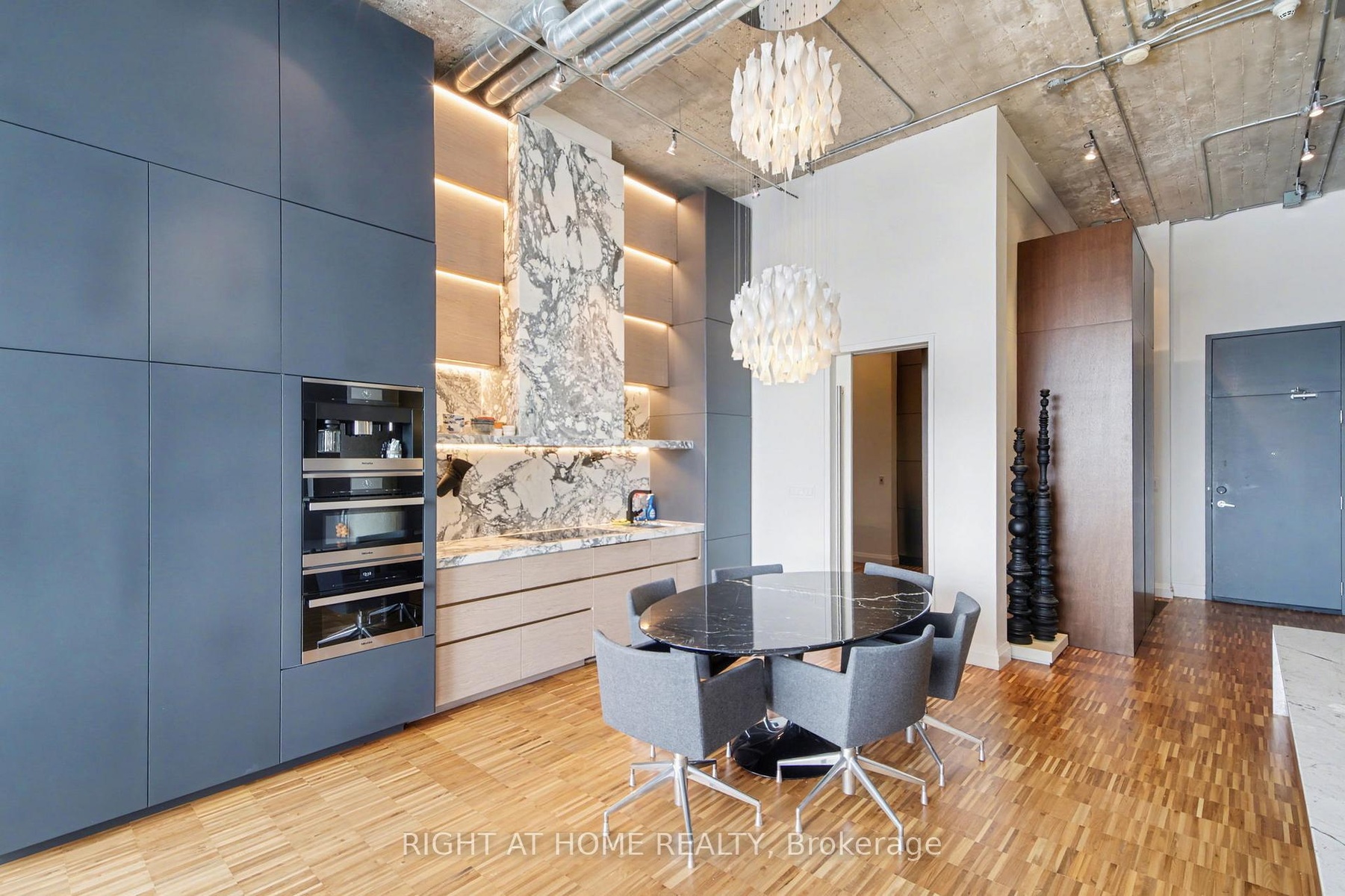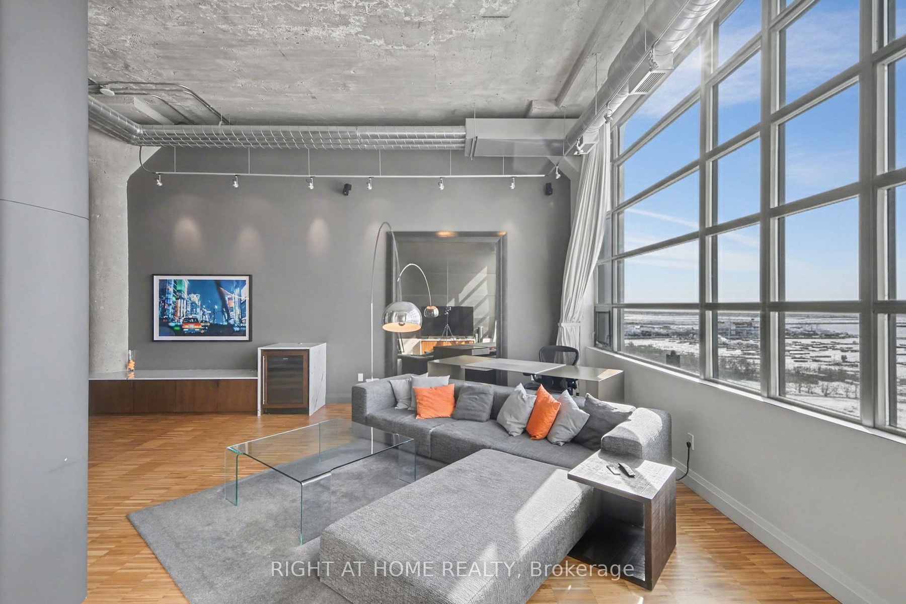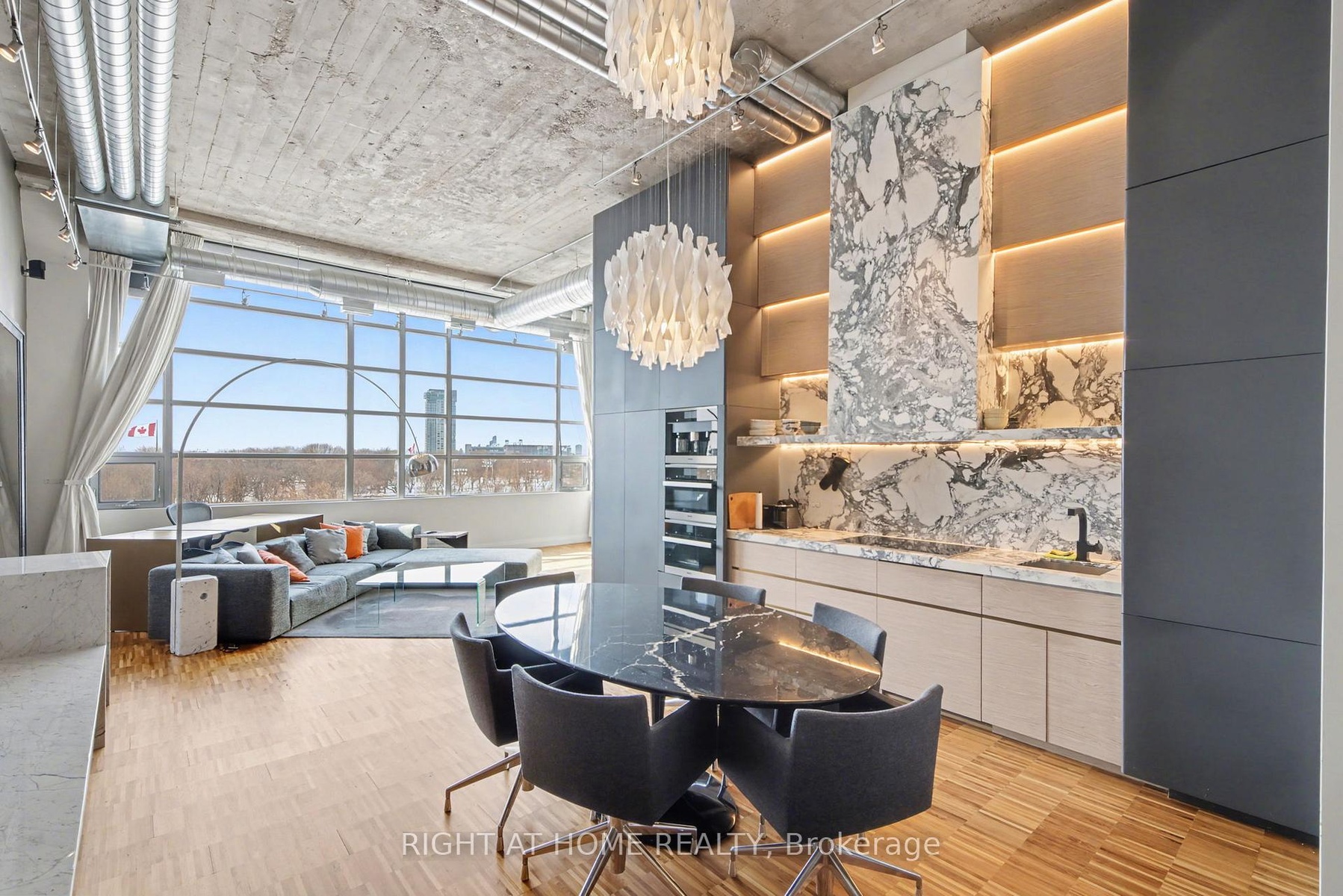 Original hard loft in the Tip Top Tailor Building featuring authentic concrete pillars and exposed concrete ceilings. This southwest-facing suite, previously featured in Canadian Interiors magazine, offers unobstructed water views and excellent natural light.The unit includes marble countertops throughout, hardwood floors, air conditioning, a queen-size bed, and is offered fully furnished with designer pieces including an Italian Living Divani sectional, marble dining table, custom bronze work desk, and Herman Miller chair. Additional features include Miele appliances (coffee machine, steam oven, speed/microwave oven), wine fridge, 65" Smart TV, Flos Arco floor lamp, stacked washer/dryer, and fibre high-speed Internet. Sculptures by a recognized Canadian artist add a distinctive design element.Enjoy unobstructed views of Coronation Park and a prime Lake Ontario waterfront location with direct access to the Martin Goodman Trail, Coronation Park, Stadium Road Park, Lakeshore Blvd W, and Toronto's downtown core. Steps to restaurants, cafés, bars, transit, and waterfront amenities.Building amenities include a full gym and hot tub on the ground floor. Optional parking with a private EV charging station is available at an additional cost.Hydro, water, and internet are included