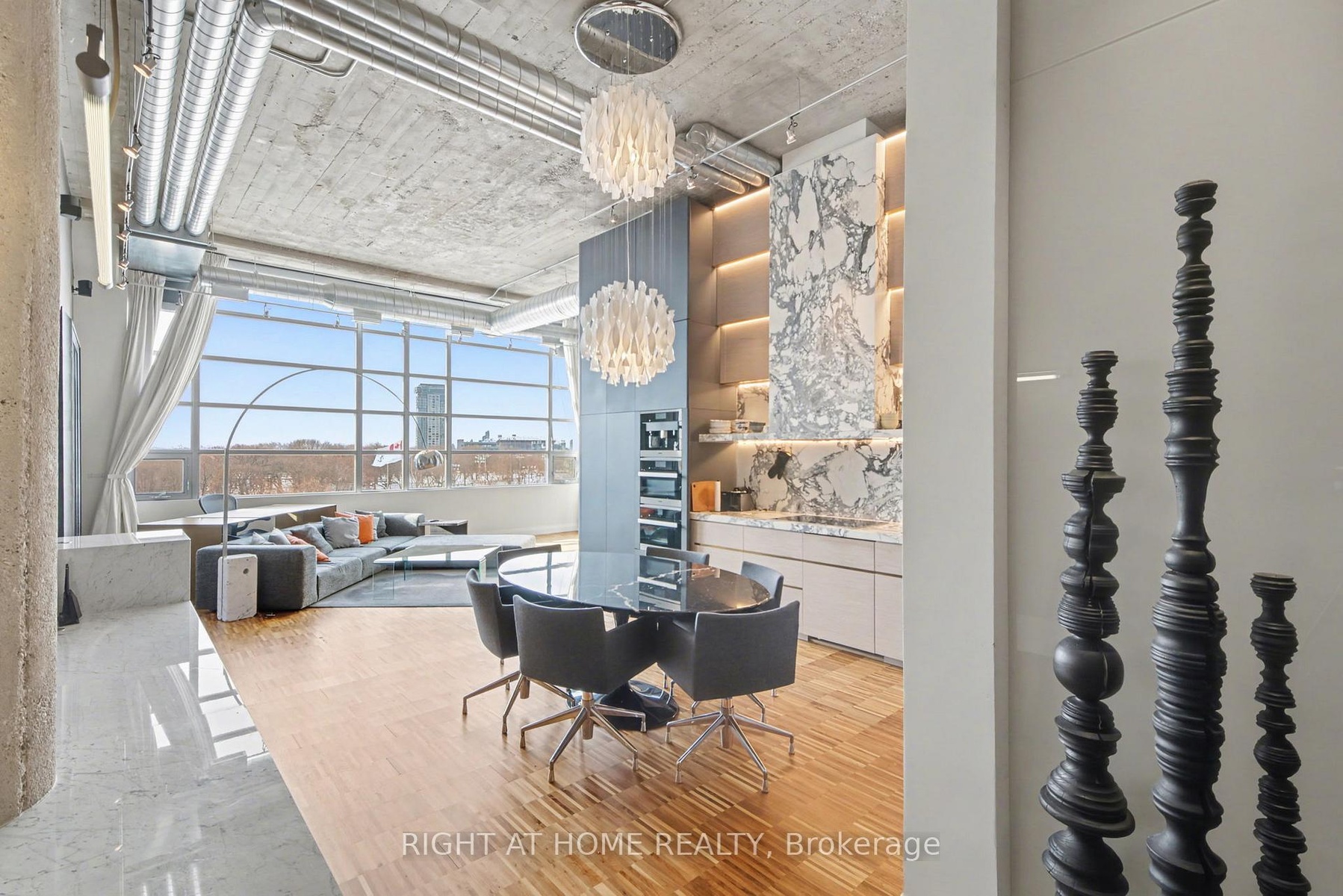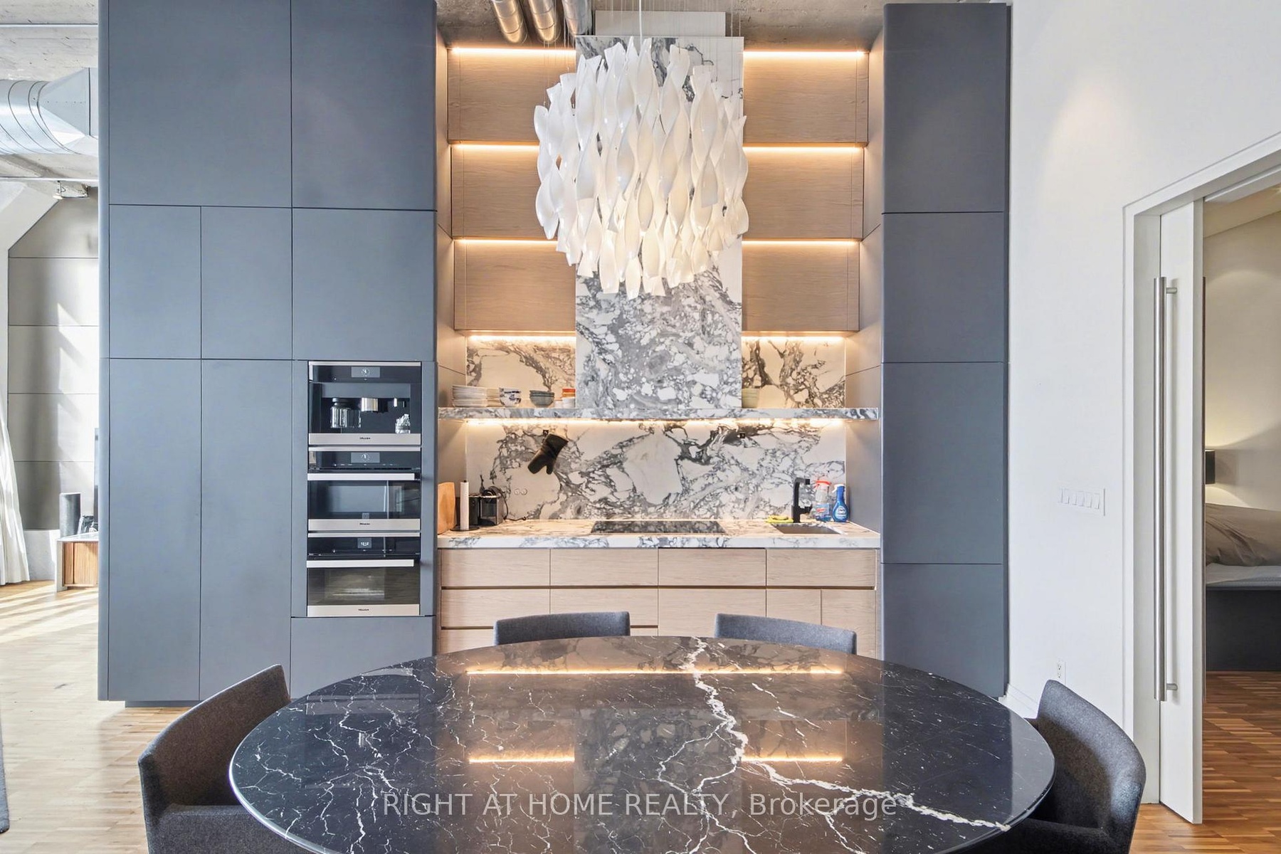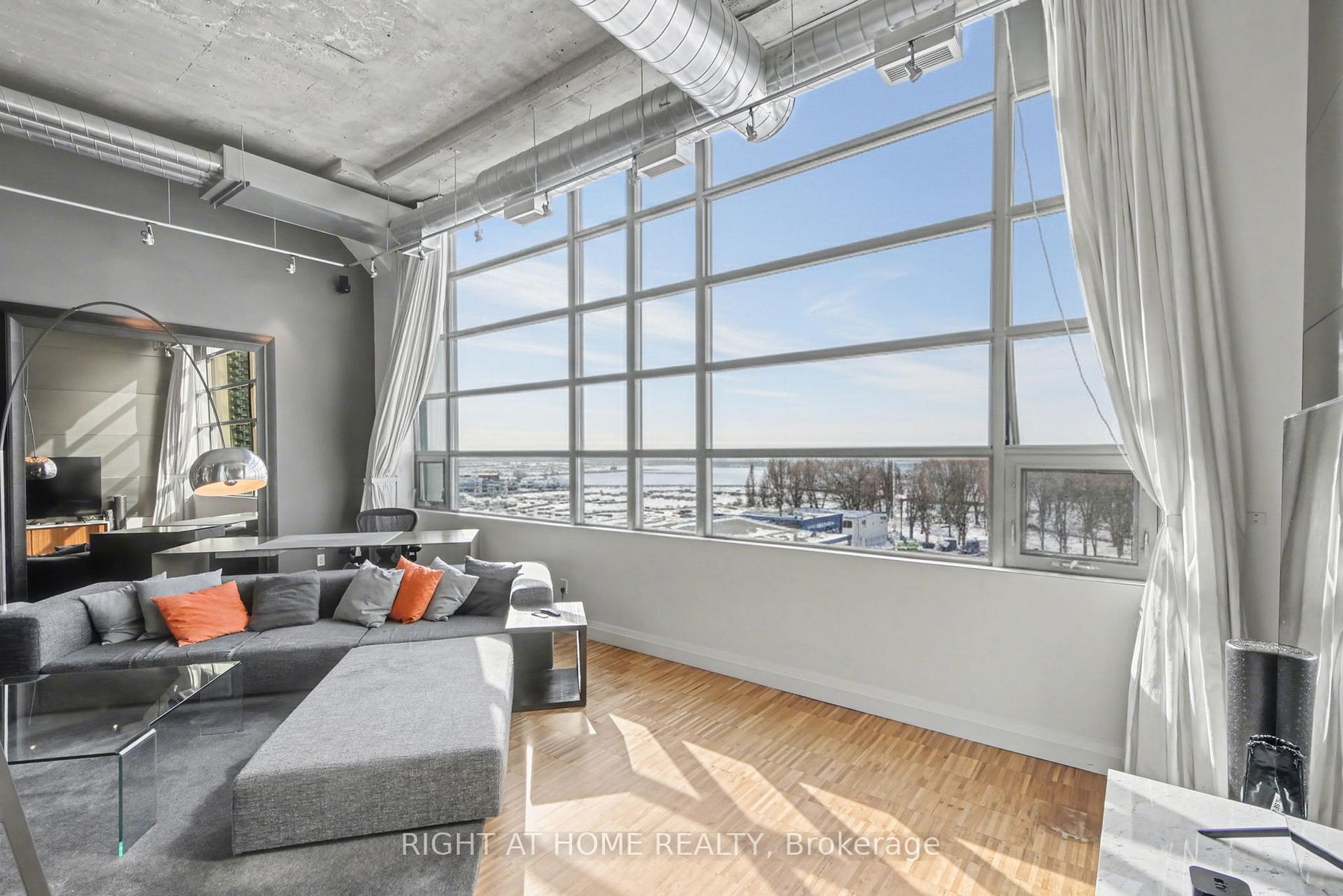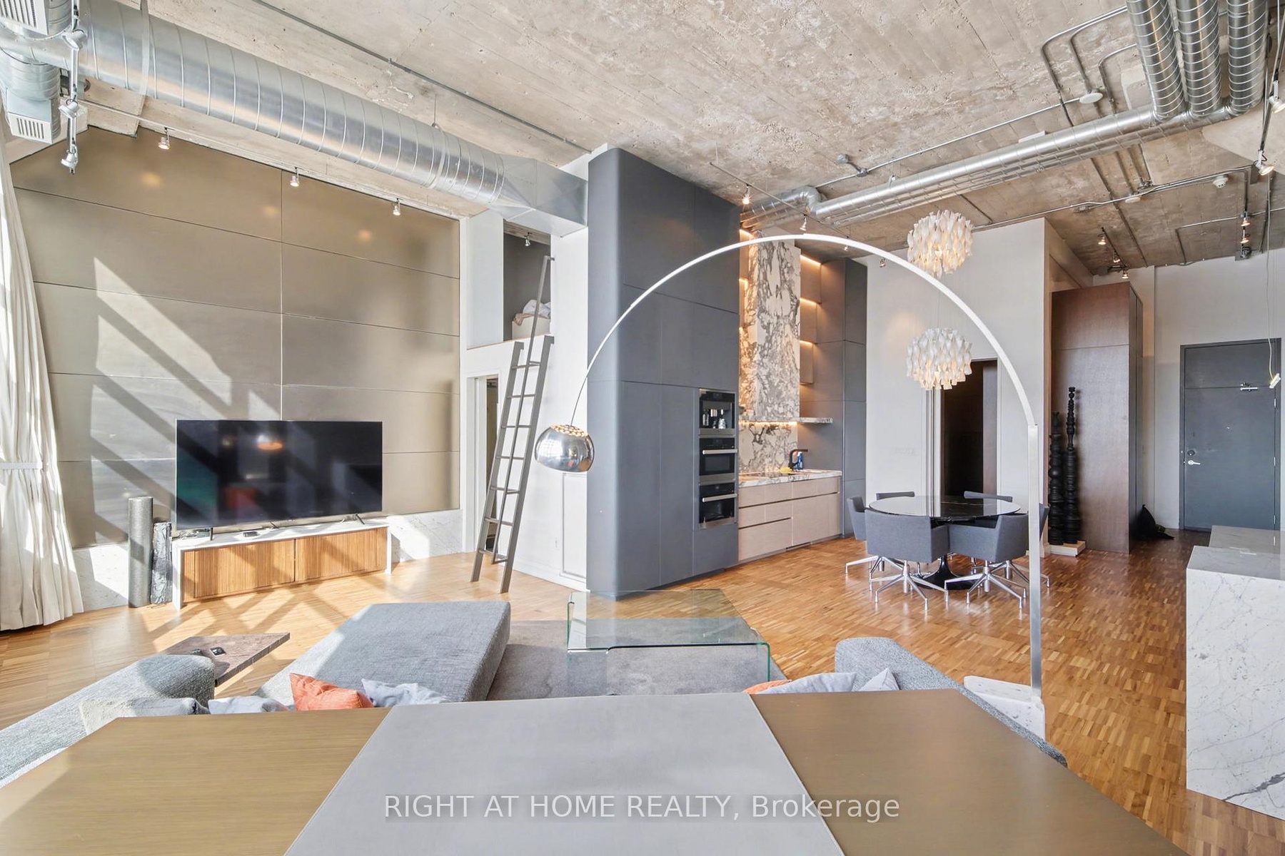 Original hard loft in the Tip Top Tailor Building featuring authentic concrete pillars and exposed concrete ceilings. This southwest-facing suite, previously featured in Canadian Interiors magazine, offers unobstructed water views and excellent natural light.The unit includes marble countertops throughout, hardwood floors, air conditioning, a queen-size bed, and is offered fully furnished with designer pieces including an Italian Living Divani sectional, marble dining table, custom bronze work desk, and Herman Miller chair. Additional features include Miele appliances (coffee machine, steam oven, speed/microwave oven), wine fridge, 65" Smart TV, Flos Arco floor lamp, stacked washer/dryer, and fibre high-speed Internet. Sculptures by a recognized Canadian artist add a distinctive design element.Enjoy unobstructed views of Coronation Park and a prime Lake Ontario waterfront location with direct access to the Martin Goodman Trail, Coronation Park, Stadium Road Park, Lakeshore Blvd W, and Toronto's downtown core. Steps to restaurants, cafés, bars, transit, and waterfront amenities.Building amenities include a full gym and hot tub on the ground floor. Optional parking with a private EV charging station is available at an additional cost.Hydro, water, and internet are included