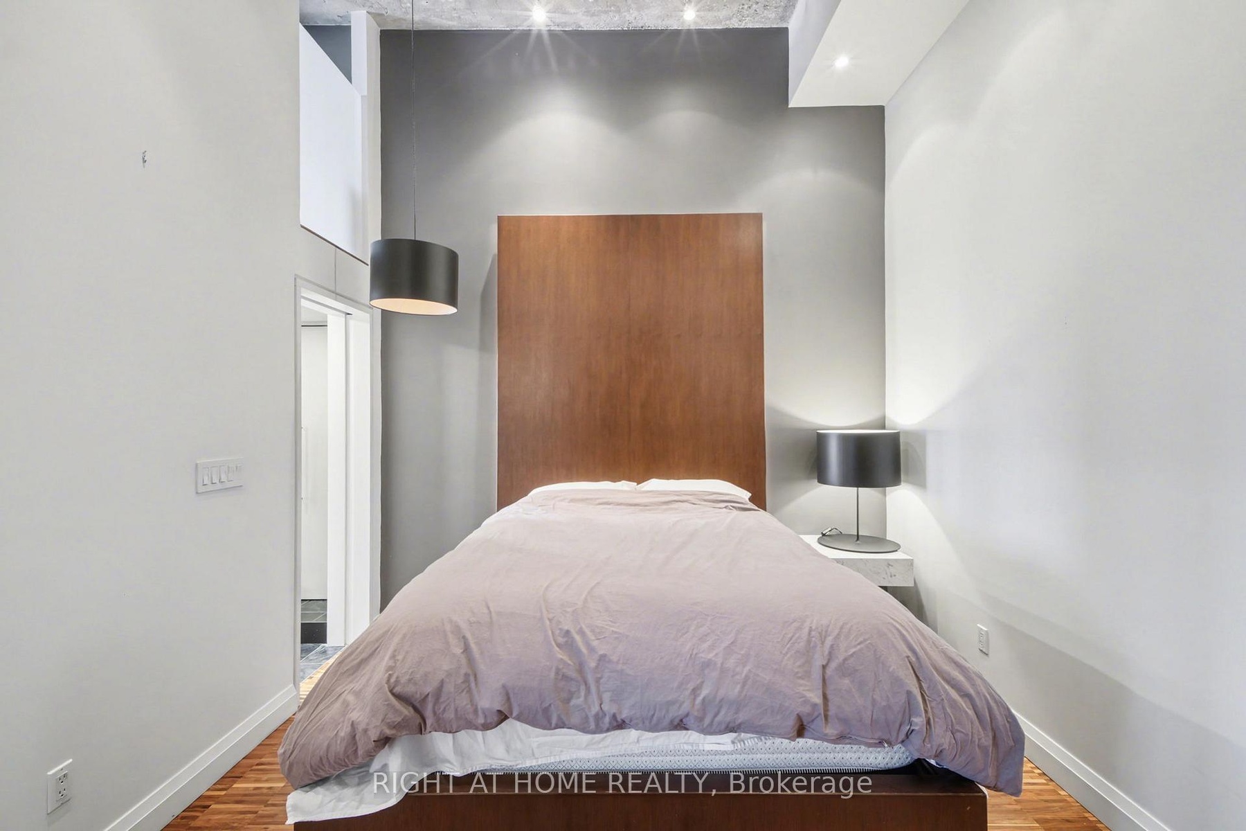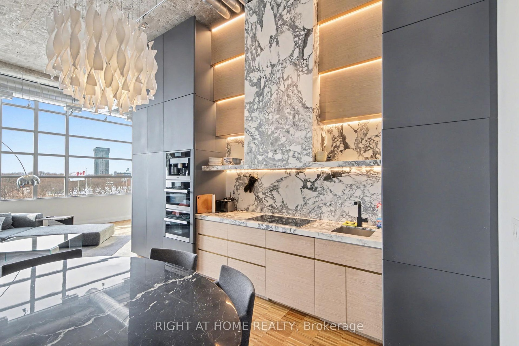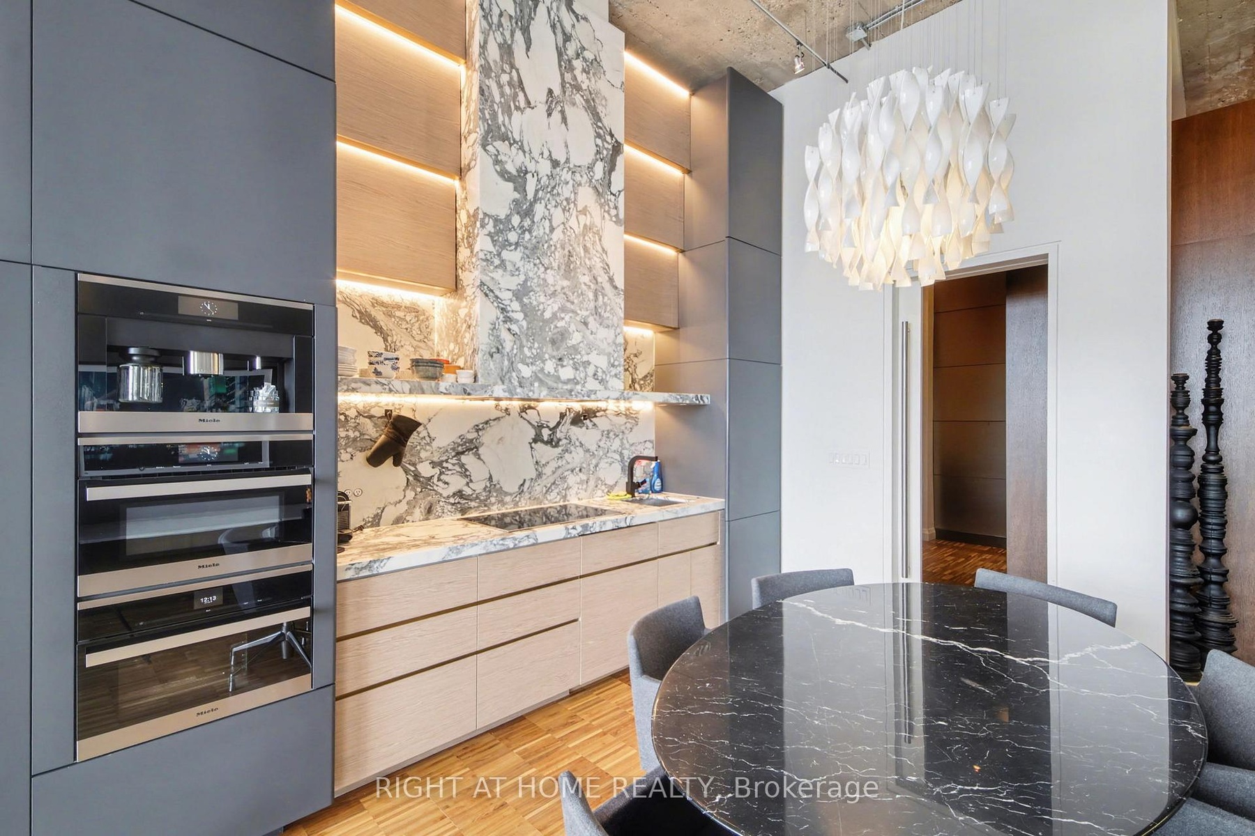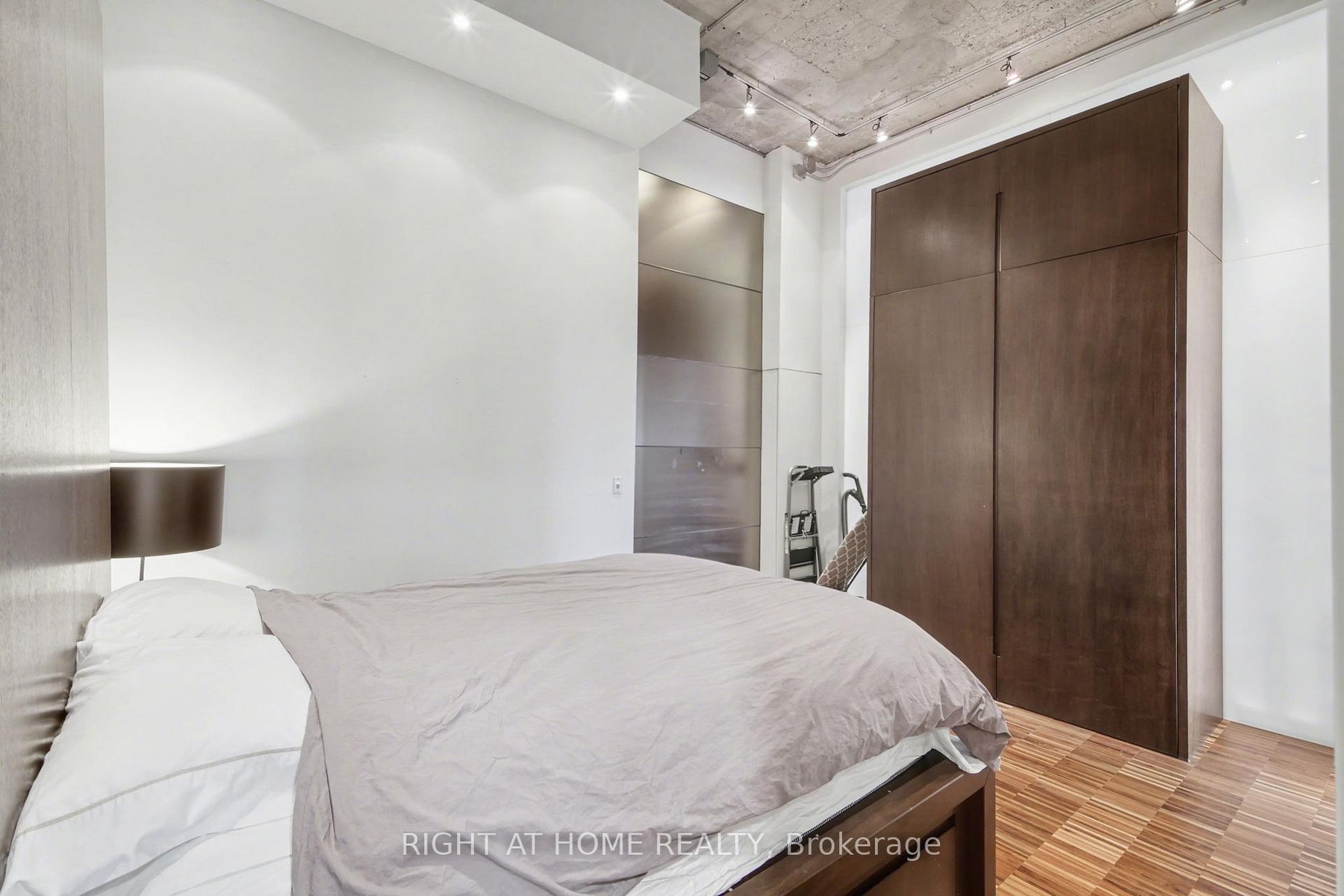 Original hard loft in the Tip Top Tailor Building featuring authentic concrete pillars and exposed concrete ceilings. This southwest-facing suite, previously featured in Canadian Interiors magazine, offers unobstructed water views and excellent natural light.The unit includes marble countertops throughout, hardwood floors, air conditioning, a queen-size bed, and is offered fully furnished with designer pieces including an Italian Living Divani sectional, marble dining table, custom bronze work desk, and Herman Miller chair. Additional features include Miele appliances (coffee machine, steam oven, speed/microwave oven), wine fridge, 65" Smart TV, Flos Arco floor lamp, stacked washer/dryer, and fibre high-speed Internet. Sculptures by a recognized Canadian artist add a distinctive design element.Enjoy unobstructed views of Coronation Park and a prime Lake Ontario waterfront location with direct access to the Martin Goodman Trail, Coronation Park, Stadium Road Park, Lakeshore Blvd W, and Toronto's downtown core. Steps to restaurants, cafés, bars, transit, and waterfront amenities.Building amenities include a full gym and hot tub on the ground floor. Optional parking with a private EV charging station is available at an additional cost.Hydro, water, and internet are included
