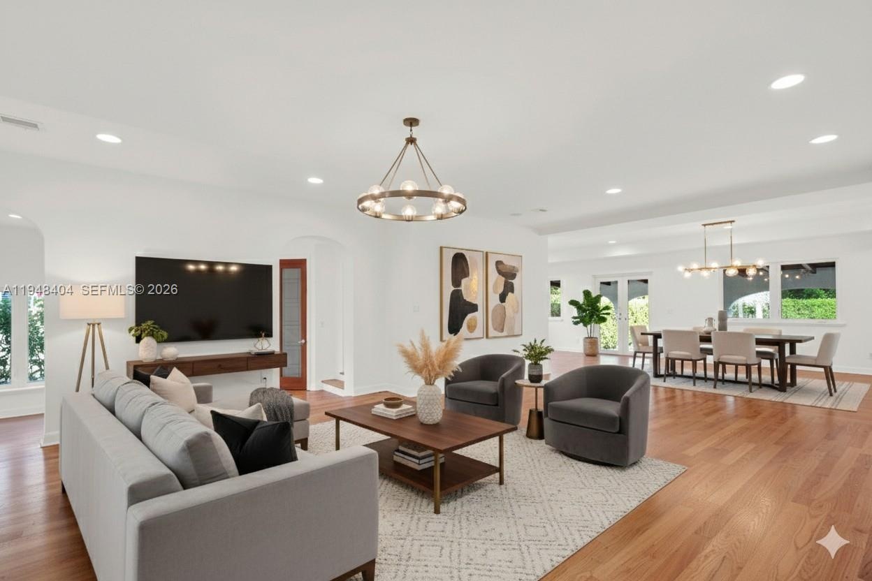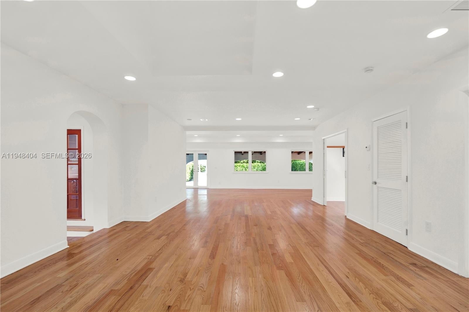 The home, completely remodeled in 2007, welcomes you with a palm-lined paver driveway and timeless Spanish architectural details. Inside, bright and open living areas feature arched walkways, high ceilings, and hardwood floors throughout. Recessed lighting and clean lines provide a contemporary feel while preserving the home’s original character.