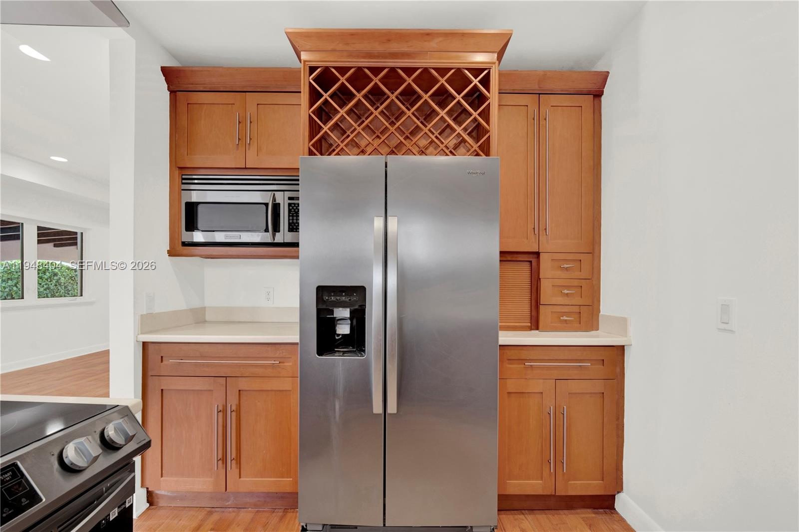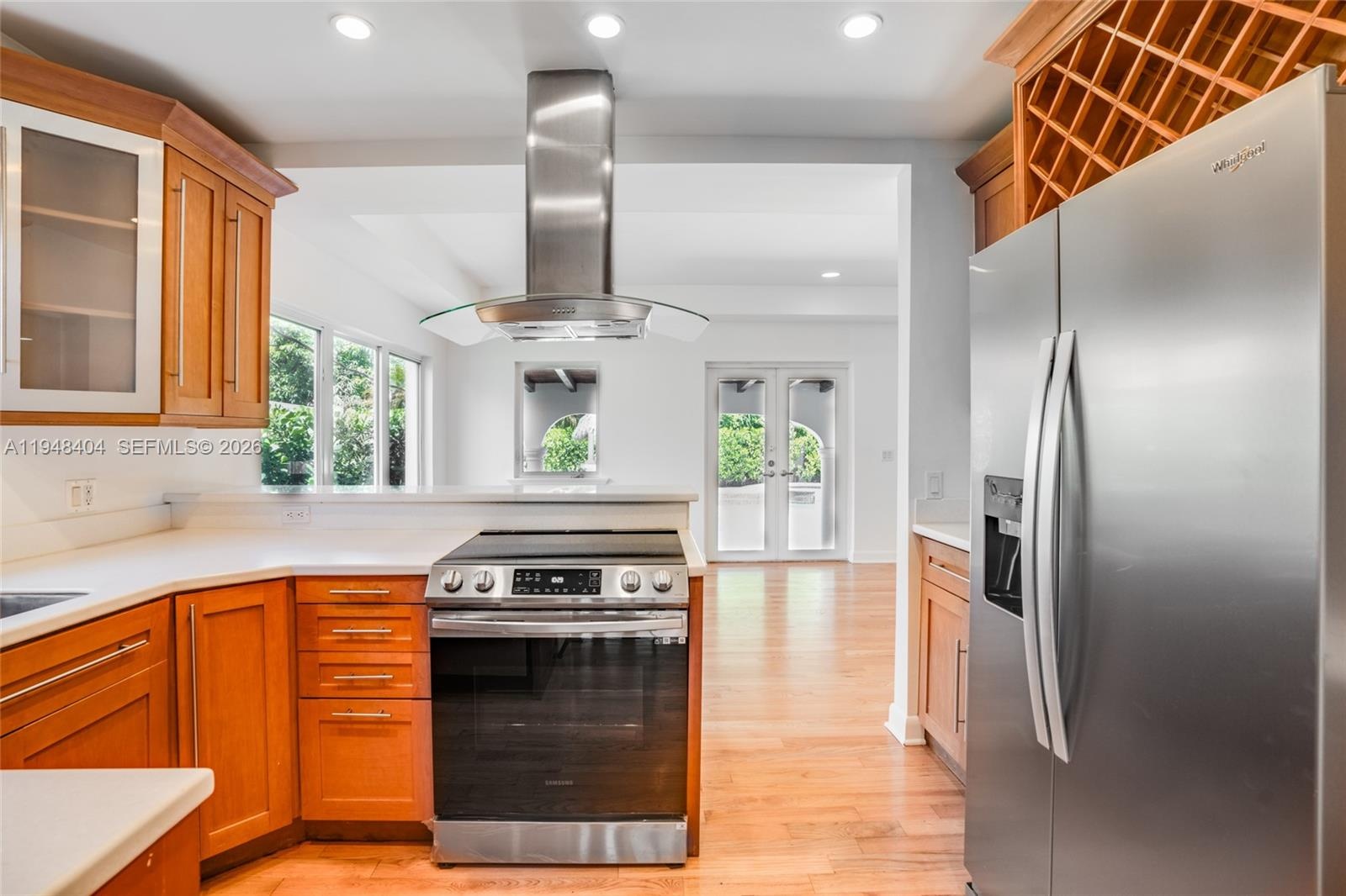 The kitchen offers solid wood cabinetry, stainless steel appliances, and a wide window above the sink that fills the space with natural light. French doors from the main living area open to a covered patio and a spacious backyard complete with a pool, spa, and built-in tiki hut, ideal for entertaining or relaxing at home. Mature hedges create privacy and a lush tropical setting.