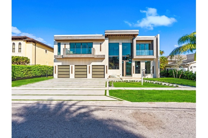 This newly constructed waterfront modern home by Soverns Developers combines luxury with a prime location and a newly constructed 80' seawall. Designed by the award-winning Barretta and Associates, the residence boasts architectural excellence with 5 bedrooms, 5 full bathrooms, and 2 half bathrooms. The main suite offers a private balcony, while the VIP suite ensures ultimate comfort. A tastefully appointed home office and a chef-inspired kitchen with Wolf and Sub-Zero appliances elevate the interior. A 3-stop custom glass elevator connects each floor, leading to a rooftop terrace with breathtaking views. Outside, enjoy a custom pool, spa, and a covered terrace with a built-in summer kitchen, ideal for outdoor entertaining. A 3-car garage adds convenience to this home of pure elegance.