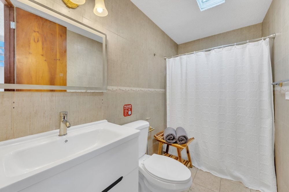 Furnished as shown, the home is move-in ready. Each bedroom includes a queen-size bed. The living room and primary bedroom feature large flat-screen televisions, while dark wood furnishings anchor the dining and living areas. A furnished screened porch is complemented by a large outdoor seating area with ocean views, offering flexibility for additional seating as desired. The outdoor areas are enhanced by mature coconut trees and a sour orange tree, adding shade, greenery, and a natural island touch to the property.