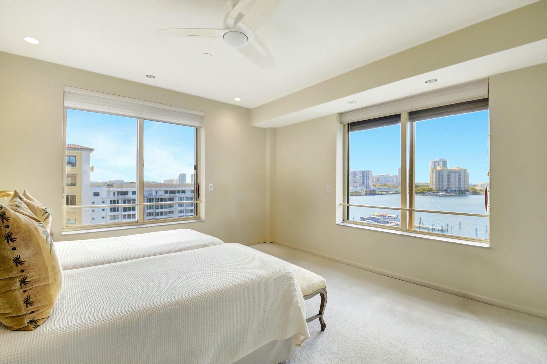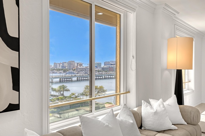 Beautifully refreshed, this spacious 2-bedroom residence (easily convertible to a 3rd bedroom) at the iconic Palm Beach Biltmore offers over 1,800 sq ft of light-filled living. New impact windows, upgraded lighting, fresh paint, and polished tile floors create a clean, modern feel. Southern exposure fills the home with natural light and showcases sweeping Intracoastal, city, and garden views. The open living, dining, and kitchen areas are ideal for entertaining. The generous primary suite enjoys serene direct water and sunset views, while a flexible layout allows for either an expanded living space or a third bedroom. Residents enjoy premier amenities in a full-service building, including a private oceanfront beach club, Olympic-size pool, tennis courts and fitness center. Pet friendly too