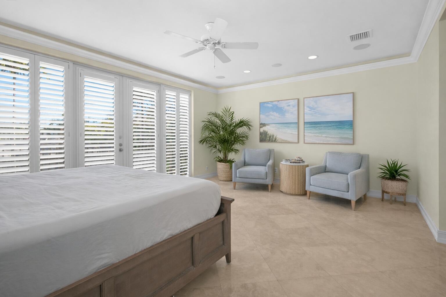 The spacious primary suite features a private balcony and a spa-style bathroom with dual sinks, a separate whirlpool tub, and a walk-in shower. The third floor functions as its own private suite, complete with a bedroom, full bathroom, kitchenette, and direct access to the expansive rooftop terrace, ideal for entertaining or relaxing.