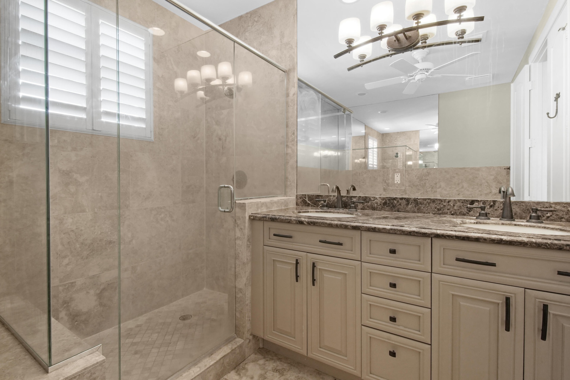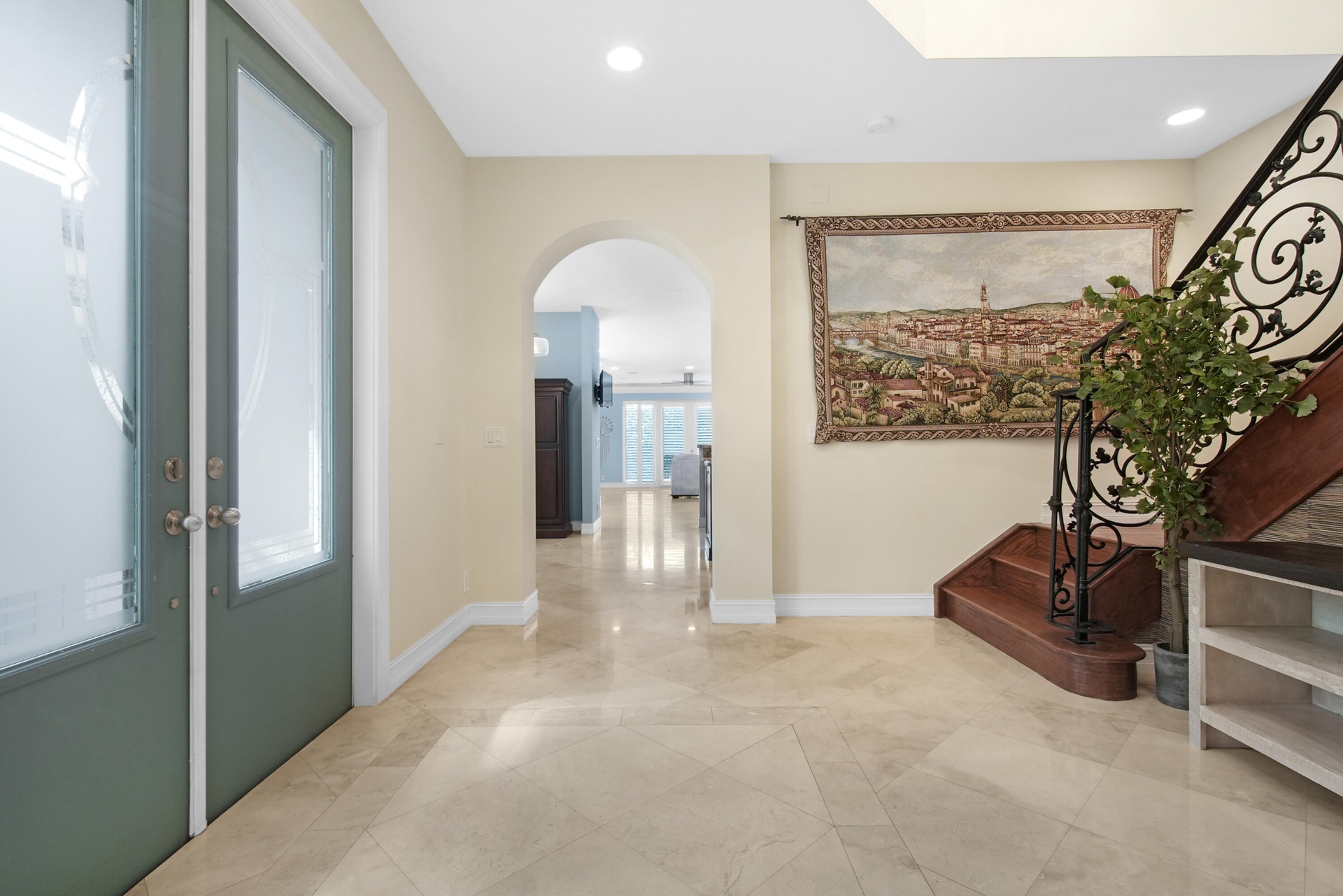 Additional features include plantation shutters throughout, custom molding with integrated lighting on the first floor, a whole-house central vacuum system, and a tankless water heater.