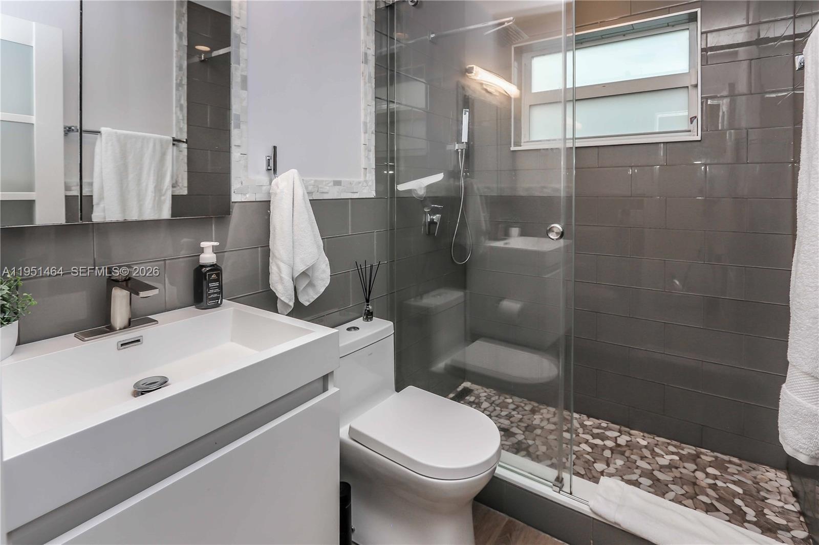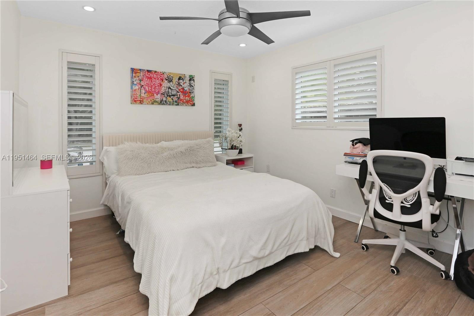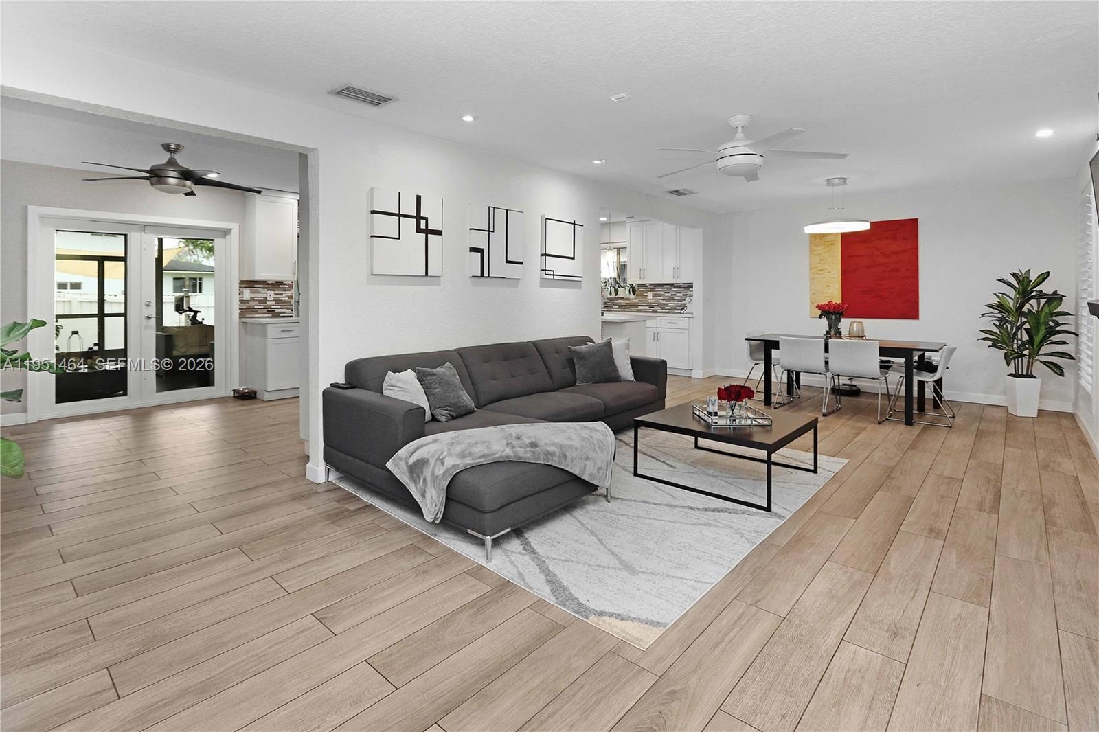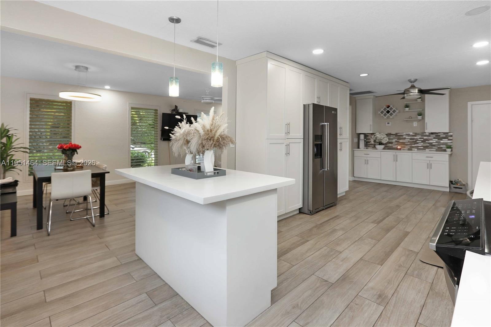 Beautifully updated 3-bedroom, 2-bath home with an additional room, currently used as a 4th bedroom, located in the highly desirable Hollywood Lakes neighborhood and directly across from a park. Thoughtfully designed with a split floor plan, this home features a spacious living and dining room combination that flows seamlessly into the open kitchen—ideal for everyday living and entertaining. The oversized kitchen is a standout, offering a large island with prep area, white shaker cabinetry, white quartz countertops, mosaic tile backsplash, recessed lighting, and an open connection to the formal dining space. Additional highlights include impact windows and doors, plantation shutters, newer custom interior doors, a glass front door entry, tankless water heater, and a spacious laundry room. The primary suite boasts a large closet with a glass panel door and a modern bath with floating vanity and glass-enclosed shower. A secondary bathroom features glass tile, stone flooring, a floating sink, and a glass shower enclosure. Step outside to enjoy the oversized covered and screened patio, perfect for entertaining year-round. Completing the home is a grass/paver 2-car driveway and an unbeatable location in one of Hollywood’s most sought-after neighborhoods.