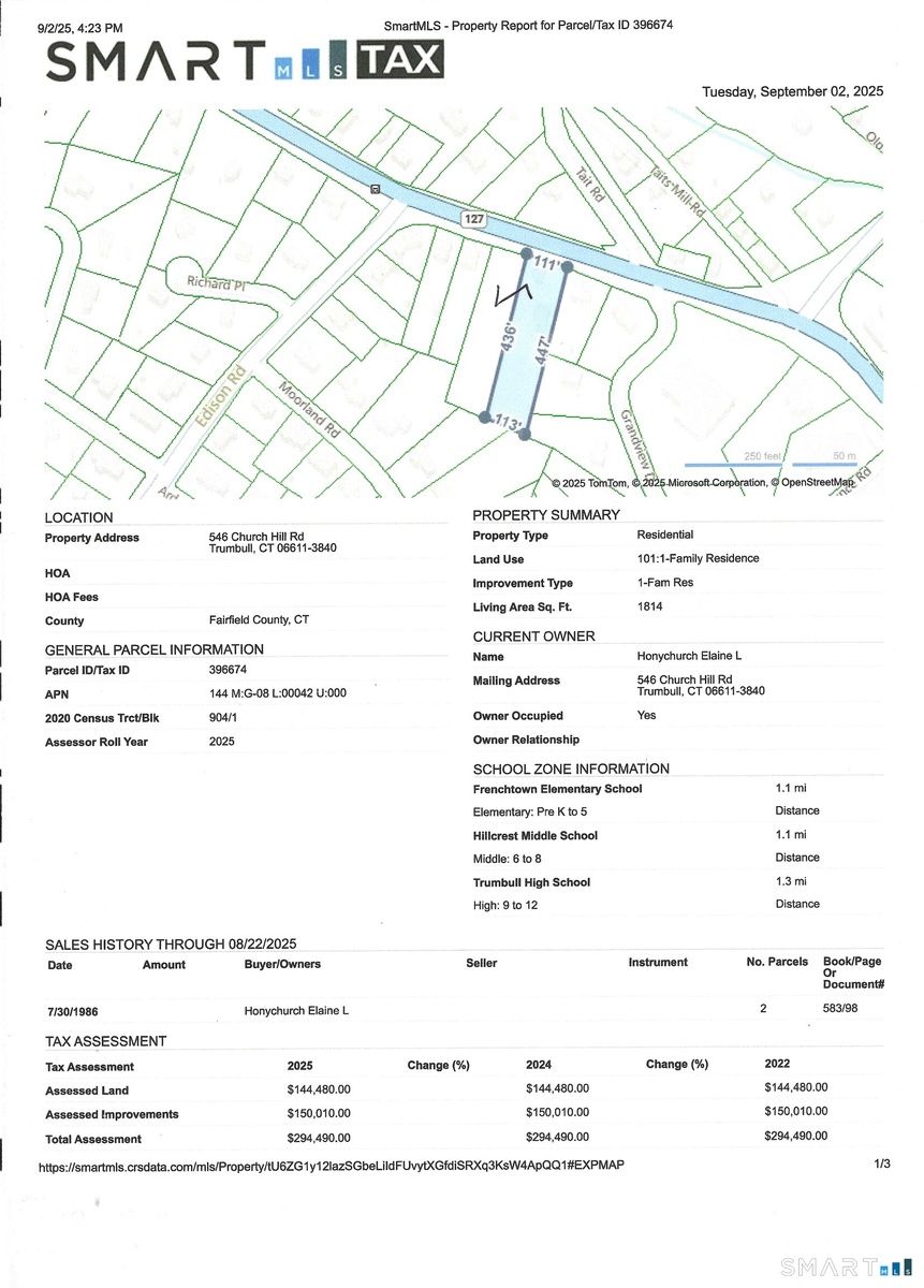 Two adjacent one acre parcels. 546 Church Hill Road and the lot adjacent to the north - does not have a numerical address. Tax parcels 396673 and 396674. #546 has a 1906 well built Colonial - 1814 sq. ft. with 3 bedrooms and 2.5 Baths. Needs some updating. Also on that lot is a solid small dairy barn that is suitable for a garage/workshop/storage/hideaway. Structures hug the left front corner leaving the rest open. This is a residential half acre zone. Keeping the house, there should be at least two more residential lots. Nearly impossible to find lots in Trumbull anymore so this is a great opportunity. Sale is strictly 'as is'.