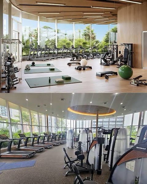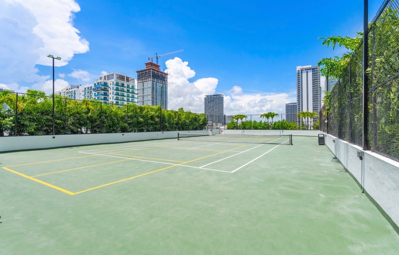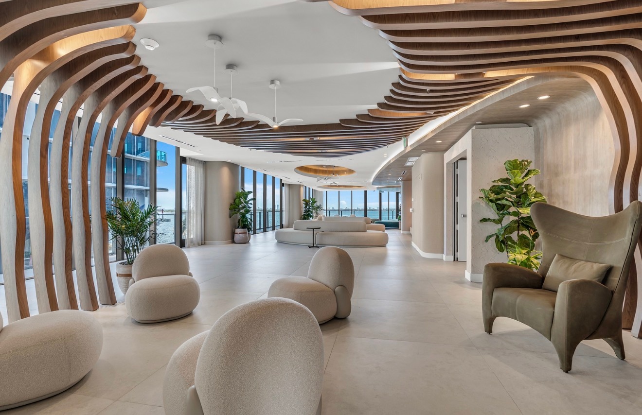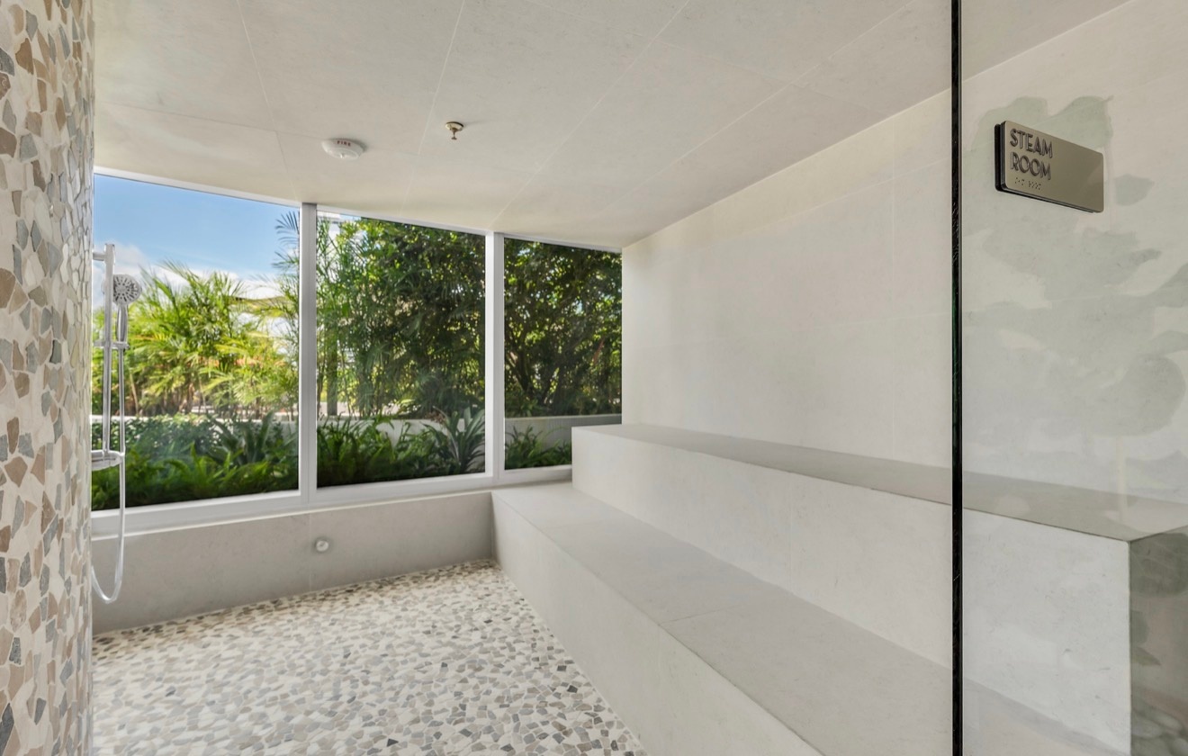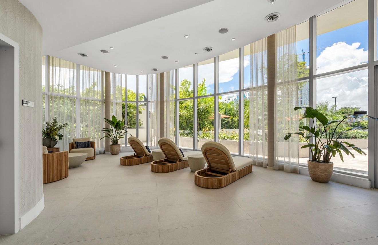 Aria Reserve is truly an urban country club, delivering one of the most comprehensive amenity experiences in Miami luxury living. Residents enjoy resort-style pools overlooking the bay, private cabanas, tennis and padel courts, a full-size basketball court, and expansive landscaped outdoor spaces. The wellness offering rivals that of a five-star resort, featuring a spa with sauna and steam rooms, cold plunge, meditation spaces, and a state-of-the-art fitness center equipped for both performance training and daily wellness. Additional amenities include co-working lounges, private entertainment spaces, and social areas designed to elevate everyday living.