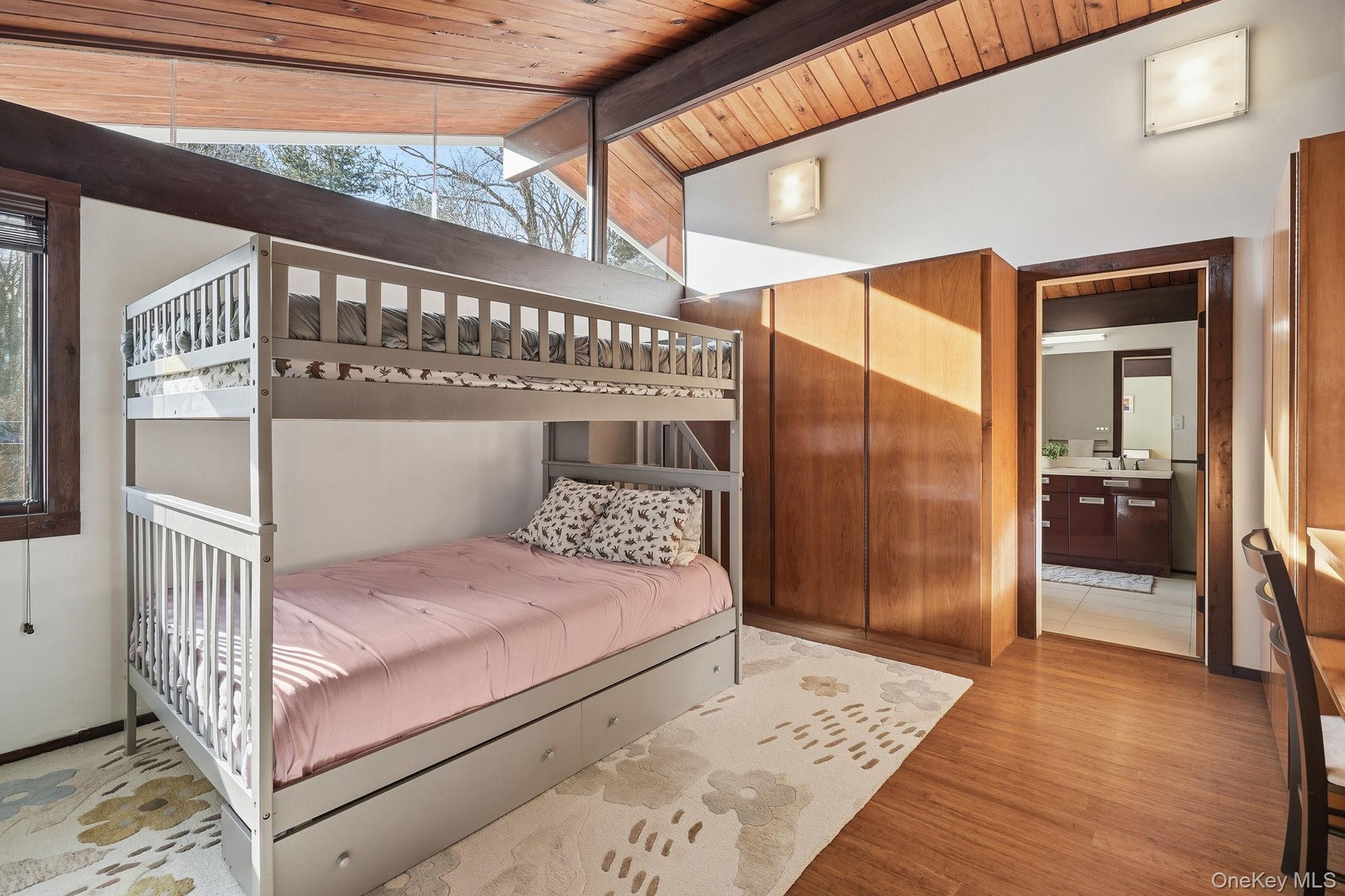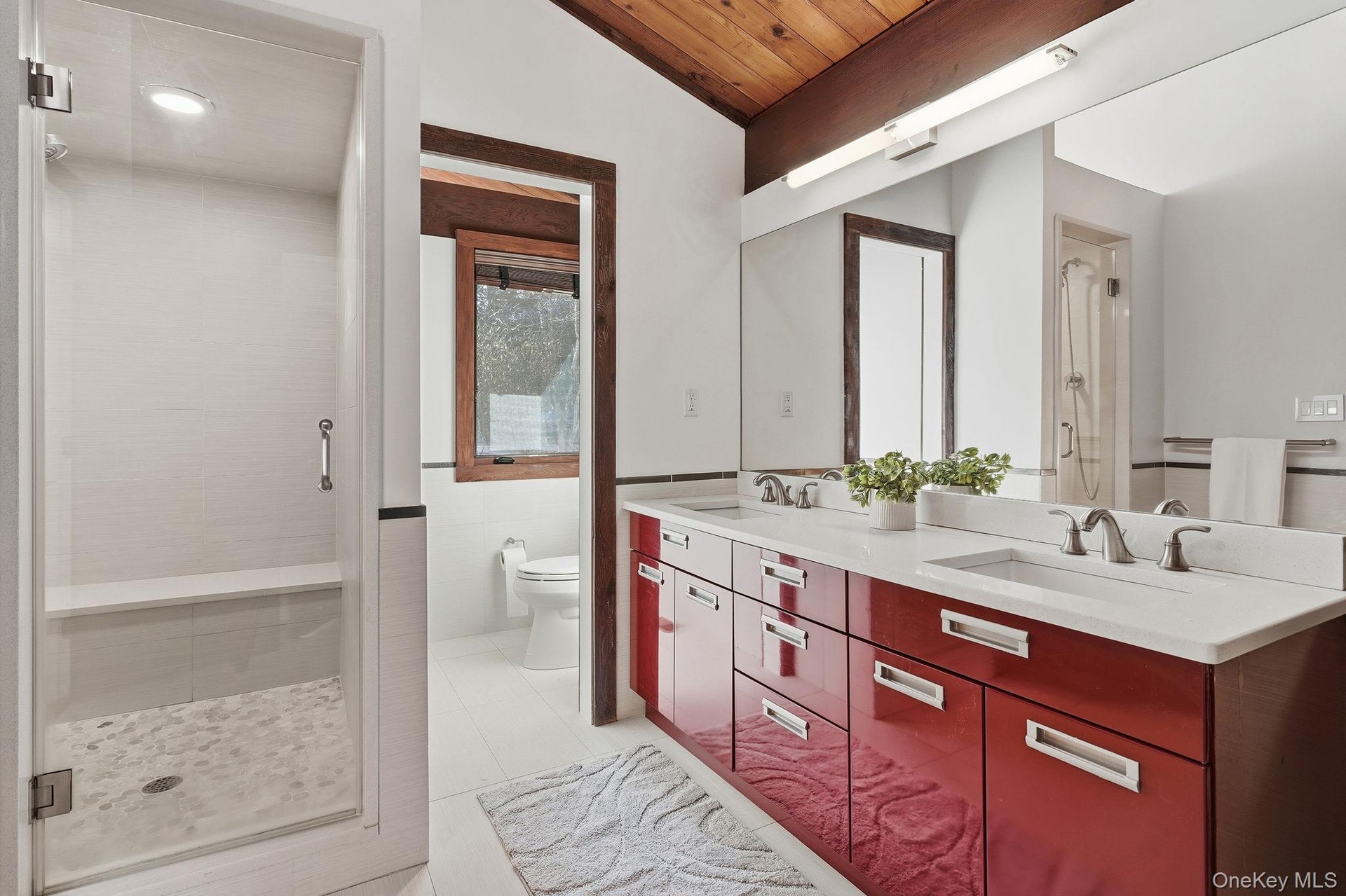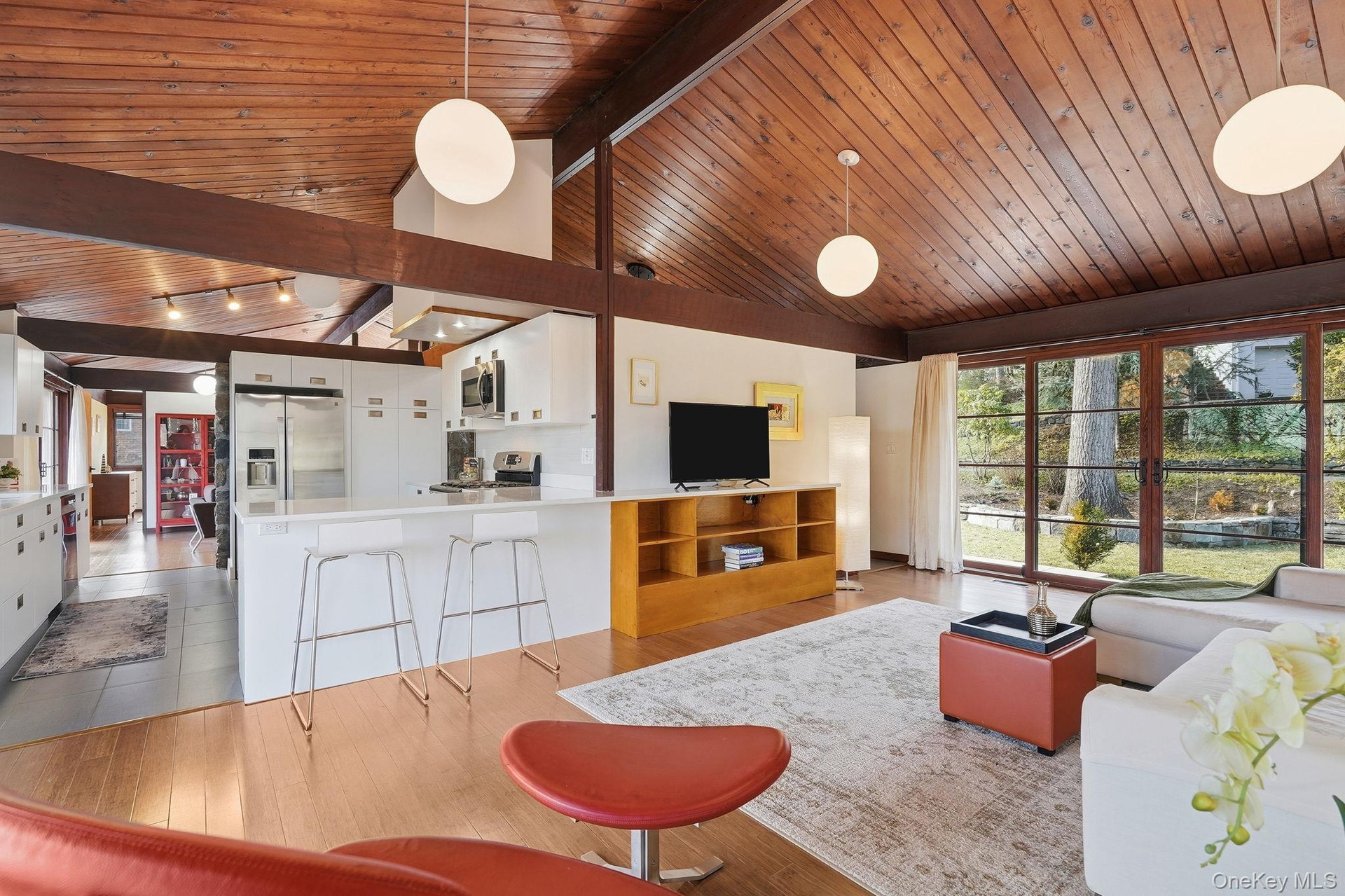 The spacious first floor features an updated kitchen, two living spaces, two large bedrooms with en-suite bathrooms, and a convenient powder room - with finishes including a curated palette of quartz, stainless steel, lacquered surfaces, and bamboo flooring. A statement stone fireplace anchors the main living space, creating a warm yet modern focal point. The expansive floor-to-ceiling glass doors on both the front and back blur the line between indoors and out, flooding the home with natural light and framing tranquil woodland views. A large deck, accessible from both living rooms and overlooking the woods, extends the experience outdoors and makes entertaining a breeze.