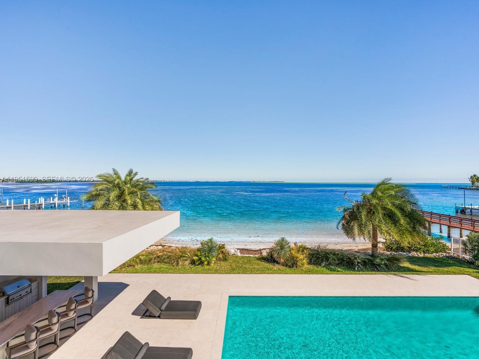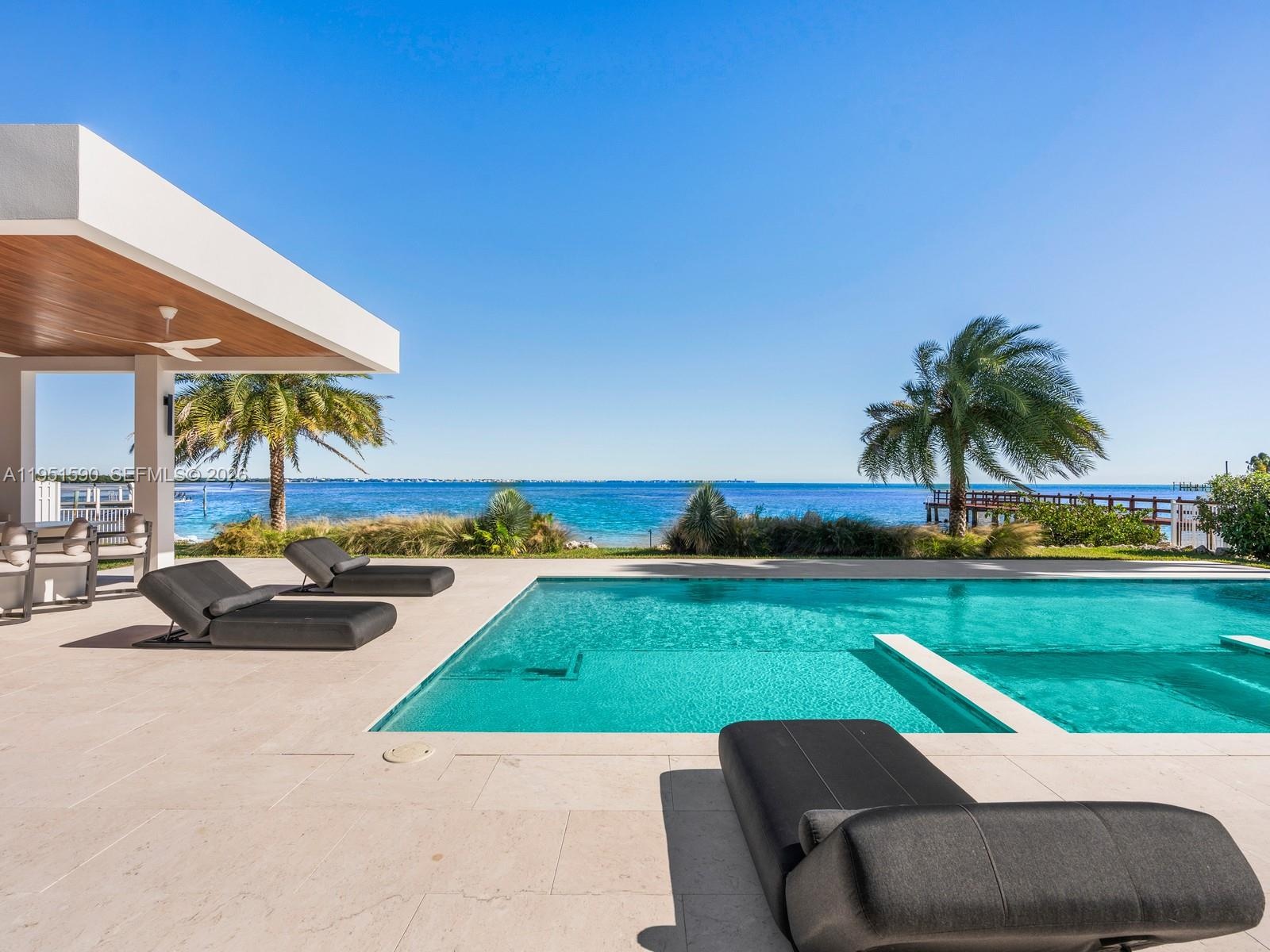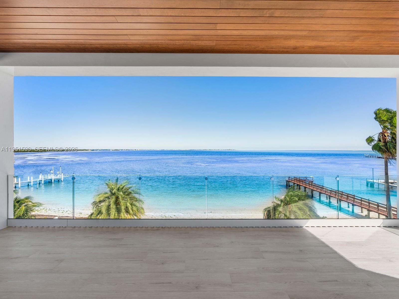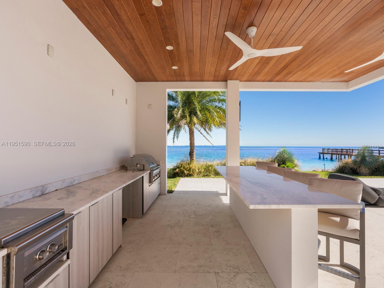 Where every day feels like a five-star vacation. At first glance, the home captivates with its contemporary exterior, natural landscaping, circular driveway, and a jaw-dropping front entrance that feels more like a private resort than a residence. Inside, nearly every space is wrapped in ocean views and natural light. The sun-filled living room features dramatic accordion glass doors that open to a balcony overlooking the backyard, pool, and endless blue horizon. It’s a space where mornings feel peaceful and evenings melt into golden sunsets. The kitchen is both beautiful and functional, designed for gathering. Crisp white cabinetry, stunning stone counters, high-end stainless appliances, and a large waterfall island make it perfect for everything from casual breakfasts to entertaining.