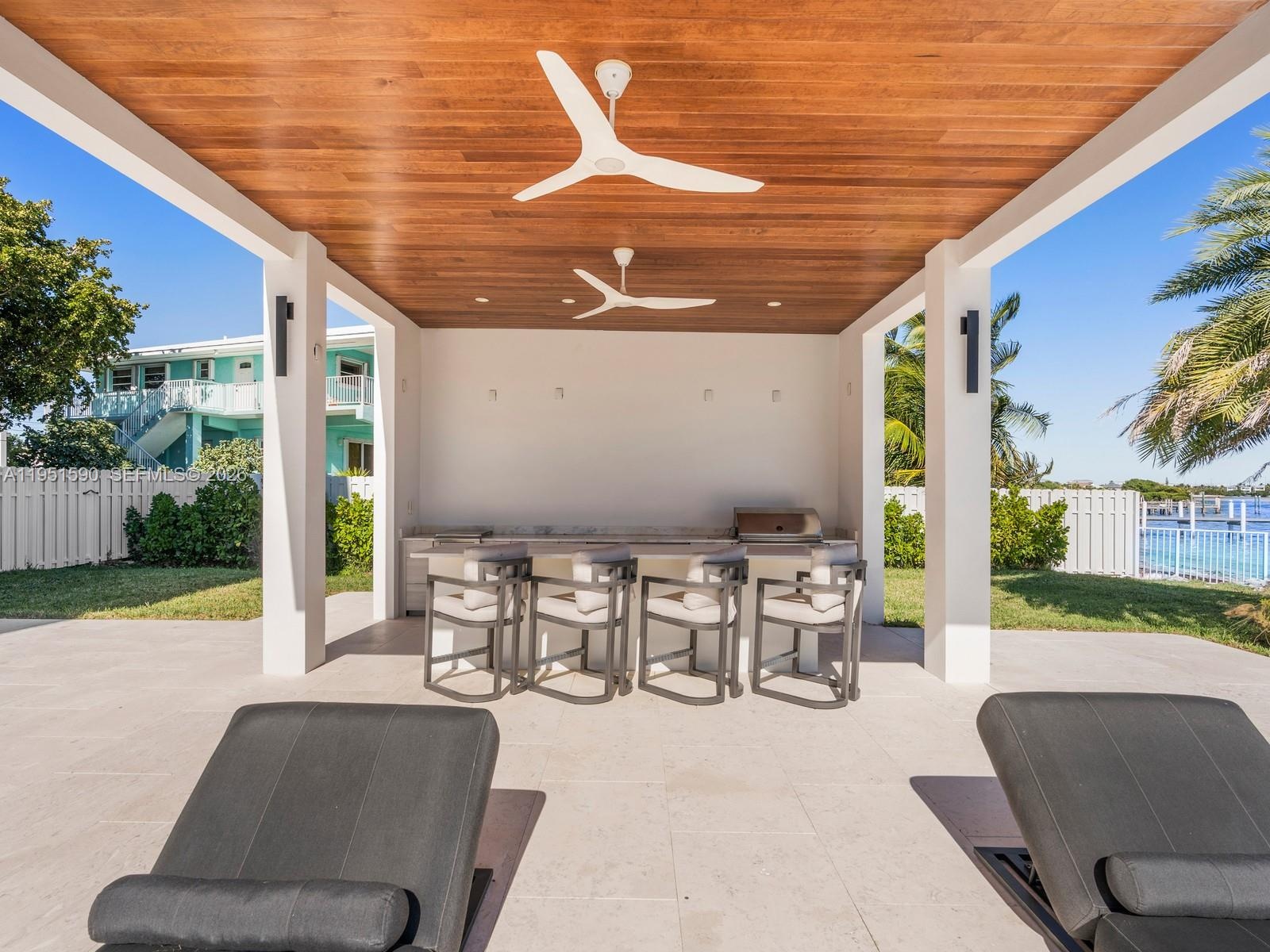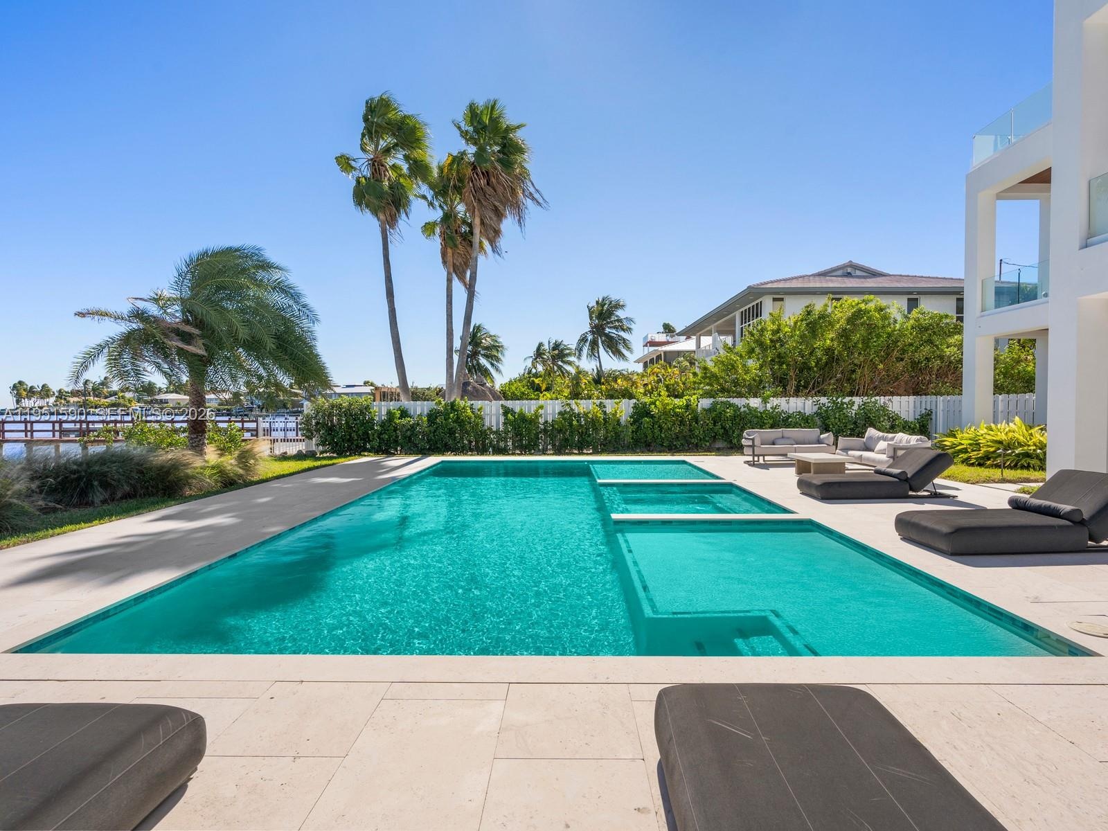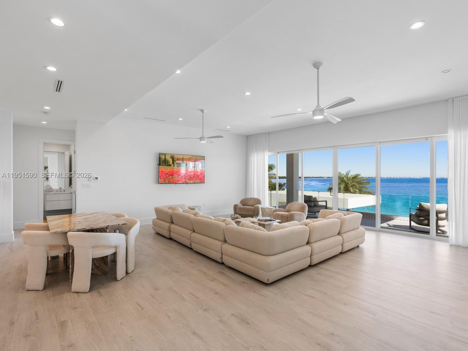 Where every day feels like a five-star vacation. At first glance, the home captivates with its contemporary exterior, natural landscaping, circular driveway, and a jaw-dropping front entrance that feels more like a private resort than a residence. Inside, nearly every space is wrapped in ocean views and natural light. The sun-filled living room features dramatic accordion glass doors that open to a balcony overlooking the backyard, pool, and endless blue horizon. It’s a space where mornings feel peaceful and evenings melt into golden sunsets. The kitchen is both beautiful and functional, designed for gathering. Crisp white cabinetry, stunning stone counters, high-end stainless appliances, and a large waterfall island make it perfect for everything from casual breakfasts to entertaining.