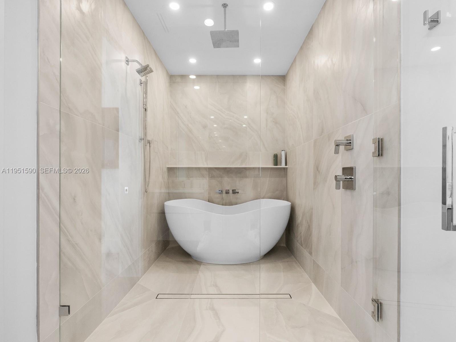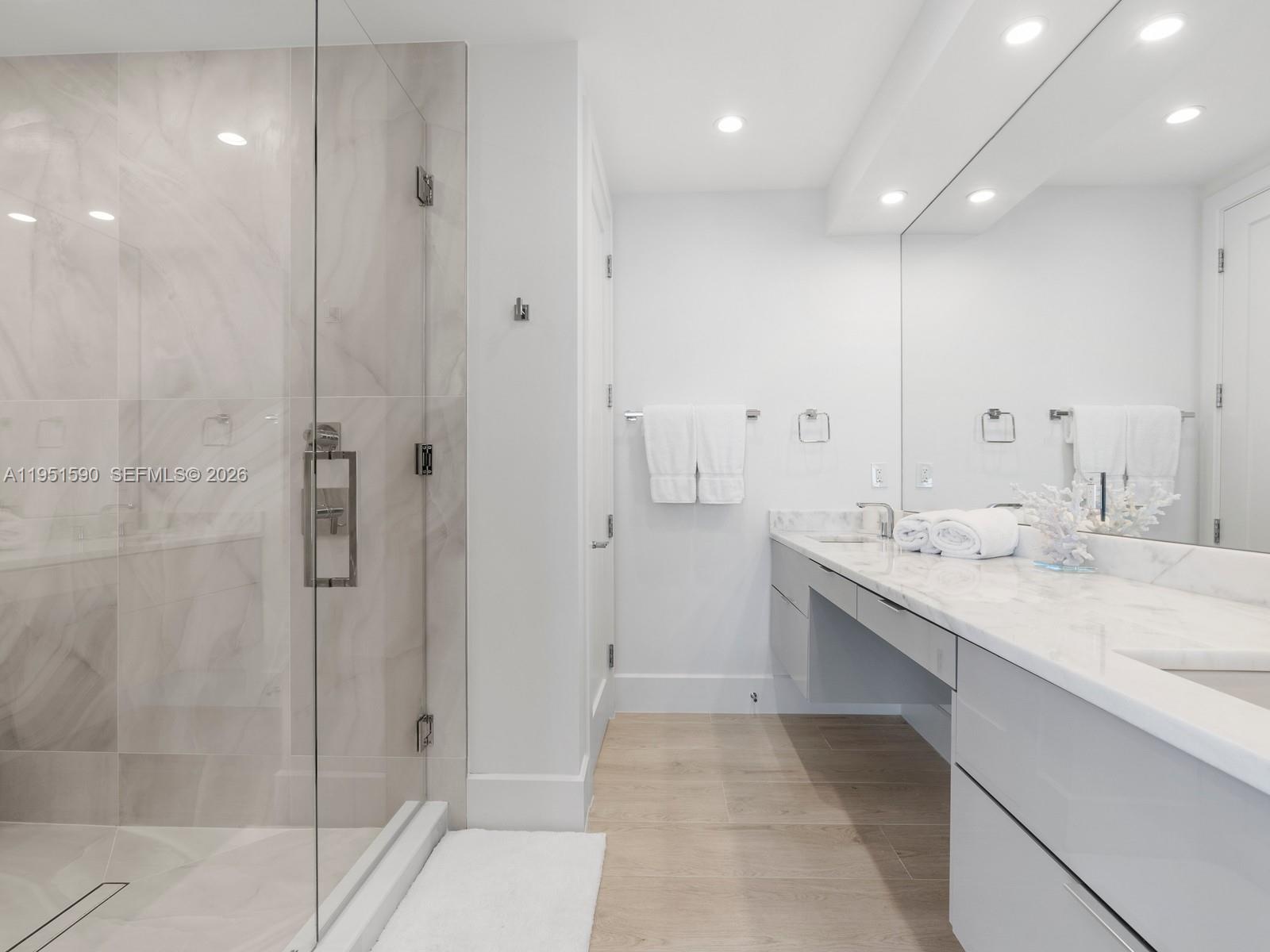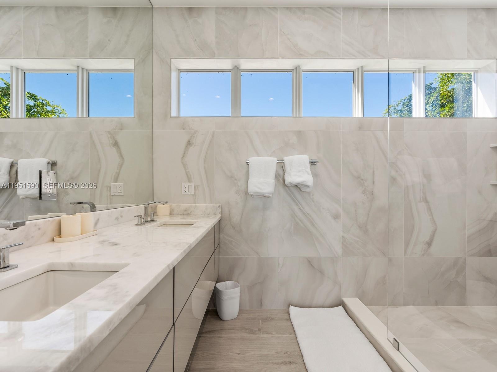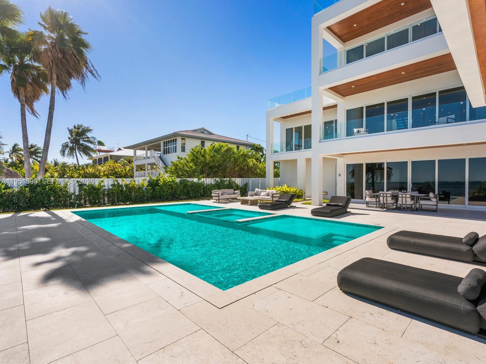 Where every day feels like a five-star vacation. At first glance, the home captivates with its contemporary exterior, natural landscaping, circular driveway, and a jaw-dropping front entrance that feels more like a private resort than a residence. Inside, nearly every space is wrapped in ocean views and natural light. The sun-filled living room features dramatic accordion glass doors that open to a balcony overlooking the backyard, pool, and endless blue horizon. It’s a space where mornings feel peaceful and evenings melt into golden sunsets. The kitchen is both beautiful and functional, designed for gathering. Crisp white cabinetry, stunning stone counters, high-end stainless appliances, and a large waterfall island make it perfect for everything from casual breakfasts to entertaining.