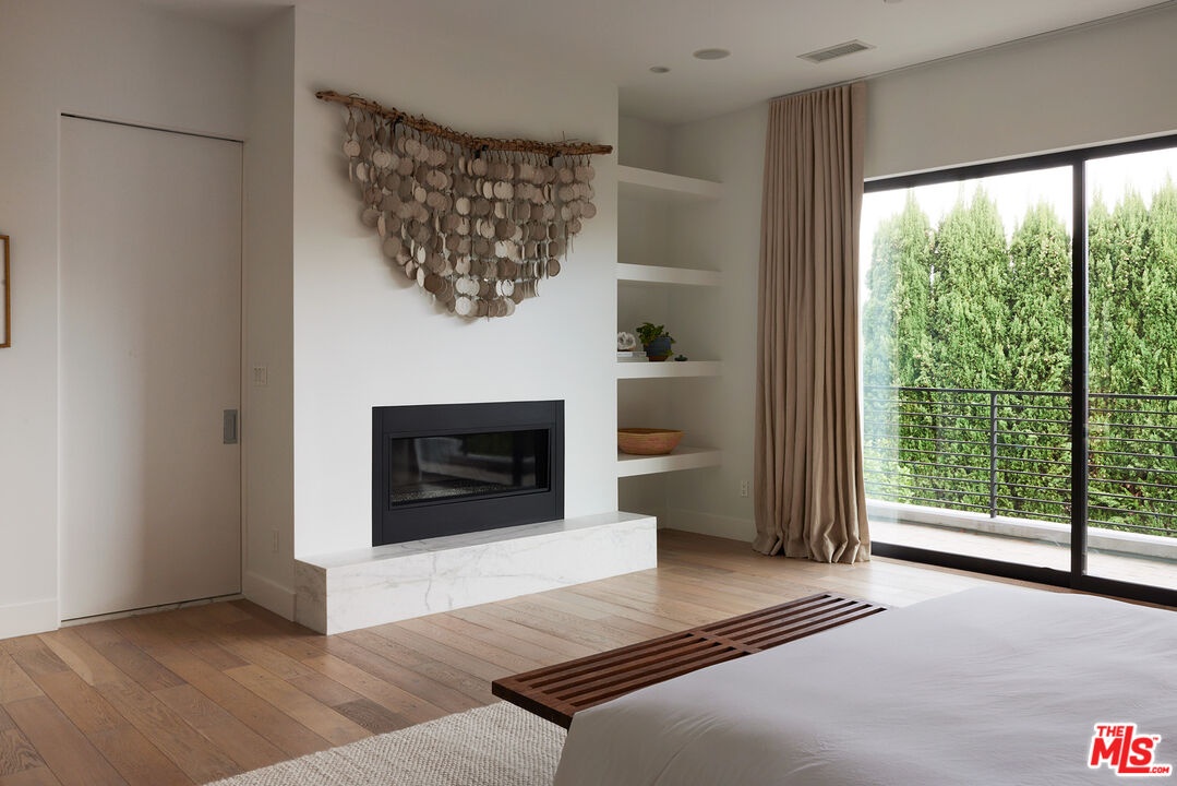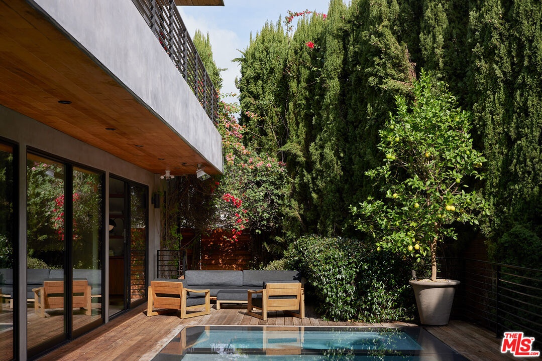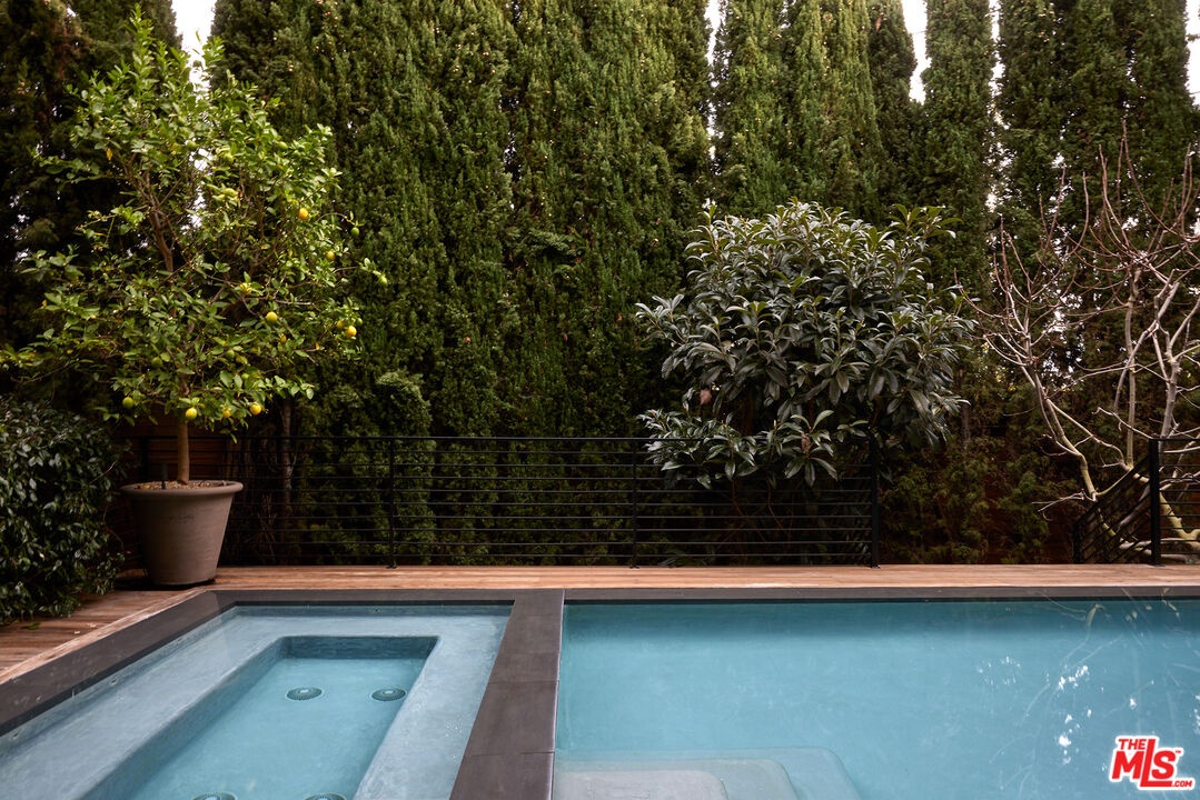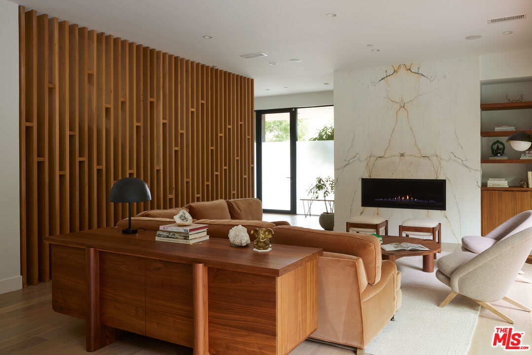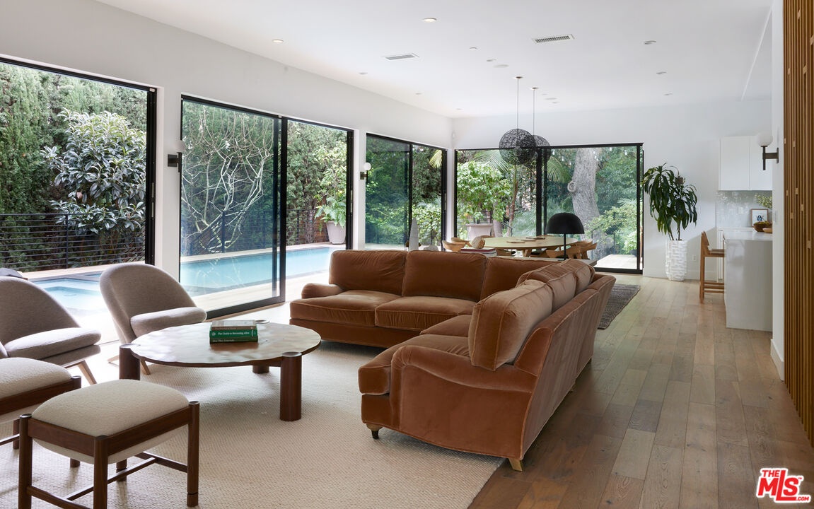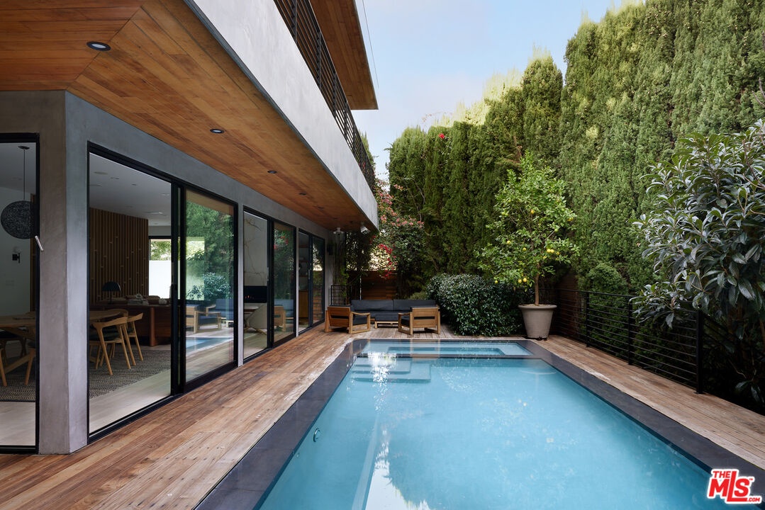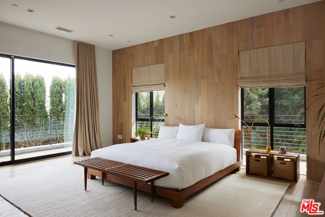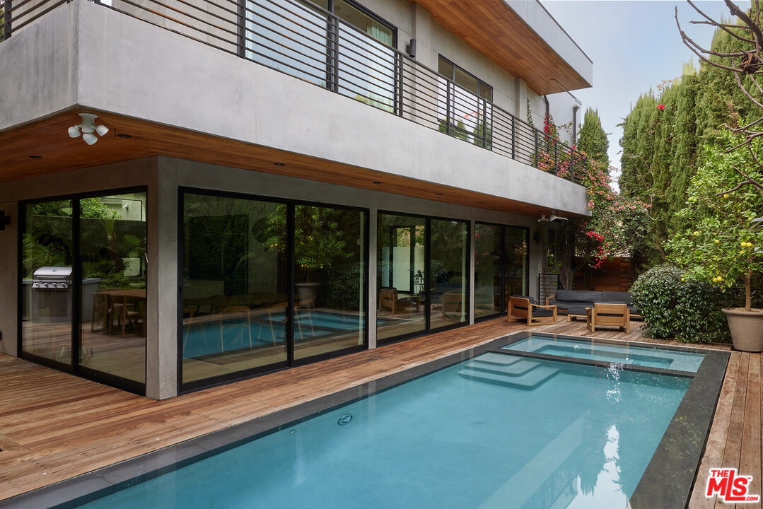 Tucked away at the end of a quiet, tree-lined cul-de-sac, this custom-built sanctuary feels like a private luxury resort designed for refined living. Surrounded by nature and designed with intention, the home envelops you in warmth and tranquility, blending rich natural woods, hand-selected stone, vibrant greenery, and soaring volume. Fleetwood doors and white oak floors dissolve to blend the indoors and out, inviting sunlight, gardens, and gentle breezes into every corner of the main living spaces. The living room, anchored by an oversized Carrera marble fireplace overlooks the sparkling pool and lush grounds, as do the open dining area and the chef's kitchen, an inspired space with a generous center island and walk-in pantry, perfect for both intimate meals and lively gatherings. A peaceful meditation room, striking malachite-inspired powder room, en-suite guest bedroom, and a thoughtfully designed coat and shoe closet complete this level. A floating staircase leads to an upstairs lounge with custom shelving to gather and unwind. The primary suite features a private balcony, fireplace, spacious walk-in closet and spa-like bath with soaking tub positioned with moon and star views. Three additional en-suite bedrooms and laundry room provide comfort and ease for family and guests alike. Relax poolside, lounge in the open-air living room, dine mindfully on the deck, or host intimate gatherings with the built-in grill and refrigerator, all surrounded by mature landscaping and peaceful garden views. Additional features including a security system, a whole-home water filtration system, and electric car charging ensure peace of mind and modern convenience, allowing you to fully embrace the lifestyle this exceptional retreat offers.