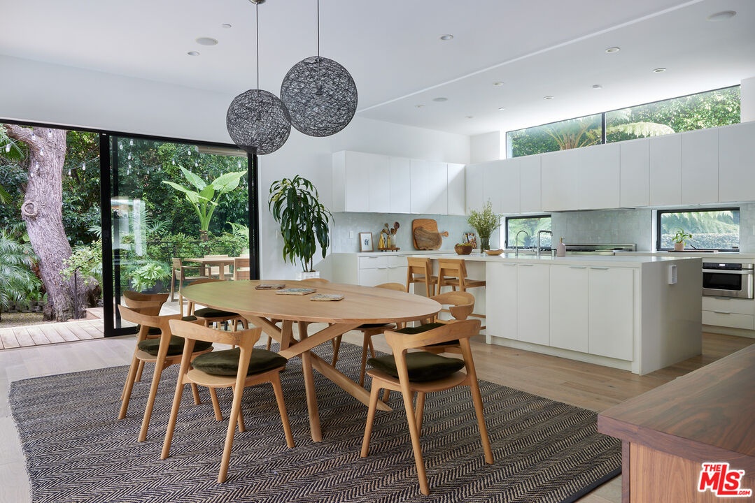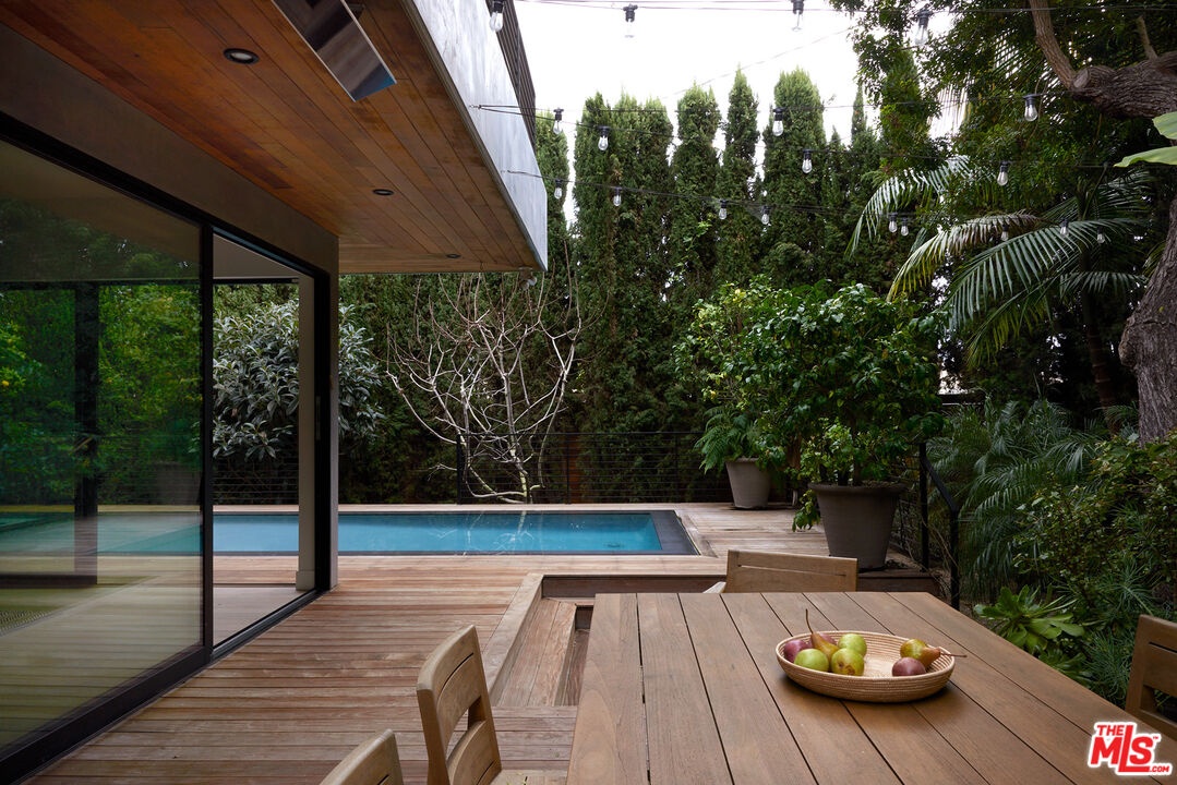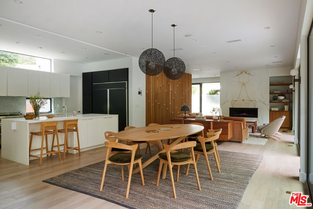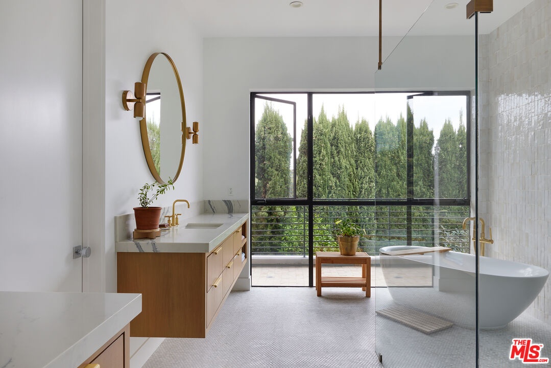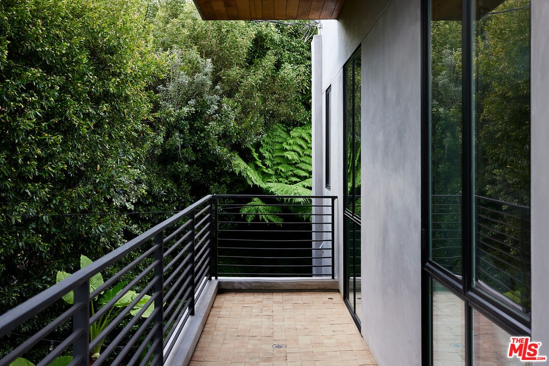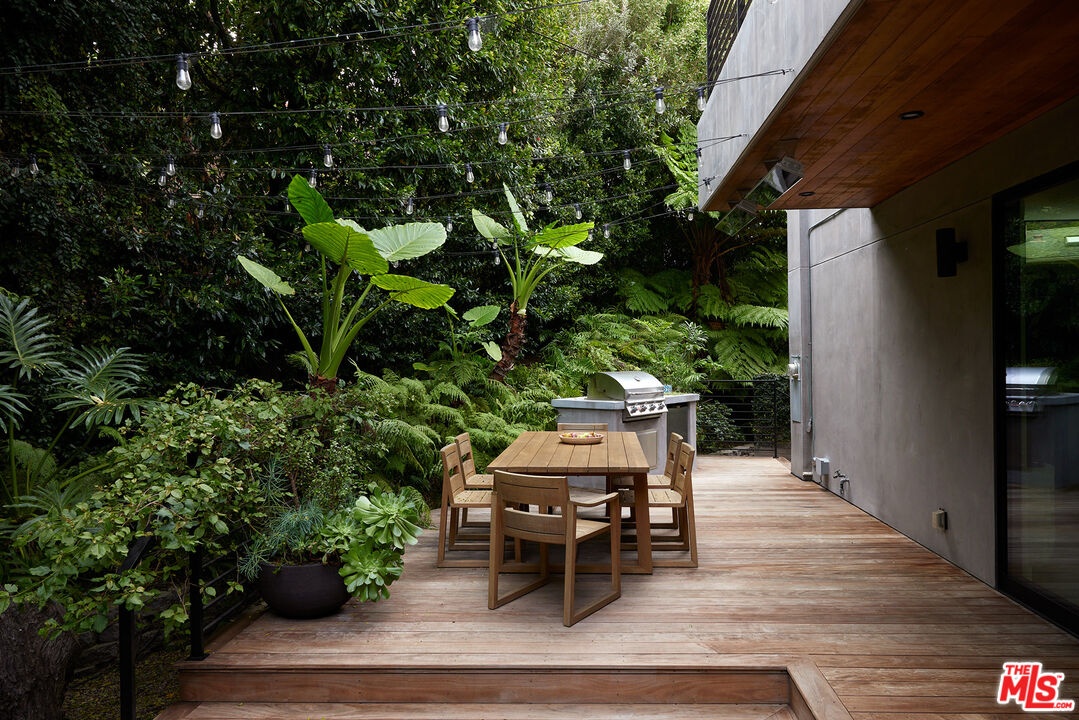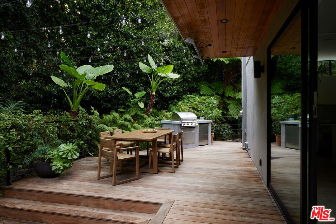 Tucked away at the end of a quiet, tree-lined cul-de-sac, this custom-built sanctuary feels like a private luxury resort designed for refined living. Surrounded by nature and designed with intention, the home envelops you in warmth and tranquility, blending rich natural woods, hand-selected stone, vibrant greenery, and soaring volume. Fleetwood doors and white oak floors dissolve to blend the indoors and out, inviting sunlight, gardens, and gentle breezes into every corner of the main living spaces. The living room, anchored by an oversized Carrera marble fireplace overlooks the sparkling pool and lush grounds, as do the open dining area and the chef's kitchen, an inspired space with a generous center island and walk-in pantry, perfect for both intimate meals and lively gatherings. A peaceful meditation room, striking malachite-inspired powder room, en-suite guest bedroom, and a thoughtfully designed coat and shoe closet complete this level. A floating staircase leads to an upstairs lounge with custom shelving to gather and unwind. The primary suite features a private balcony, fireplace, spacious walk-in closet and spa-like bath with soaking tub positioned with moon and star views. Three additional en-suite bedrooms and laundry room provide comfort and ease for family and guests alike. Relax poolside, lounge in the open-air living room, dine mindfully on the deck, or host intimate gatherings with the built-in grill and refrigerator, all surrounded by mature landscaping and peaceful garden views. Additional features including a security system, a whole-home water filtration system, and electric car charging ensure peace of mind and modern convenience, allowing you to fully embrace the lifestyle this exceptional retreat offers.