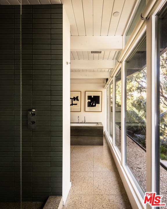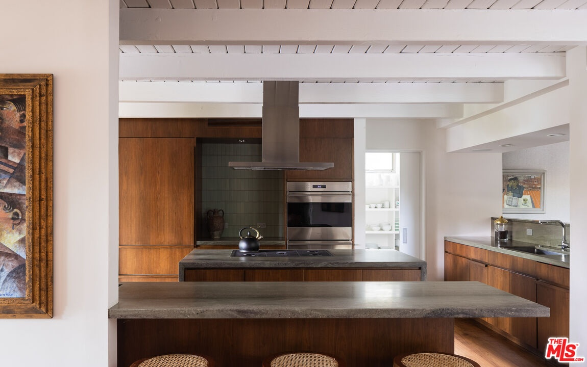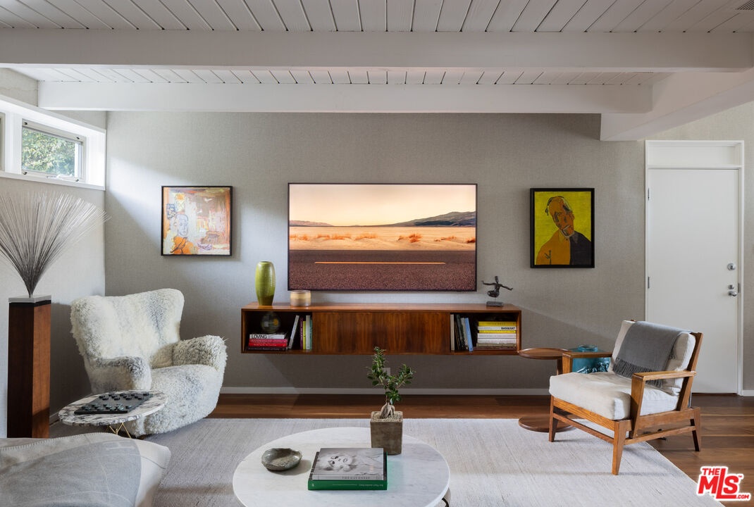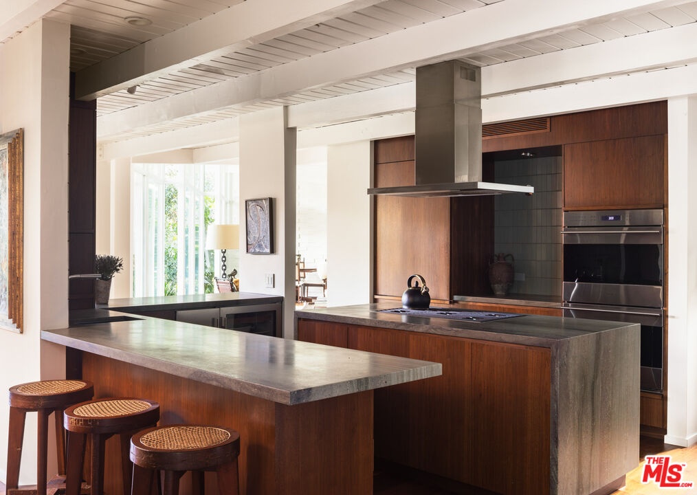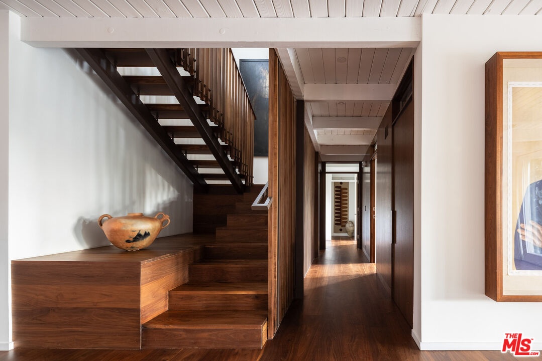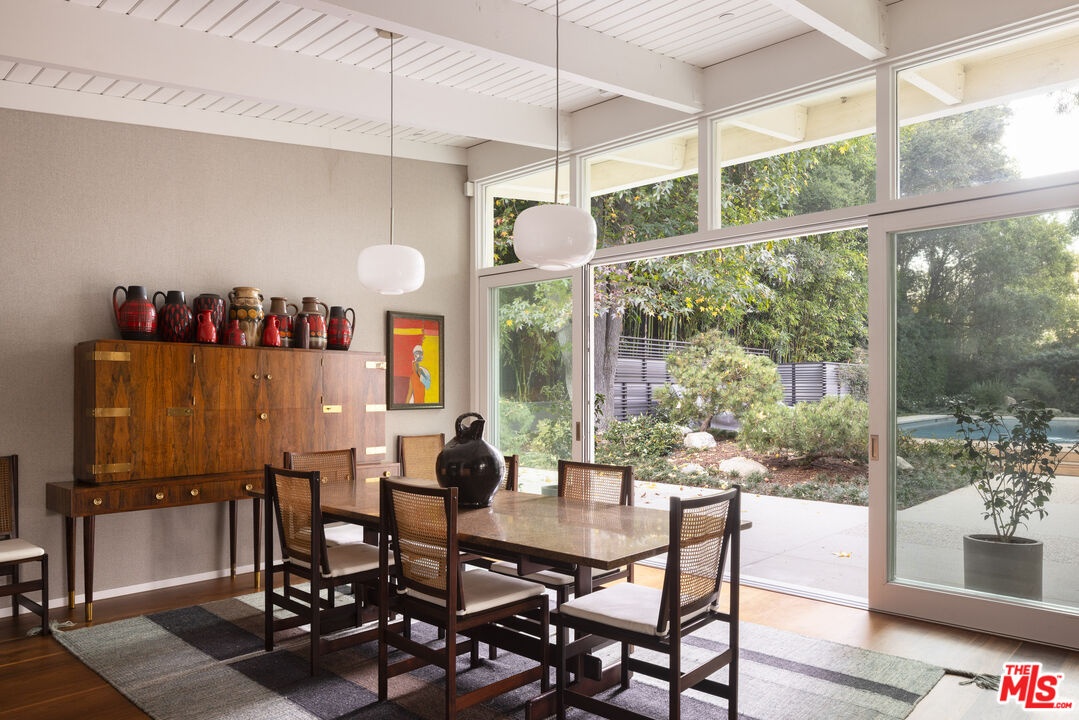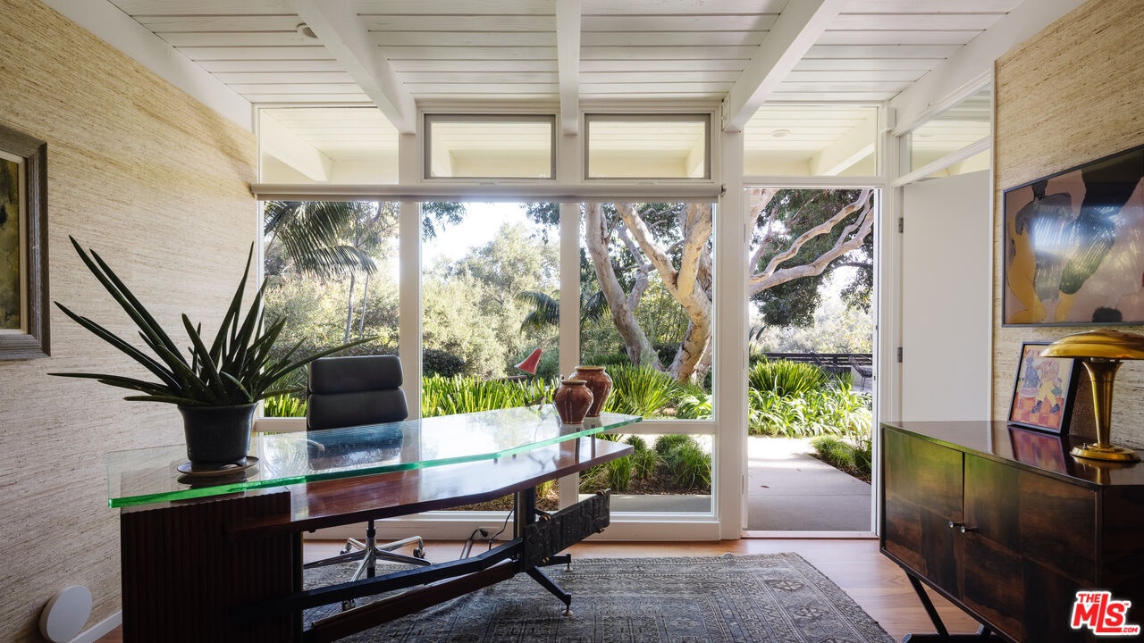 The Veneklasen House, originally completed in 1951, is a rare architectural offering in Mandeville Canyon. Designed by architect Kenneth Lind with significant influence from Modernist master Pierre Koenig, the home represents an important piece of Los Angeles design history. Koenig's impact is most evident in the dramatic living room, where an accordion-fold glass wall and sculptural brickwork create a seamless connection between architecture and landscape.The privately-gated residence spans approximately 3,904 square feet and includes three bedrooms, three bathrooms, and one powder room on a generous lot of approximately 28,314 square feet. A thoughtfully designed second-level addition introduced a light-filled primary suite positioned to take full advantage of the canyon setting, offering an elevated and private retreat immersed in nature.A classic post-and-beam structure with expansive glass walls defines the home's open yet intentional layout. Indoor and outdoor spaces flow effortlessly to landscaped gardens by Mark Tessier, courtyard areas, and canyon views. The V-shaped layout of the estate centers around a remarkable, sculptural mature eucalyptus tree supported by manicured, low-lying native plantings, reinforcing seclusion, artful balance, and a deep sense of place. Interiors are refined yet comfortable, featuring a cohesive palette of dark walnut, stone, layered textiles, and playful touches of celadon quartzite. Open, light-filled spaces are thoughtfully divided into distinct zones, each with its own atmosphere. Nearly all furnishings are vintage, lending warmth, authenticity, and a collected aesthetic that complements the architecture without distraction.Private, immersive, and architecturally significant, receiving the 2022 AIA LA Award for Historic Preservation, this is a rare Mandeville Canyon offering that balances pedigree, comfort, and legacy.