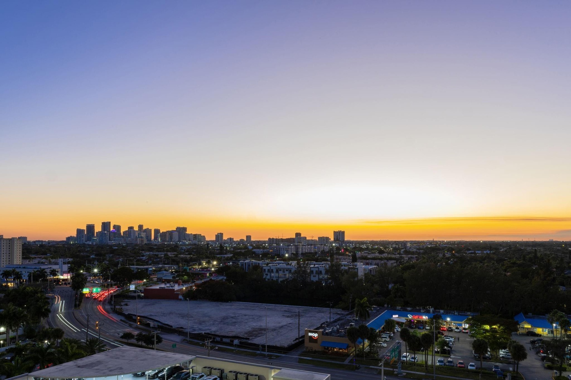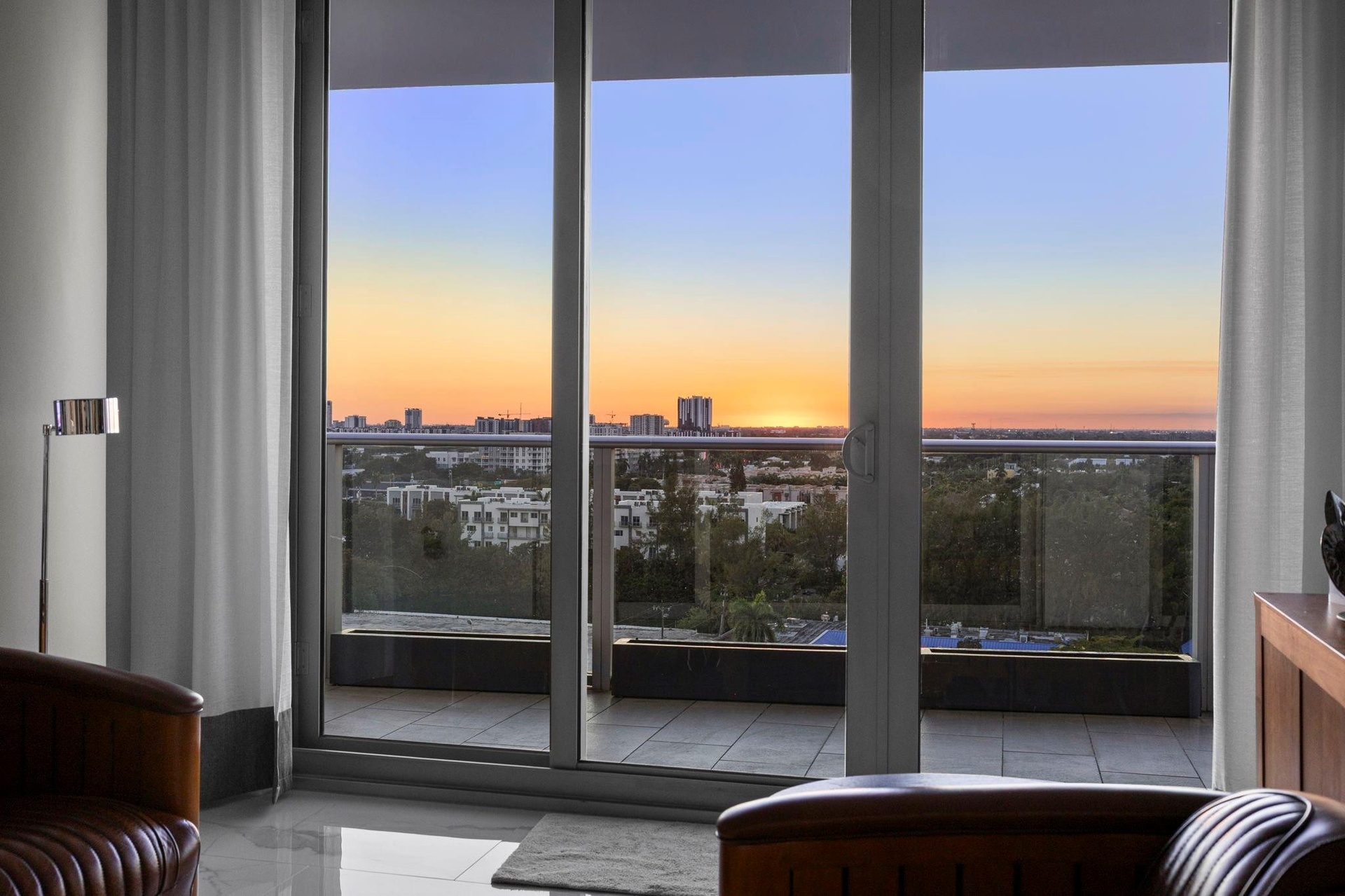 Sophisticated urban retreat with dramatic sunset amp ; city views.