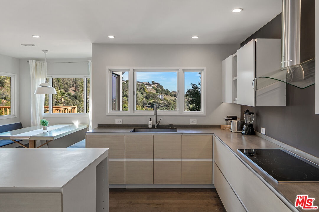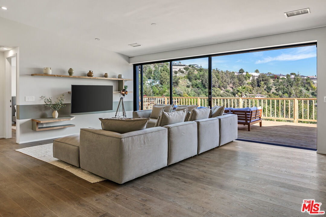 Panoramic canyon and city views, expansive outdoor living, and refined modern interiors define this newly reimagined architectural retreat perched above the street on coveted Carman Crest Drive. Privately set and thoughtfully redesigned, this residence blends elevated Hollywood Hills living with warmth, scale, and effortless indoor-outdoor flow. A dramatic entry welcomes you into a light-filled open floor plan where wide-plank wood floors and clean architectural lines create a sense of calm and volume throughout. The living and dining spaces unfold seamlessly into a stunning entertainer's deck through oversized retractable glass doors framing sweeping hillside vistas and creating an ideal setting for sunset gatherings, al fresco dining and everyday California living. The open-concept kitchen is both functional and refined, featuring a generous center island, sleek modern cabinetry, and integrated appliances, all designed to connect effortlessly with the adjacent dining nook and living areas. Natural light pours in from multiple exposures, enhancing the home's organic palette and tranquil atmosphere. The primary suite is a private retreat, offering serene views, ample closet space, and a spa-inspired bathroom with clean lines, modern finishes, and a calming, understated aesthetic. Additional bedrooms are thoughtfully laid out and well-proportioned ideal for guests, home offices, or creative studios each maintaining the home's cohesive design language. Outdoors, the expansive deck and private yard provide rare usable space in this hillside setting, perfect for lounging, entertaining, or quiet moments surrounded by nature. A spacious two-car garage and additional storage complete the home, offering both convenience and practicality. Located moments from Hollywood, Studio City, and the iconic trails of Griffith Park, this refined hillside residence delivers privacy, views, and architectural integrity an inspired offering for buyers seeking elevated design and effortless Los Angeles living.