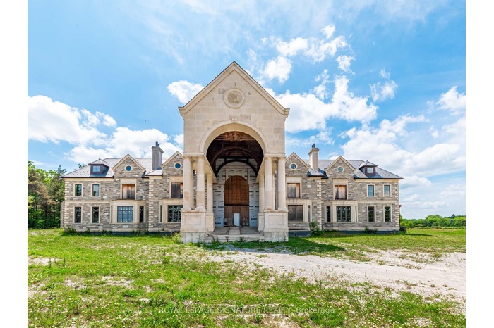 Iconic Masterpiece Ready for Your Vision. An extraordinary opportunity awaits on this sprawling 48.4-acre property to a partially built, 20,000 sq ft unfinished architectural estate home that offers the rare chance to bring your dream residence to life from the ground up. Currently in the pre-drywall phase, this remarkable structure provides the perfect blank canvas to finish and customize every detail to your exact taste. Designed with timeless grandeur in mind, the homes exterior showcases a full stone facade, a stately front porch with a dramatic arched entryway, and large pillars that create an unmistakable sense of arrival. Inside, a spectacular main floor foyer with soaring ceilings sets the tone for the scale and elegance planned throughout the home. The layout includes 8 expansive bedrooms, with most ensuites roughed-in for heated flooring. The future primary suite is designed as a true sanctuary featuring a private walkout terrace, his & hers walk-in closets, and space for an oversized spa-like ensuite. A covered walkout deck from the main floor, a walkout to 1 of 2 triple garages, and thoughtfully planned sightlines add to the homes exceptional flow and function. With residential and commercial zoning, the estate opens the door to a variety of uses whether you envision a luxurious private residence, a family compound, or a live-work lifestyle property with unmatched land value. From the elegant stonework to the expansive footprint, the structure is in place what remains is the opportunity to shape it into something truly iconic. Seize the rare chance to complete a grand estate tailored entirely to your vision. Severance possibility.