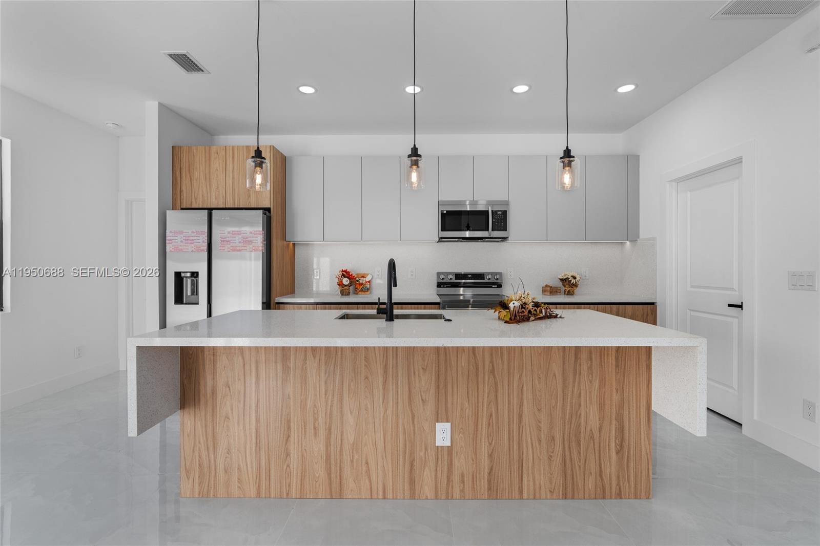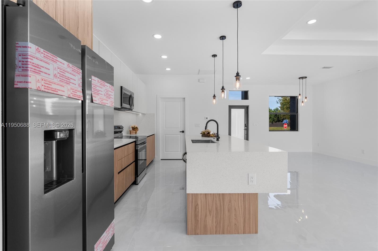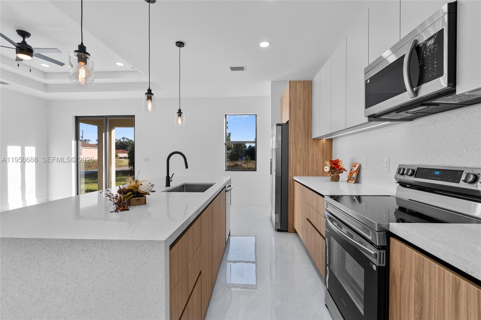 New construction home situated on a desirable corner lot in Lehigh Acres, Florida. This beautifully designed residence features 3 spacious bedrooms and 2 modern bathrooms, blending comfort, style, and functionality. The open-concept layout showcases elegant porcelain flooring, sleek quartz countertops, and a chef-inspired kitchen equipped with stainless steel appliances, contemporary fixtures, stylish cabinetry, and under-cabinet lighting, ideal for both everyday living and entertaining. The primary suite includes a thoughtfully designed built-in master closet offering ample storage and organization. Additional highlights include a built-in laundry closet, modern lighting fixtures, and updated faucets throughout. Conveniently located near shopping, dining, and essential amenities. Don’t miss this exceptional opportunity.