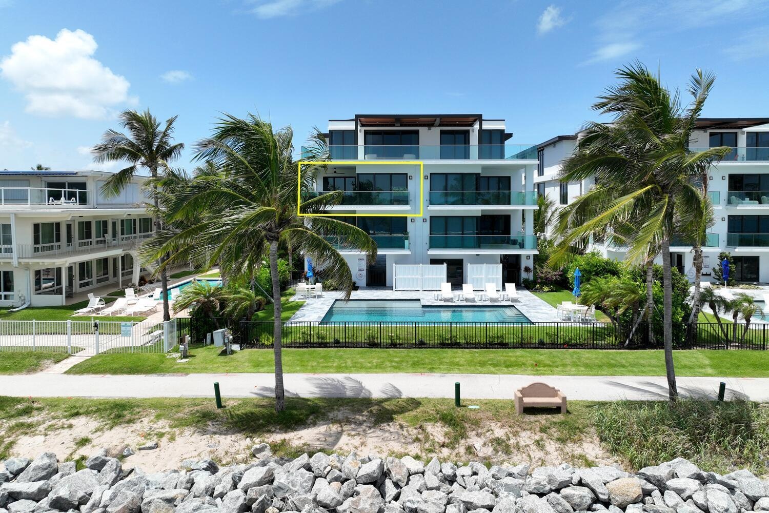 Waterfront luxury meets elevated design in Palm Beach Shores, located directly on the Palm Beach Inlet. This extraordinary second-floor residence at 206 Inlet Way offers a front-row seat to breathtaking turquoise waters and lush inlet views—an exclusive lifestyle opportunity in one of South Florida's most desirable boutique buildings. Expertly curated by Decorators Unlimited, this state of the art turnkey home is a true showpiece, blending elegance with smart-home convenience. Every detail has been thoughtfully selected—from custom wall coverings and designer lighting to recessed accents and stunning artwork throughout. Enjoy seamless indoor-outdoor living with a phantom privacy screen on the balcony, custom blackout blinds, and built-in surround sound in the kitchen, living room, and primary suite all easily controlled by your smartphone. Picture frame TVs and a Sonos sound bar elevate your entertainment experience. The gourmet kitchen is a chef's dream, featuring a large center island with a built-in wine refrigerator, Monogram stainless steel appliances, a five-burner gas range with griddle, under-cabinet lighting, sleek custom cabinetry, and a walk-in pantry with two beverage refrigerators. In the dining area, you'll find a custom built-in bar with beverage center and cabinetry perfect for entertaining in style. Retreat to a spa-inspired primary suite with a 17-foot double vanity, TV, private water closet, oversized shower, and custom walk-in closet. Oversized 48x48 porcelain tiles run throughout, adding a polished, modern edge to every room. Offered fully furnished and move-in ready just bring your suitcase. This rare waterfront offering combines refined style, cutting-edge technology, and postcard views into one unforgettable Palm Beach Shores address. One of a kind views of Palm Beach Inlet and Palm Beach Island. This condo in Palm Beach Shores is located in a gated community with only five residence creating an exclusive and private atmosphere. This building offers its own pool, and 206 Inlet Way stands out with private golf cart access for residents, a built-in summer kitchen with side burner, and a beautifully designed cabana club room complete with lounge seating, air conditioning, TVs, and a bar. Residents enjoy private beach access, custom landscape design throughout the property, 2 assigned parking spaces.(one interior and one exterior) Parking garage complete with epoxy flooring, epoxy-coated exterior staircases and additional parking for added convenience. Located just across from Palm Beach, this exceptional residence places you moments from world-class dining, luxury shopping on Worth Avenue, renowned golf courses, marinas, and the cultural vibrance of West Palm Beach. Whether you're unwinding by the water, exploring coastal trails, or enjoying the Palm Beaches social scene, this is South Florida living at its finest. Located close to cultural centers like Kravis Center, fine dining, world class fishing, beaches, recreation, and entertainment. Easy access to major highways and Palm Beach International Airport.