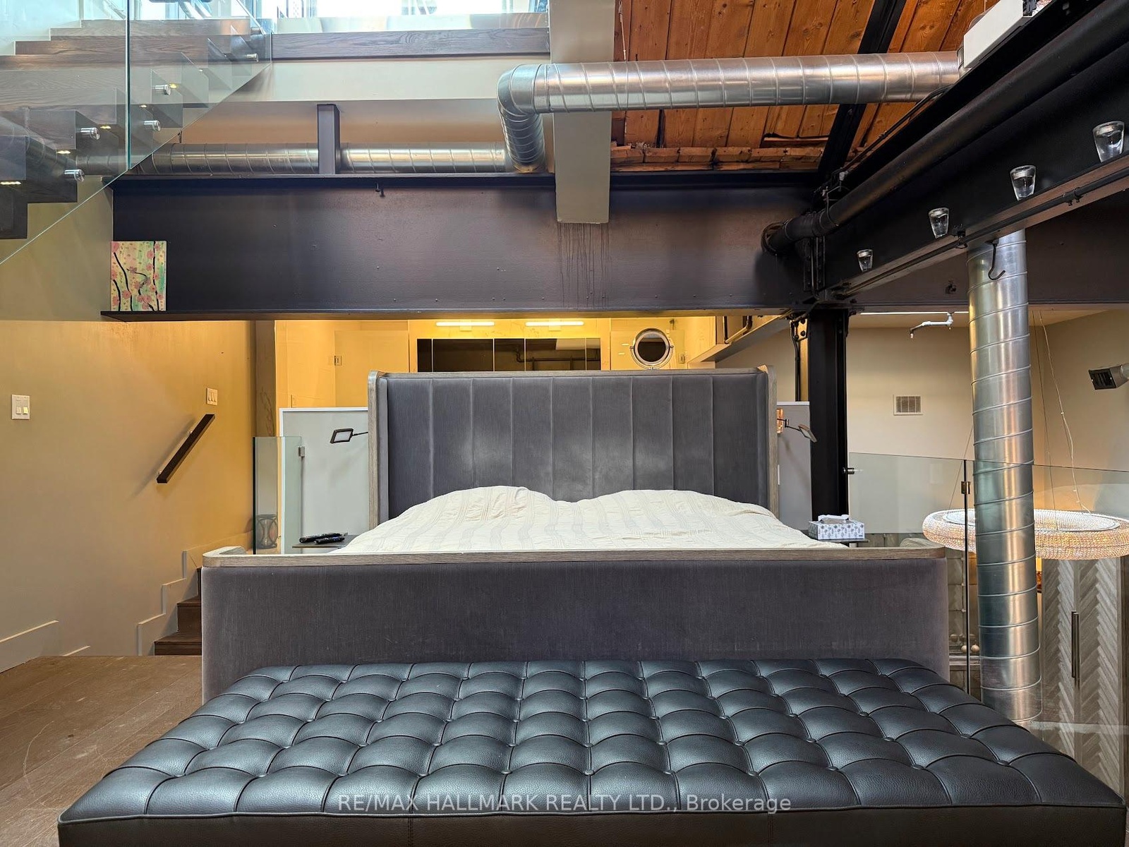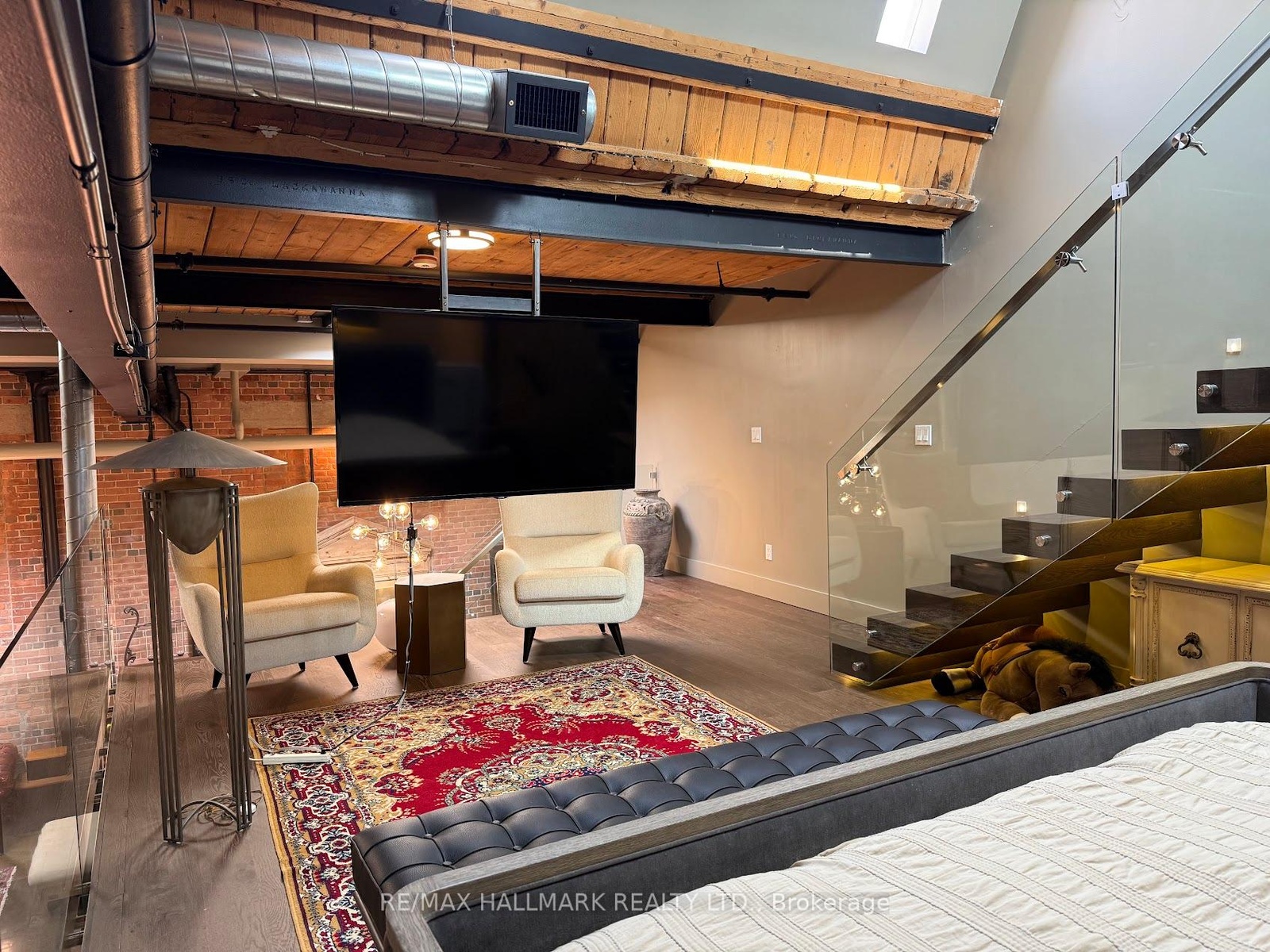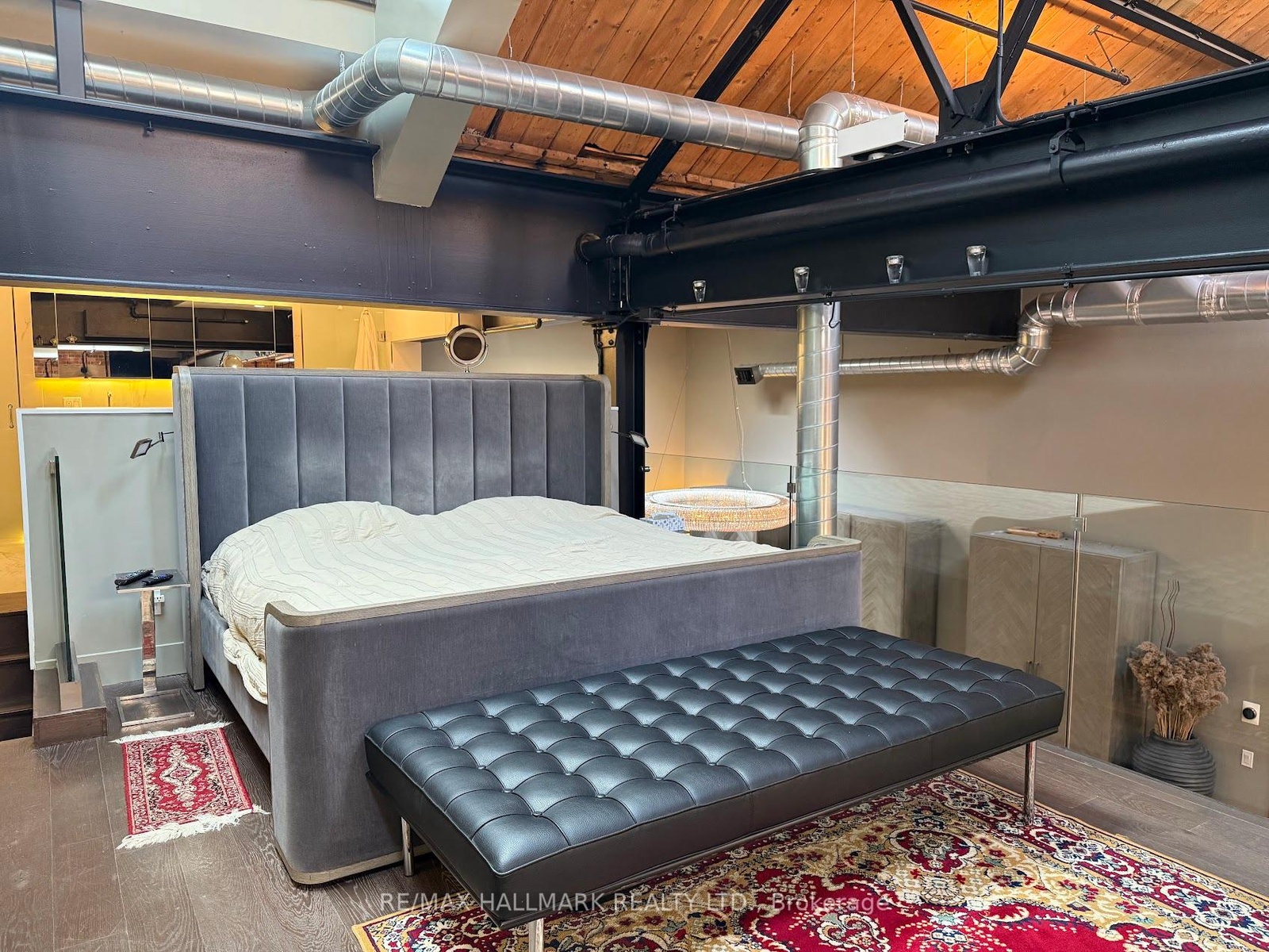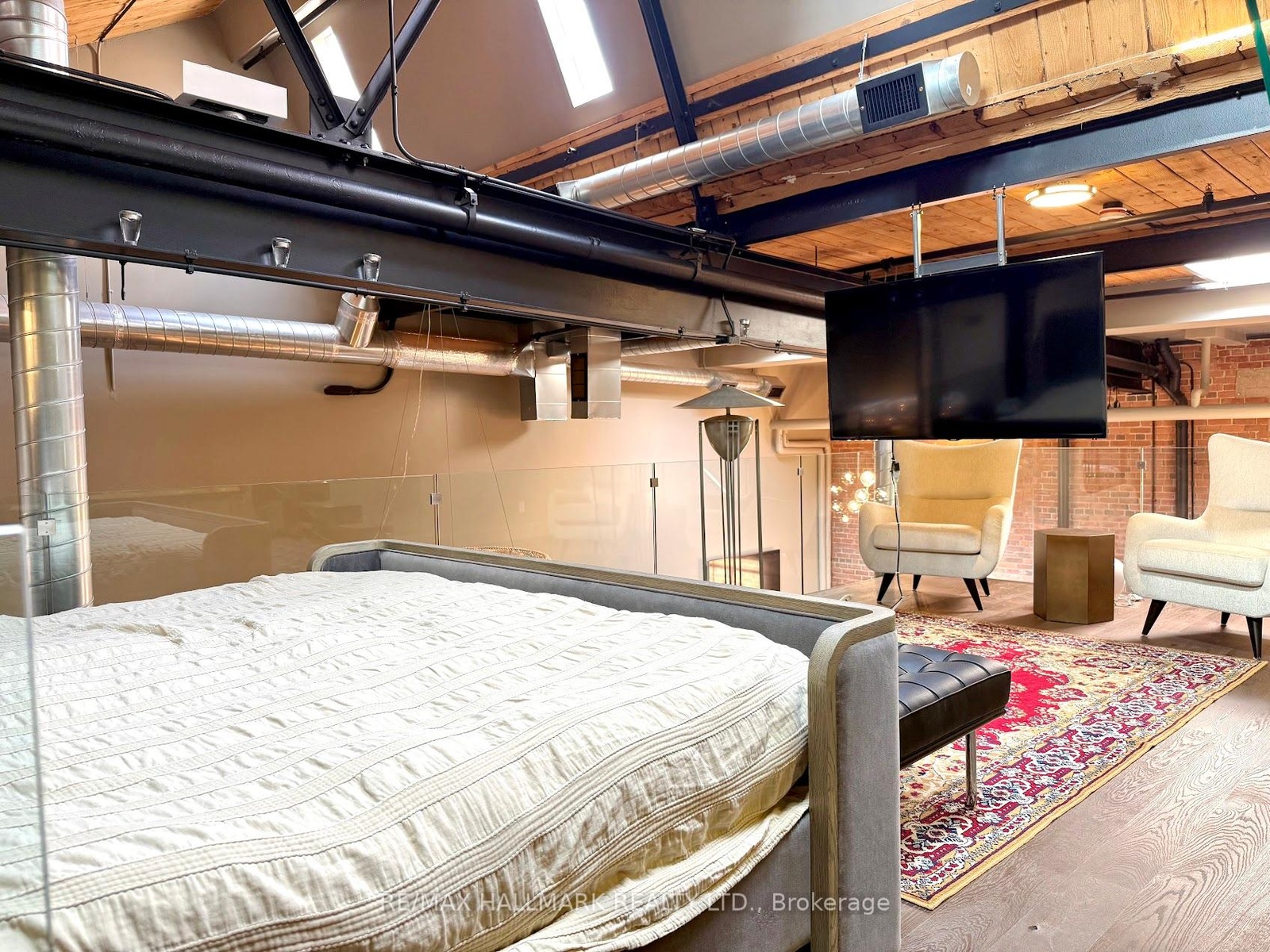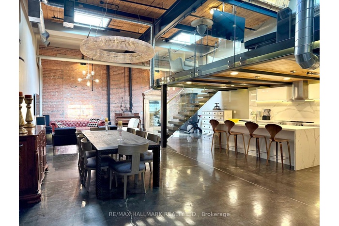 Rare opportunity to lease a fully furnished loft in Leslieville's iconic I-Zone. Offering 2,329 sq ft of living space with soaring timber & beam ceilings peaking at nearly 25 ft, exposed brick, polished concrete floors, and a private 375 sq ft rooftop terrace, this authentic hard loft is truly one-of-a-kind! The chef-inspired kitchen showcases quartz counters, oversized island, and a full suite of top-of-the-line KitchenAid appliances including large oven/stovetop, double-door fridge, wine fridge, and whisper-quiet dishwasher. The open layout flows seamlessly between dining and living spaces while skylights flood the loft with natural light. Every furnishing and finish has been thoughtfully selected: Restoration Hardware dining set, bed, storage units and mirrors, Elte armchairs and coffee tables, hand-knotted Persian rugs, solid rosewood entry chest, and crystal decanters. Essentials are all included, linens, bedding, cutlery, plates, cookware, Breville automatic toaster, Blendtec industrial blender, and Coway Airmega air purifier sized for the entire loft. Simply turn the key and enjoy immediate high-end living. The main level includes a spacious second bedroom, three-piece bath with glass shower, and expansive living areas. The upper-level primary suite offers custom closets and a spa-like six-piece ensuite. This loft comes with a dedicated private underground parking spot. Located in a vibrant, creative hub steps to Queen St Easts trendy restaurants, cafes, galleries, parks, fitness studios, and transit, with quick access to the DVP, Gardiner, and Lakeshore. A rare offering, this is loft living at its absolute best!