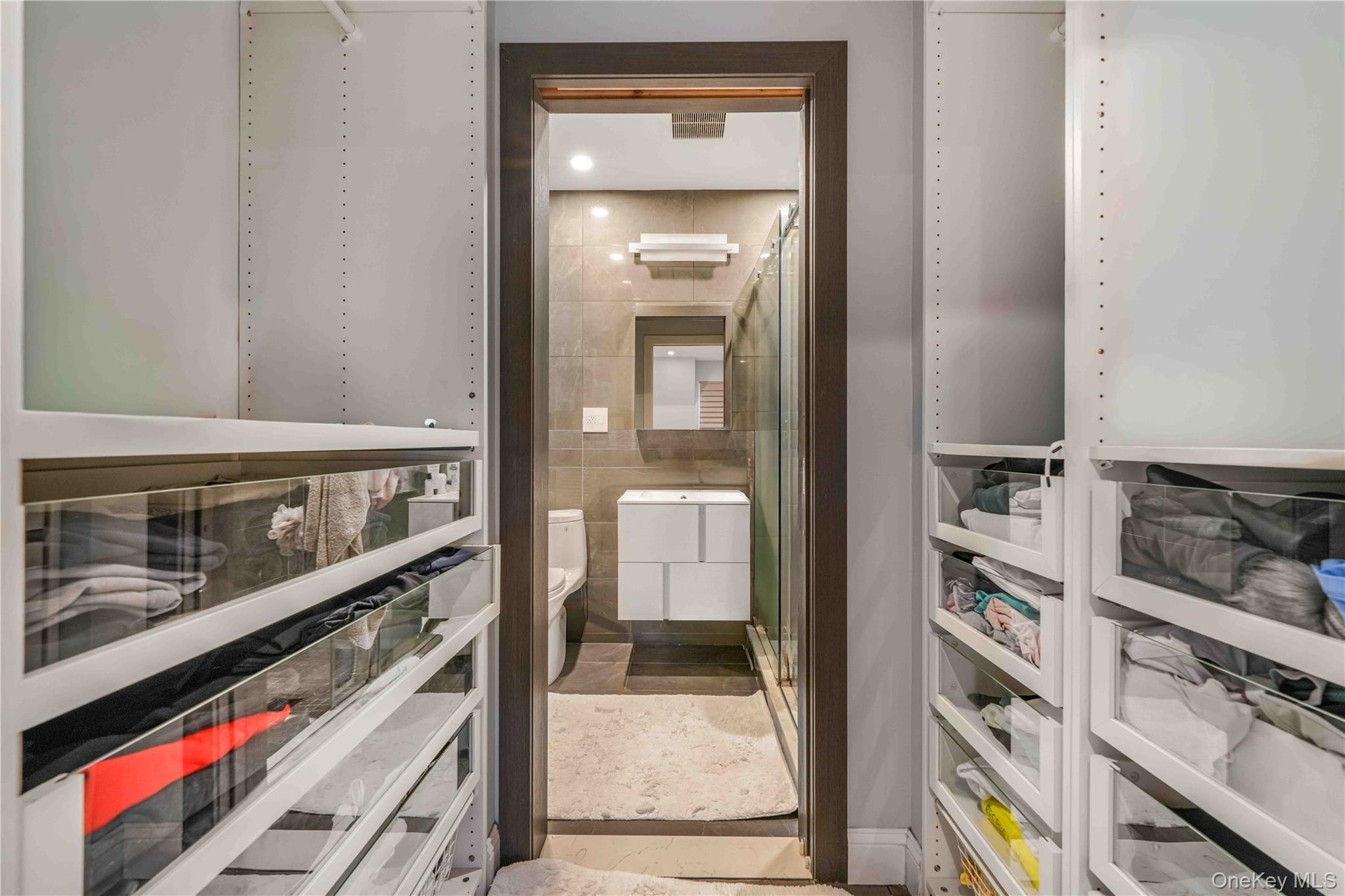 The primary bedroom offers ample closet space and a sleek en-suite bathroom, while two additional bedrooms provide flexibility for guests, a home office use. Both bathrooms are fully renovated with modern tilework and contemporary fixtures. In-unit washer and dryer included.
