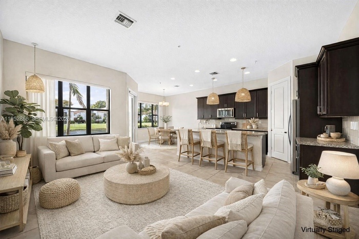 Exclusive move-in ready, WATERFRONT, 2018-built (LIKE-NEW), 2,133 sqft Townhome, with HIGH CEILINGS in the gated Raintree community (with beautiful, lush landscaping)! |~| The Vallejo model is LARGE, has 3 Bedrooms (potential 4th), 2.5 Bathrooms, an upstairs Den, and a 2-car GARAGE (space for 4+ cars). |~| The open-concept layout flows into a sleek Kitchen (with a big Island, Pantry, and a 3-Stage Reverse Osmosis Water Filter), Automatic Blinds (in the main living areas and primary bedroom), and fully Impact Windows and Doors throughout. |~| Primary Suite features 2 WALK-IN CLOSETS, Double Sinks, and a Private Balcony overlooking the water. |~| Raintree is pet-friendly and features resort-style amenities; including a pool (with loungers), a fully-stocked & updated fitness center (with locker rooms), responsive on-site management, an event space, and a playground (in-progress). |~| Centrally located just minutes from dining, malls, great schools, and major highways.