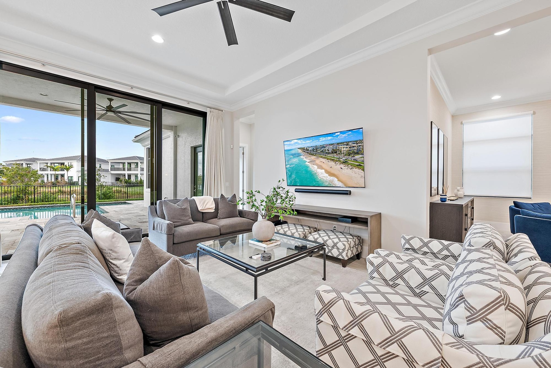 Outdoor living is a highlight, featuring a covered travertine patio, a private pool and spa with outdoor kitchen, and a large second-floor balcony overlooking the long lake, creating an impressive backdrop for entertaining and everyday enjoyment.