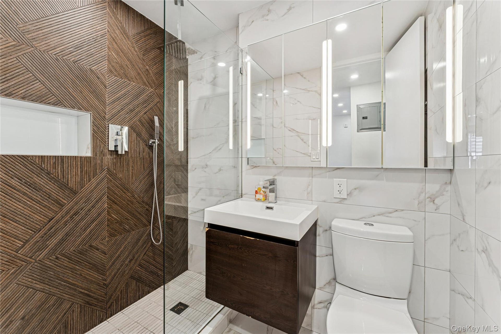 Spa-Inspired Bathroom: Relax in a designer bathroom featuring exquisite tile work and high-end fixtures.