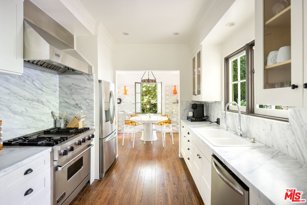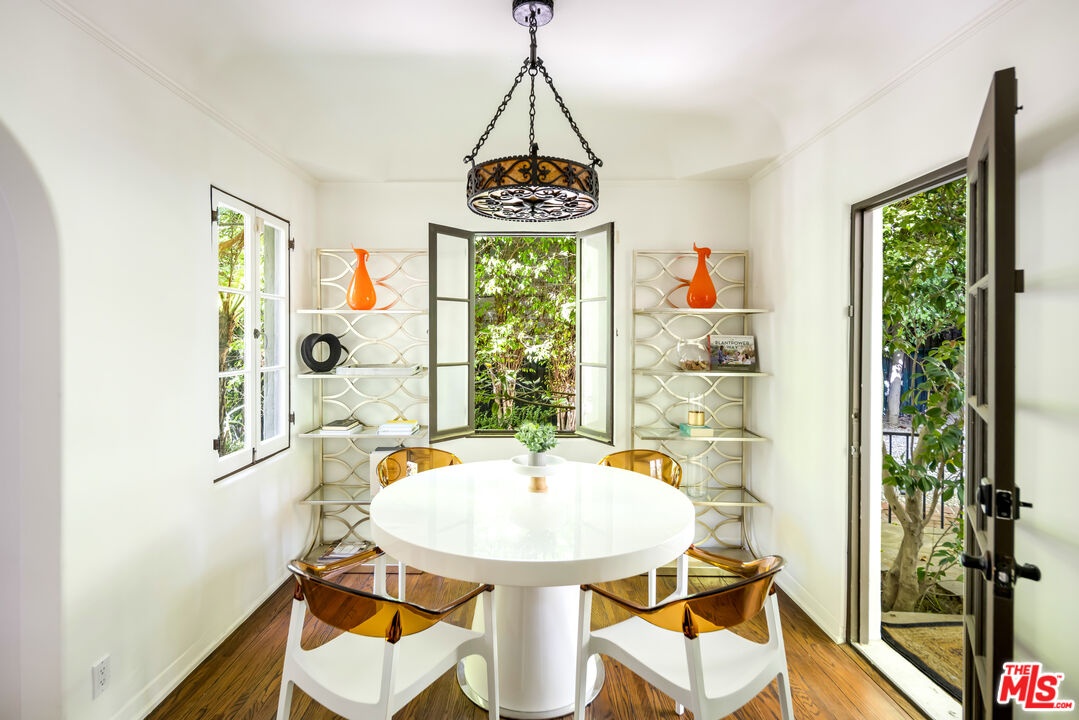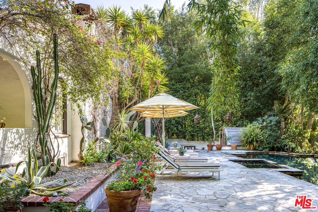 Tucked behind a veil of lush greenery and mature palms, this Spanish Revival sanctuary exudes the soul of Old Hollywood while embracing the ease of contemporary living. From the moment you enter through its arched gates, the property unfolds like a private garden estate -- framed in cascading bougainvillea, terracotta details, and the gentle sound of water echoing through an expansive front courtyard.Inside, the home balances romance and restraint. Light pours through paned windows, illuminating the warmth of plaster walls, hand-carved doors, and burnished wood floors that trace a timeless rhythm throughout. Each archway feels intentionally composed -- leading from intimate sitting rooms to airy gathering spaces, where iron sconces and Moorish lanterns glow softly at dusk. The kitchen and dining spaces invite connection, designed for meals that stretch into conversation, their windows opening to gardens thick with tropical foliage. Upstairs, the primary suite feels like a retreat within a retreat -- sun-dappled and serene -- with tree-lined views and a richly tiled bath, complete with soaking tub and dual vanity, that nods to the home's heritage.Outdoors, the estate reveals a scene of pure enchantment. A mosaic-tiled fountain anchors the sparkling pool, surrounded by lush greenery, multiple entertaining areas and lantern-lit palms against the evening sky. A shaded patio offers a ping-pong table, in addition to a tranquil space for dining with a BBQ grill. A barrel sauna and shaded lounging corners evoke resort-like seclusion, blending the serenity of a hidden spa with the charm of a Mediterranean garden.More than a home, this is an atmosphere. Situated in a sought-after pocket just moments from Los Angeles' premier shopping, dining, and nightlife, this residence captures the essence of California living.