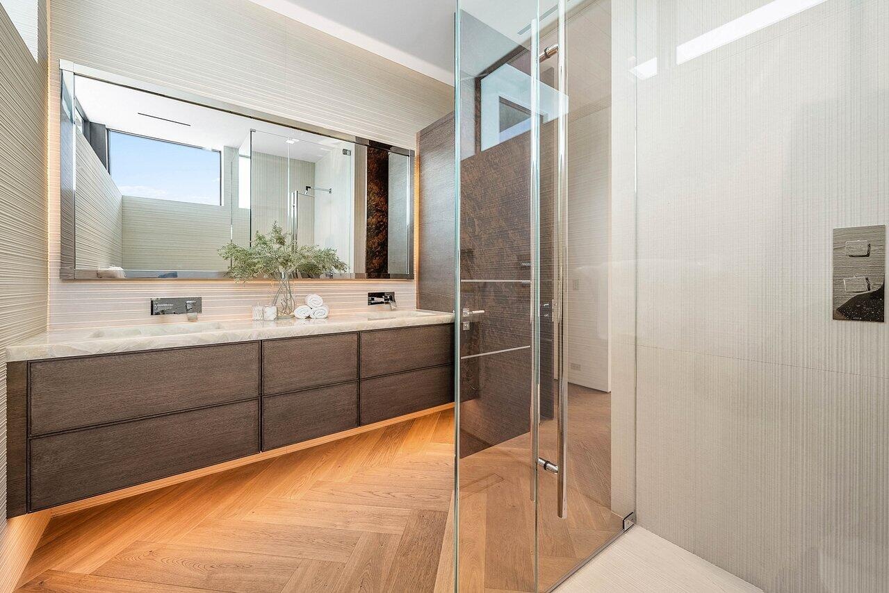 Step into unparalleled luxury in this brand-new custom estate located in the prestigious guard-gated community of Admirals Cove. Perfectly positioned on a quiet cul-de-sac just steps from the main clubhouse. This residence offers effortless access to world-class amenities, dining, spa, golf, and marina. A dramatic travertine and silver-leaf feature wall welcomes you, while the floating Cristallo staircase serves as a striking architectural centerpiece. Offering approximately 9,971 SF under air and 12,600 SF total. The home features 5 bedrooms including a first-floor primary suite, 6.1 baths, MAFI Austrian wood floors, and exceptional craftsmanship throughout. Two designer kitchens include a chef's kitchen and a stunning show kitchen with illuminated Cristallo quartzite countertops Ultra-high-end Eggersmann cabinetry, professional-grade appliances, and a custom coffee center define the designer kitchen. The primary bedroom is a serene retreat with La Finestra glass walls opening to the spa and pool, plus a spa-inspired bath with backlit agate countertops, integral stone sinks, dual water closets, freestanding soaking tub, titanium-tiled shower, and two custom walk-in closets.