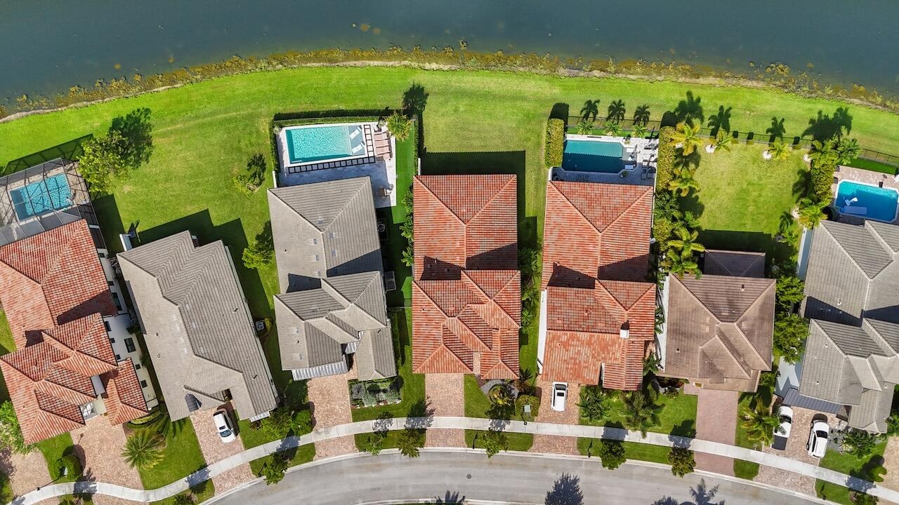 Outdoor living is enhanced by a screened-in lanai with upgraded tile flooring, remote-controlled retractable screens, and tranquil lake views. The professionally landscaped yard includes timed exterior lighting and offers ample room for a pool.