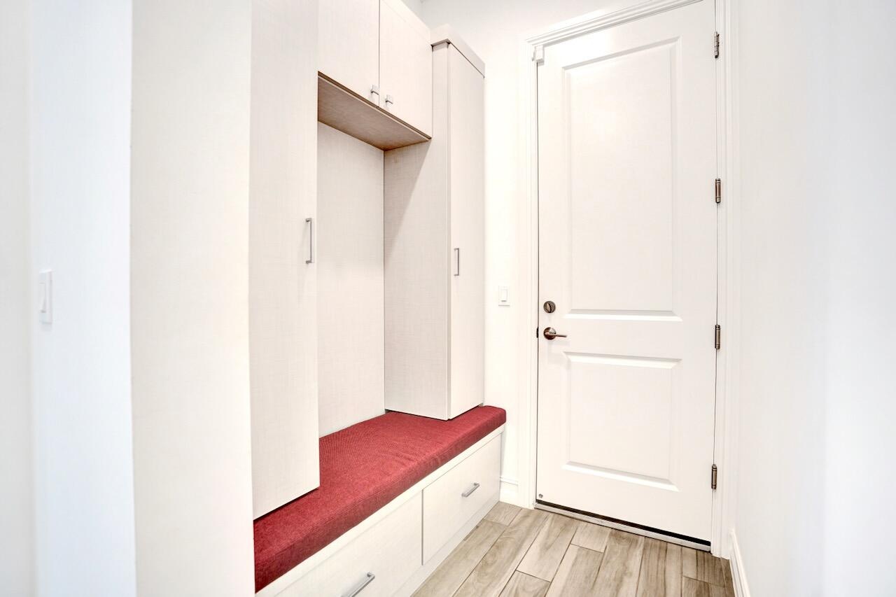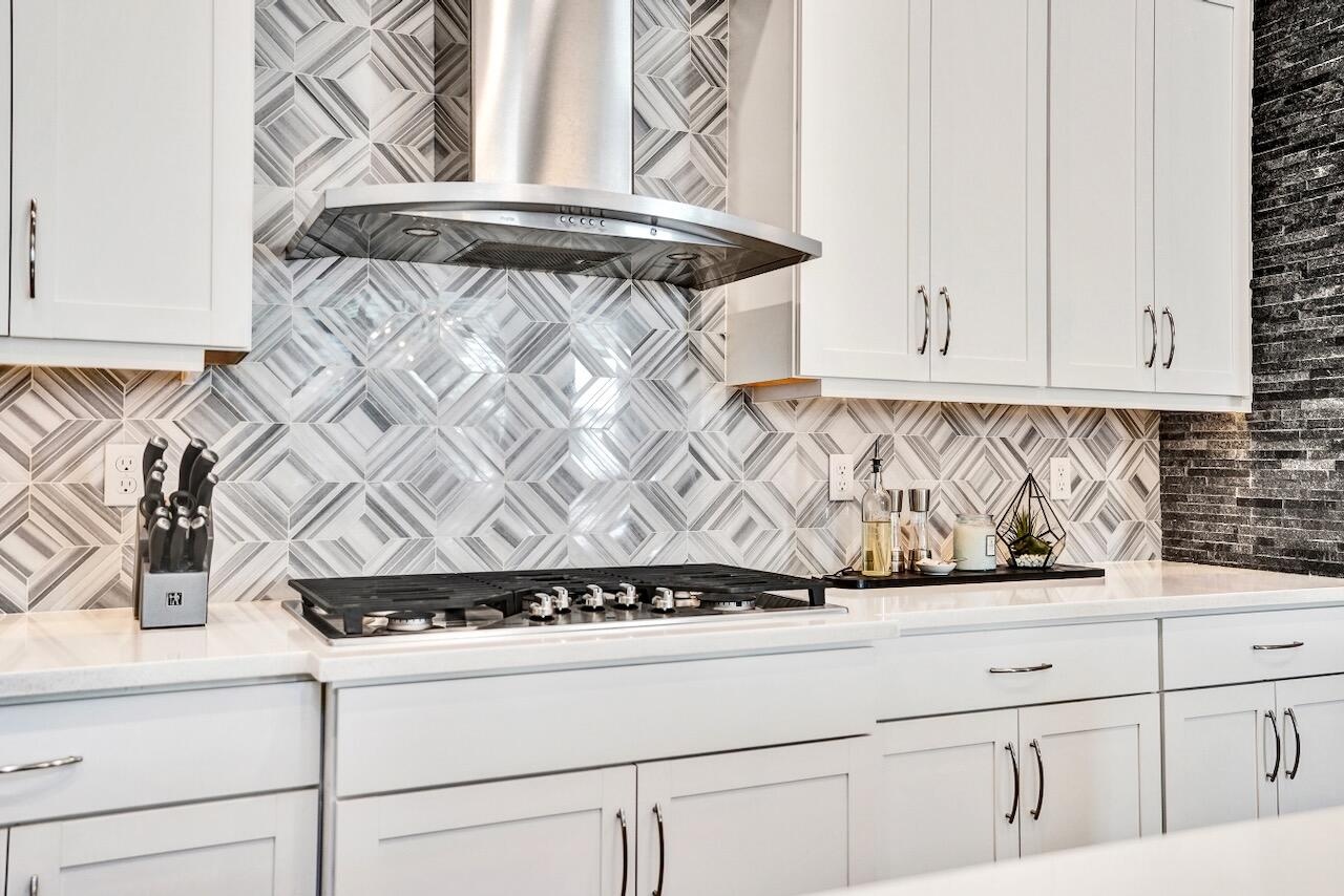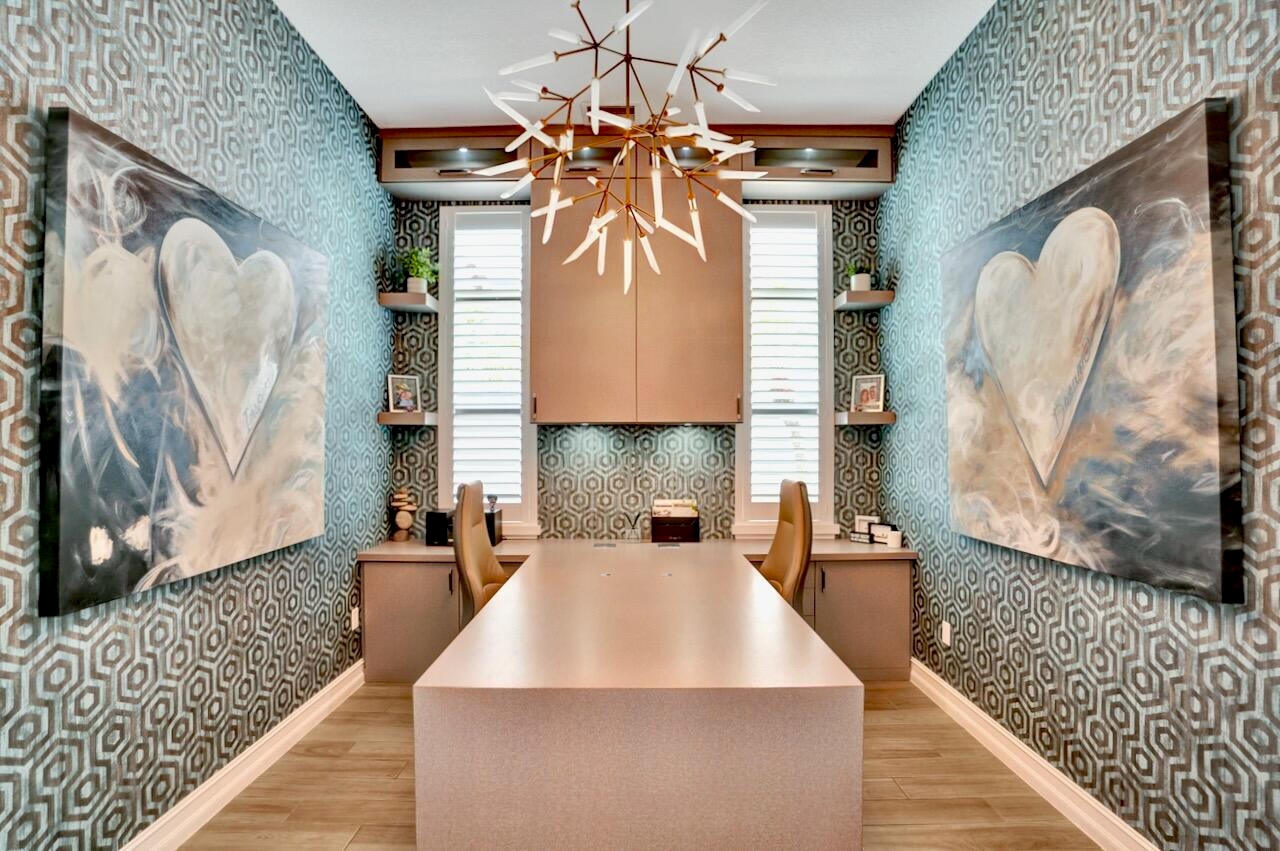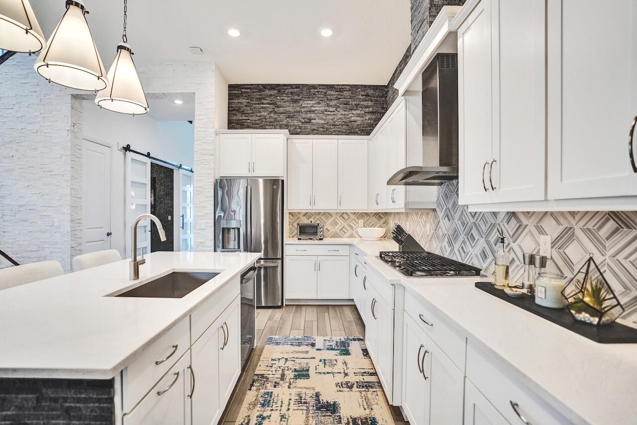 The main level features an open-concept living area, upgraded glass double entry doors, custom media cabinetry, and an entirely upgraded chef's kitchen with quartz countertops, marble backsplash, stone accent tile, stainless steel appliances, gas range, double ovens, and a walk-in pantry with custom storage. Also on the main floor are the luxurious primary suite, a private office with barn doors and built-in storage, a second ensuite bedroom, and a custom mudroom with built-in seating. The primary suite includes custom electric shades, designer lighting, and two oversized walk-in closets. The spa-inspired bath offers a frameless glass shower and soaking tub.