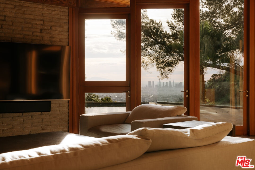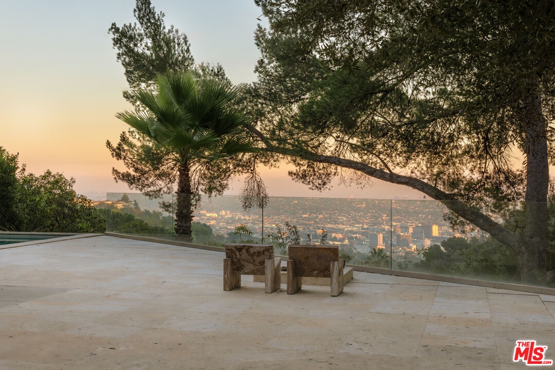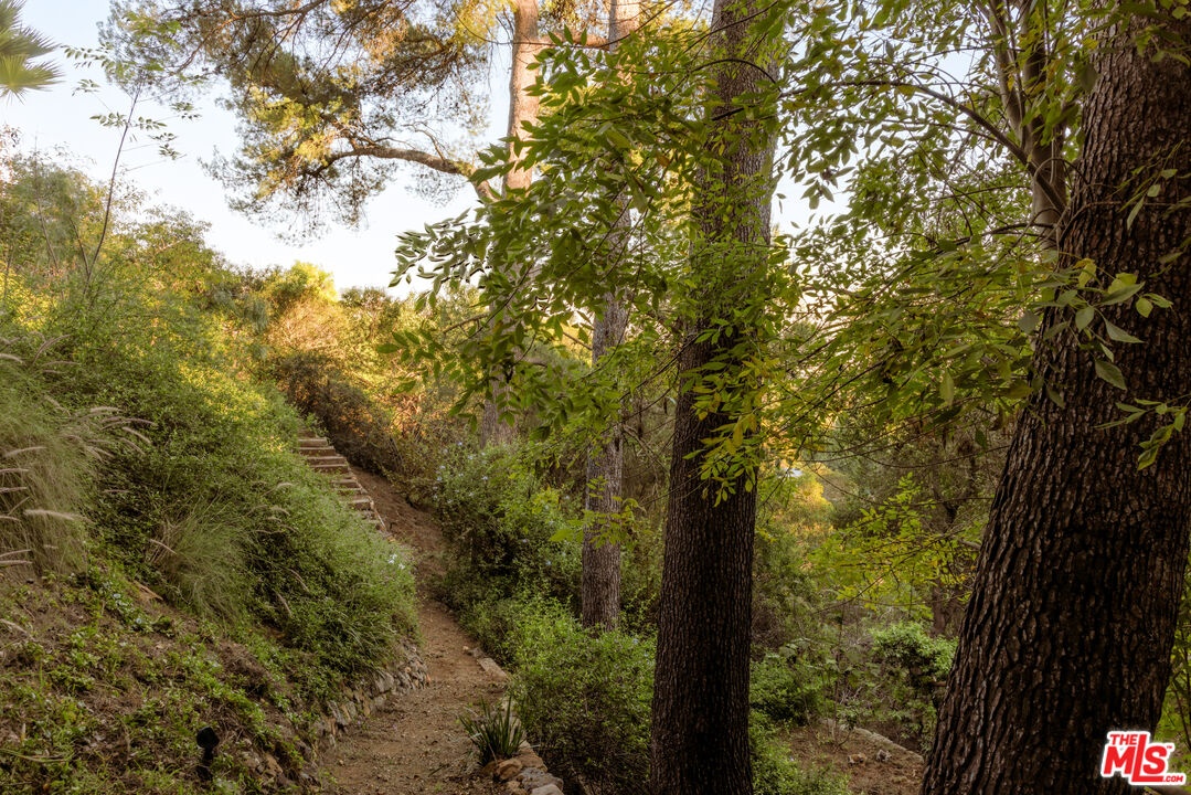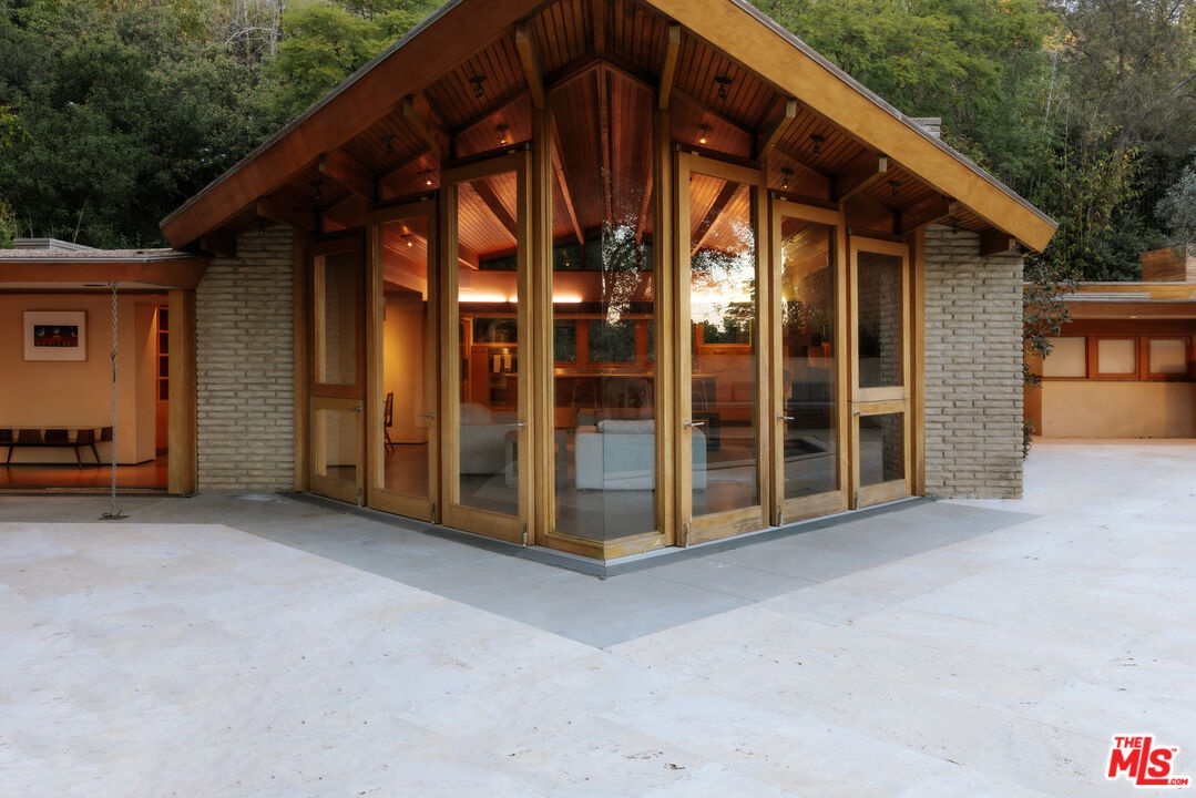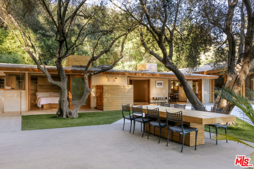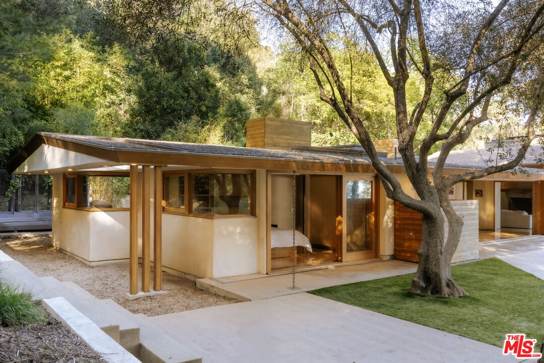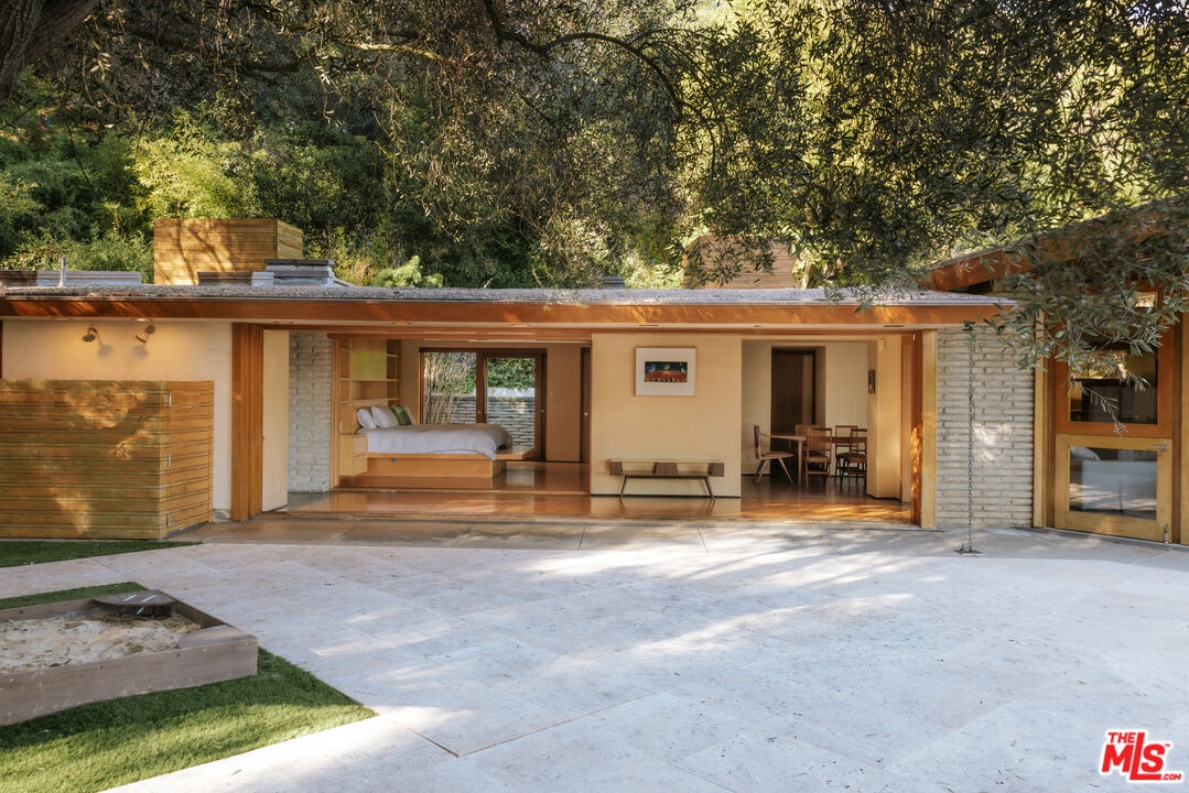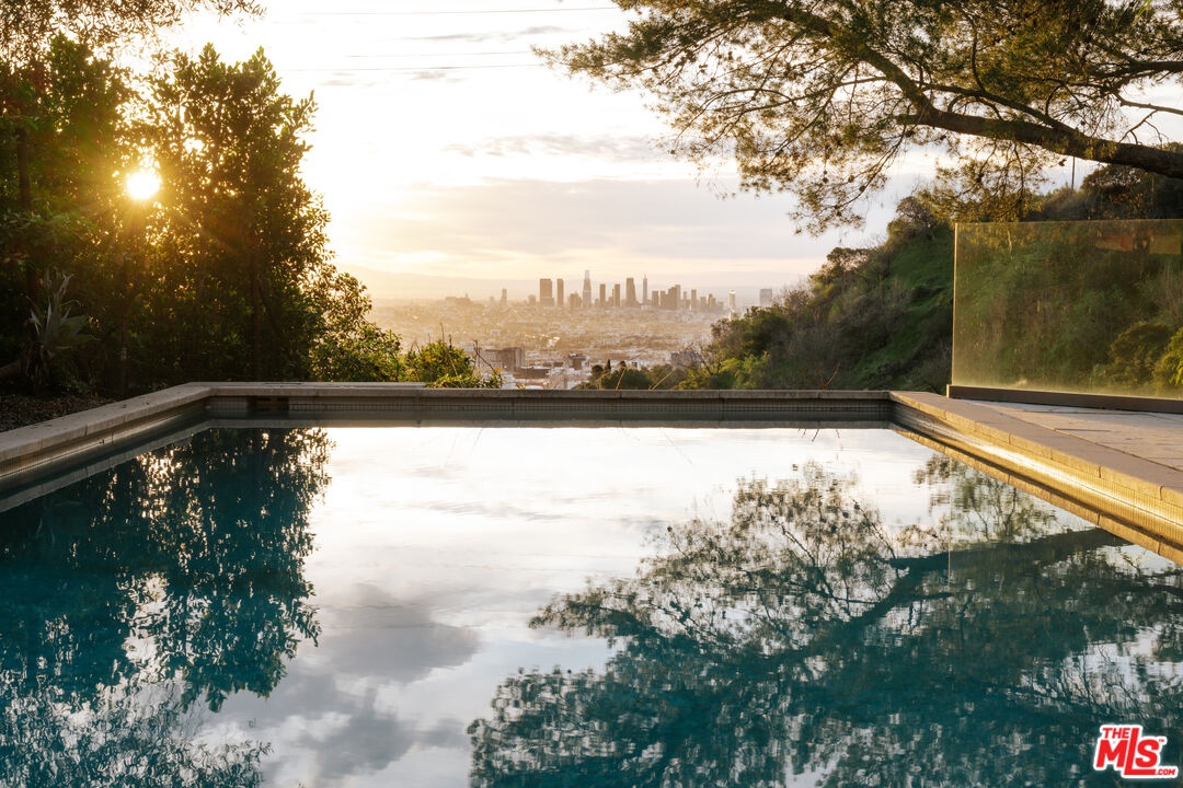 Purist mid century meets modern day functionality, while maintaining total privacy in nature: Sited at the end of a long, gated private drive on a rare, nearly flat acre, this pristine residence is a refined example of true mid-century architecture, defined by exceptional lines, strong horizontality, and complete privacy from every angleideal for a high-profile owner with a history of notable lineage.Clean modernist forms and walls of pocketing glass create a seamless indoor-outdoor connection, set among towering, centuries-old mature trees. The open floor plan flows from the main living areas to a distinct bedroom wing, anchored by a dramatic living room with 14-foot ceilings and fireplace. The kitchen features custom cabinetry, stainless steel countertops, and Miele appliances, oriented toward light, proportion, and views. The primary suite offers dual custom-poured concrete vanities and wood floors, alongside two additional bedrooms and bath. A covered breezeway connects to a separate guest house, ideal for guests, office, or studio.The grounds are exceptionally usable, featuring expansive flat lawn, a swimming pool, mature landscaping, and direct access to hiking trails. Elevated above the city, the property enjoys sweeping downtown views with no sight lines in from any direction, plus parking for up to 10 cars. Additional opportunity: the potential to acquire the neighboring residence and adjacent vacant parcel, allowing for the creation of a rare, newly assembled ~3-acre private compound at the end of the driveway, offering seldom found in Los Angeles. Never before sold as a package.