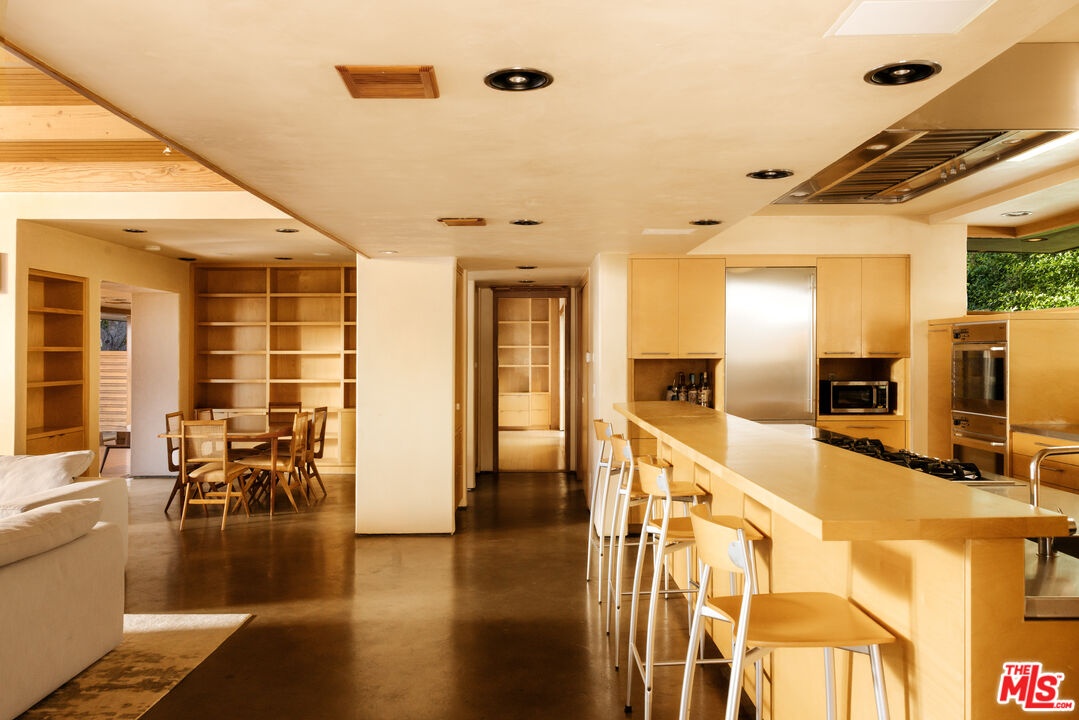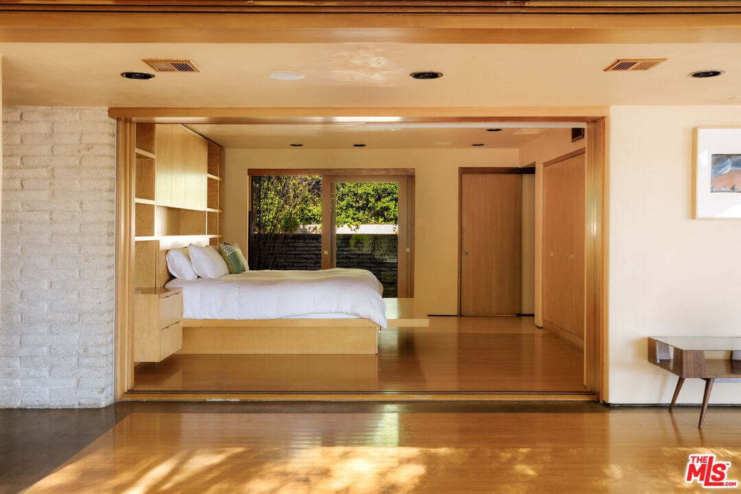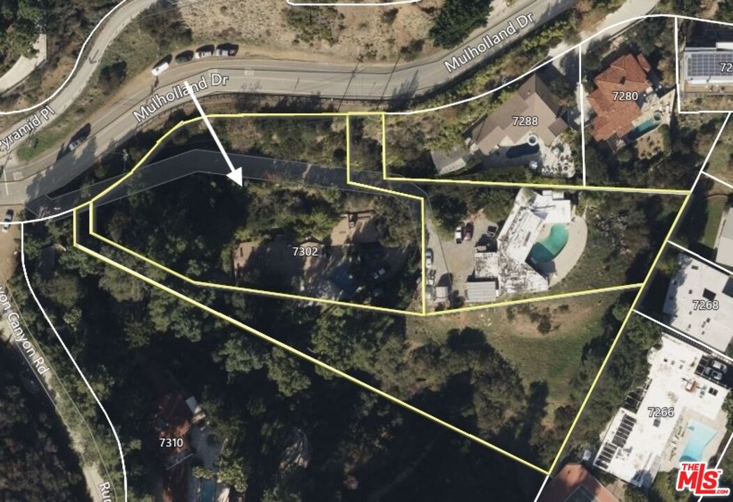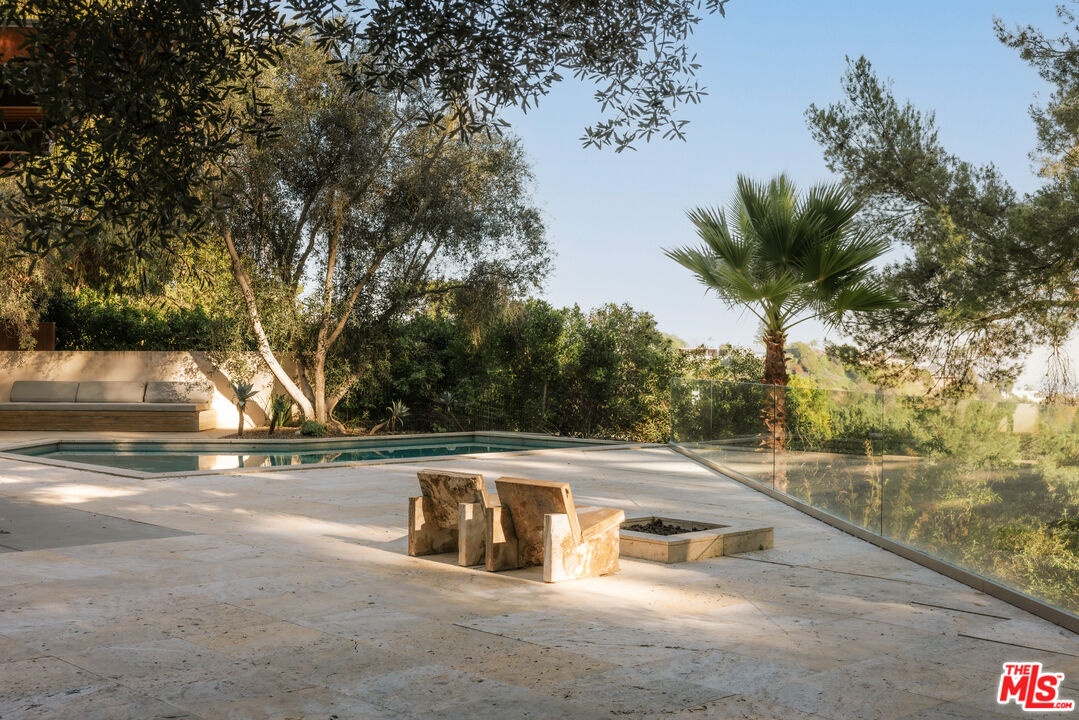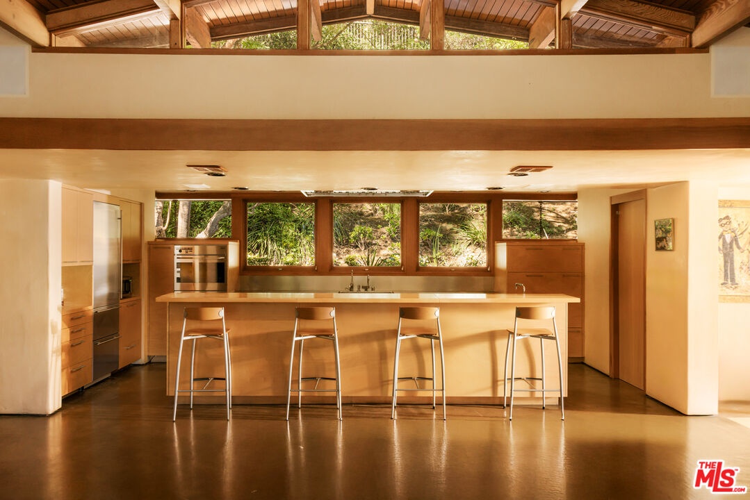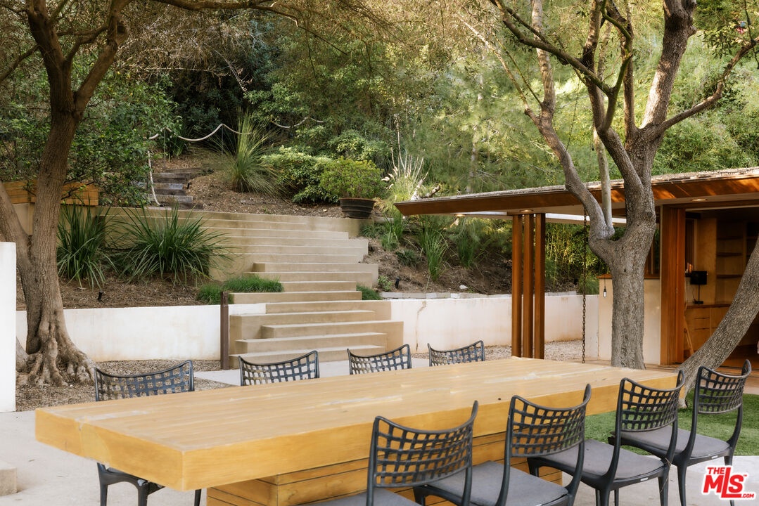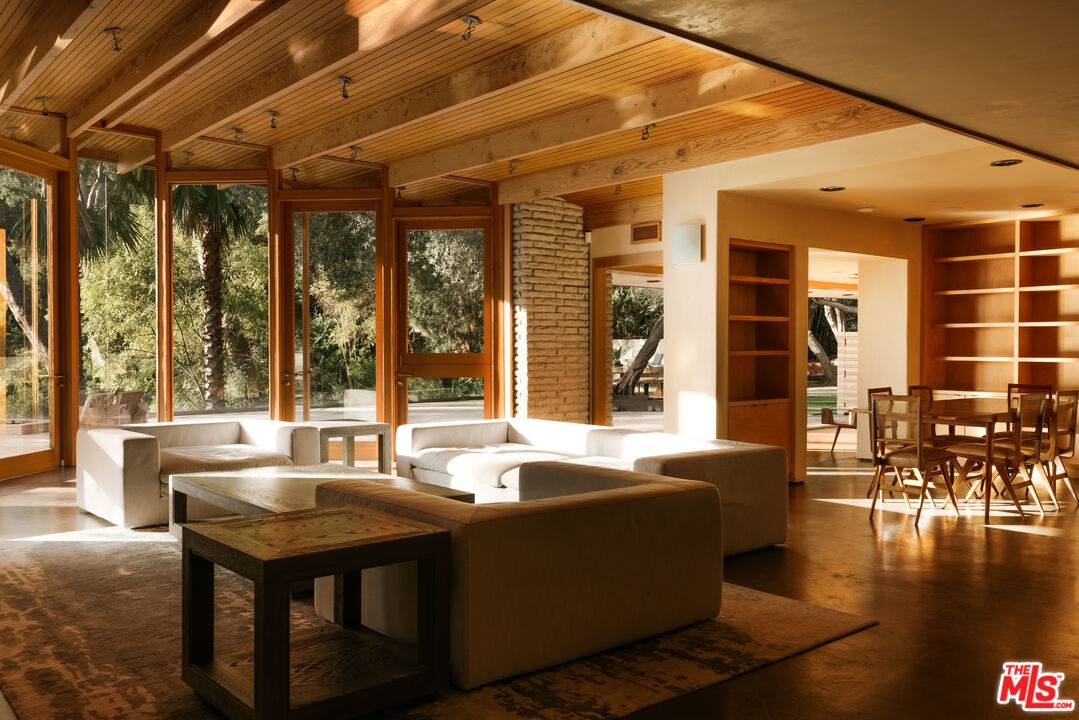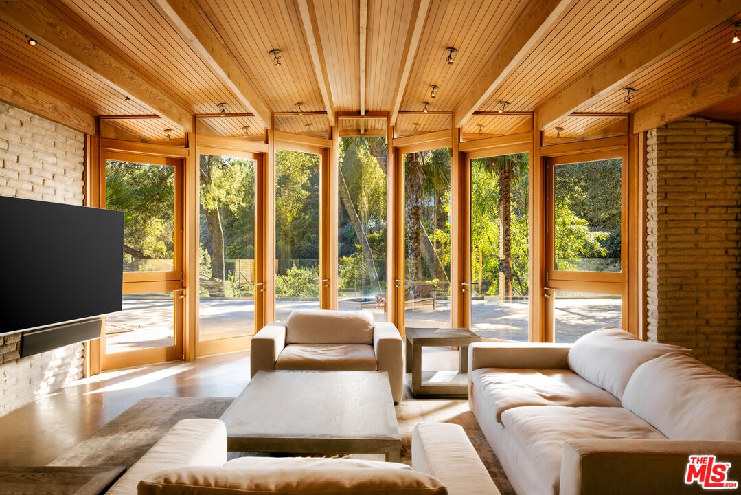 Purist mid century meets modern day functionality, while maintaining total privacy in nature: Sited at the end of a long, gated private drive on a rare, nearly flat acre, this pristine residence is a refined example of true mid-century architecture, defined by exceptional lines, strong horizontality, and complete privacy from every angleideal for a high-profile owner with a history of notable lineage.Clean modernist forms and walls of pocketing glass create a seamless indoor-outdoor connection, set among towering, centuries-old mature trees. The open floor plan flows from the main living areas to a distinct bedroom wing, anchored by a dramatic living room with 14-foot ceilings and fireplace. The kitchen features custom cabinetry, stainless steel countertops, and Miele appliances, oriented toward light, proportion, and views. The primary suite offers dual custom-poured concrete vanities and wood floors, alongside two additional bedrooms and bath. A covered breezeway connects to a separate guest house, ideal for guests, office, or studio.The grounds are exceptionally usable, featuring expansive flat lawn, a swimming pool, mature landscaping, and direct access to hiking trails. Elevated above the city, the property enjoys sweeping downtown views with no sight lines in from any direction, plus parking for up to 10 cars. Additional opportunity: the potential to acquire the neighboring residence and adjacent vacant parcel, allowing for the creation of a rare, newly assembled ~3-acre private compound at the end of the driveway, offering seldom found in Los Angeles. Never before sold as a package.