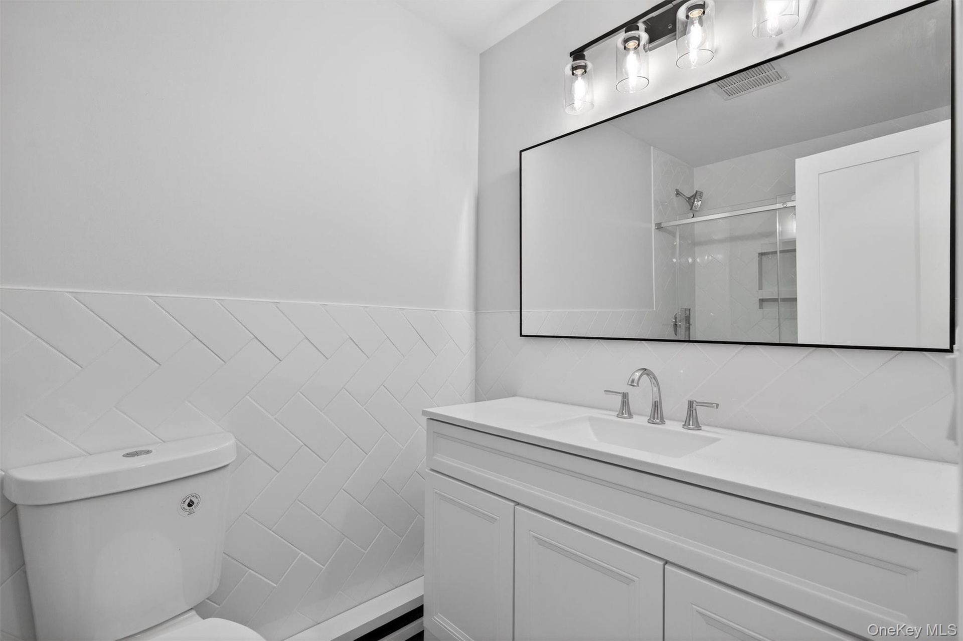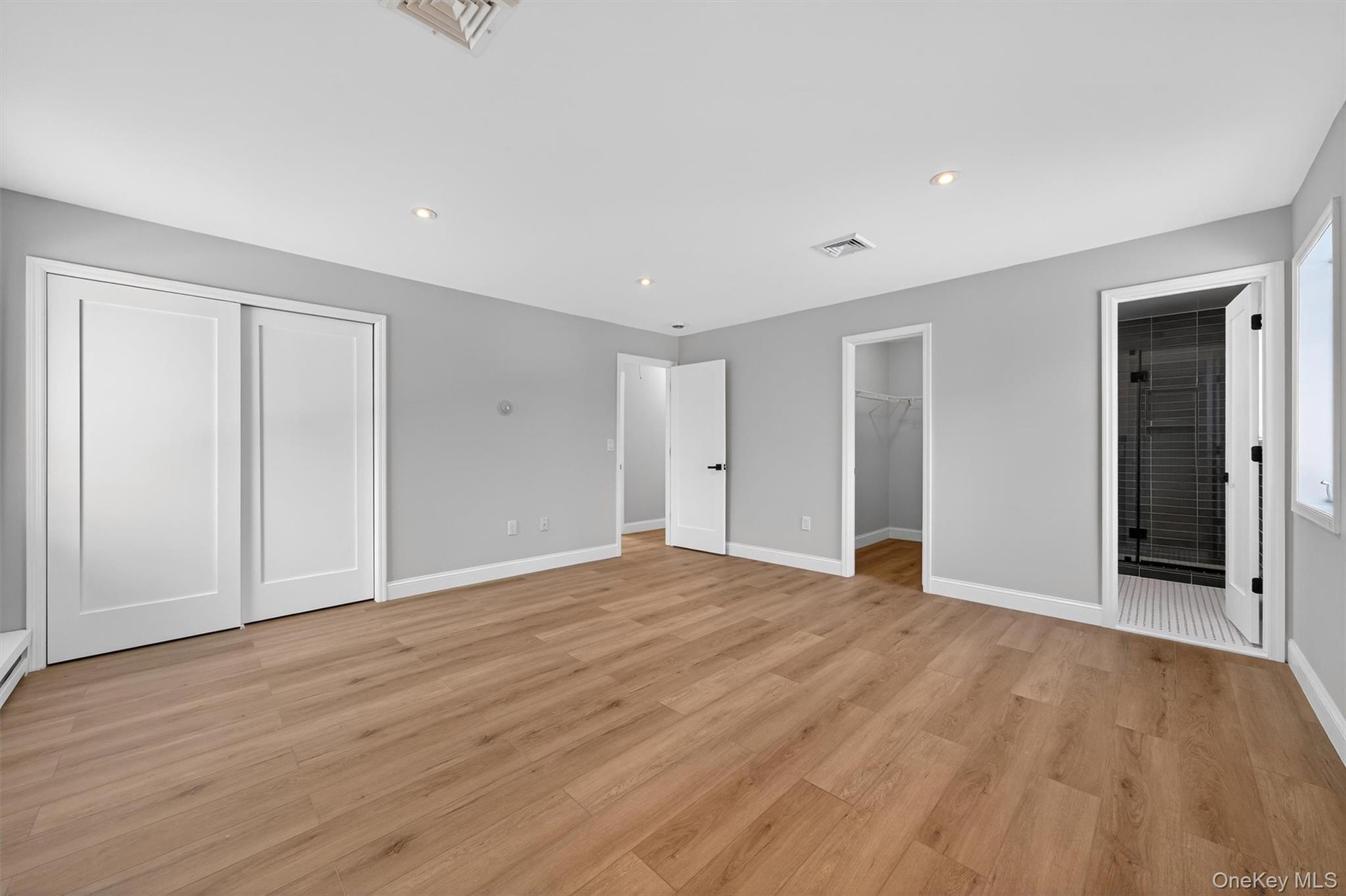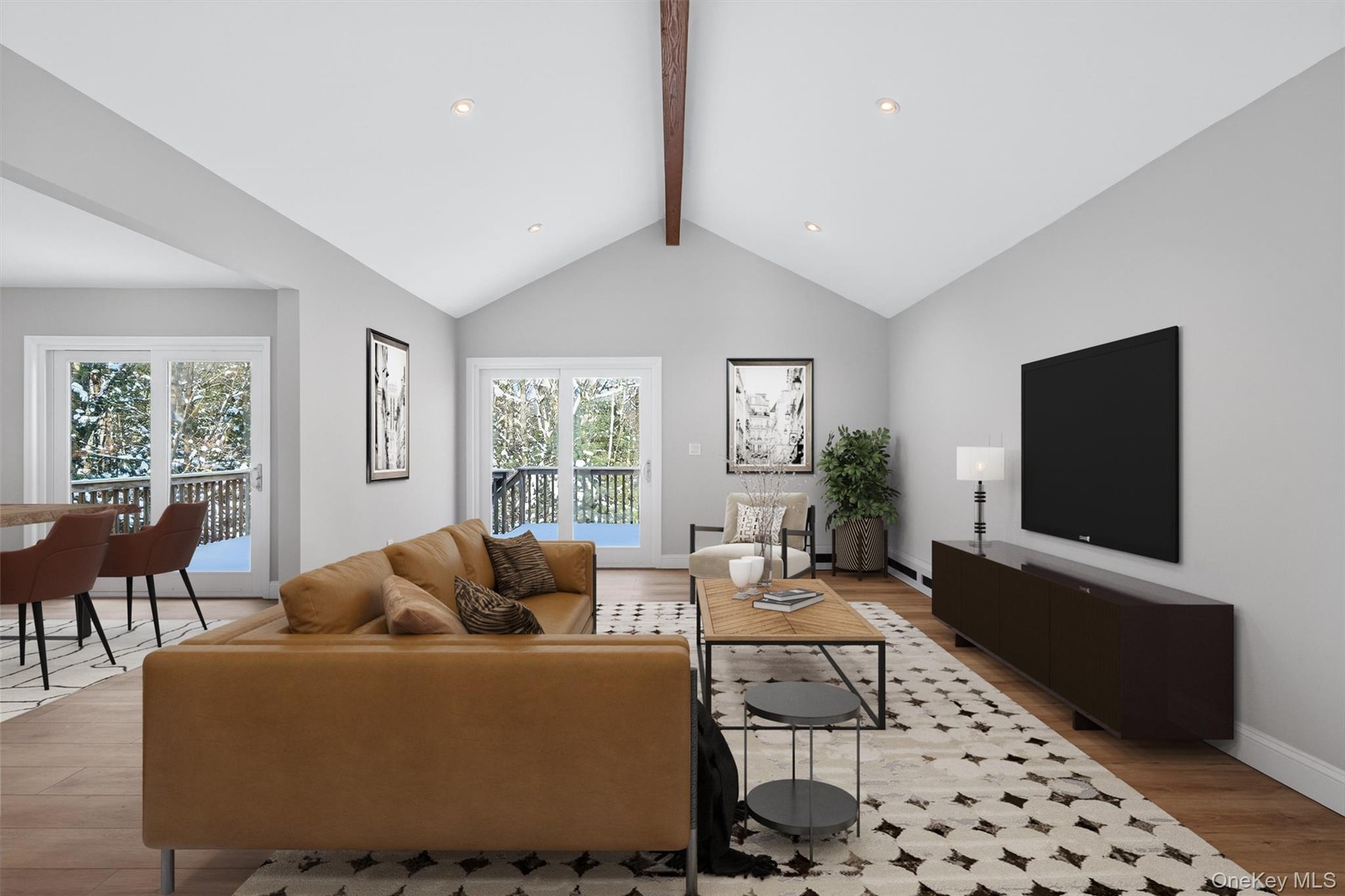 The upper level has three bedrooms and two full bathrooms. The chef’s eat-in kitchen features quartz countertops with quality Wolf cabinets, and stainless-steel appliances by Whirlpool. The formal dining room can accommodate a table for large gatherings, and it, as well as the living room, both have doors that lead out to the spacious back deck. The living room is massive and has vaulted ceilings that make it feel even larger. All three bedrooms offer good closet space, with the huge primary bedroom offering two closets (one of which is a walk-in) plus an ensuite bathroom with a walk-in shower with a custom shower base, glass shower door, and luxurious finishes. The hallway bathroom has a large vanity and a bathtub with glass doors.