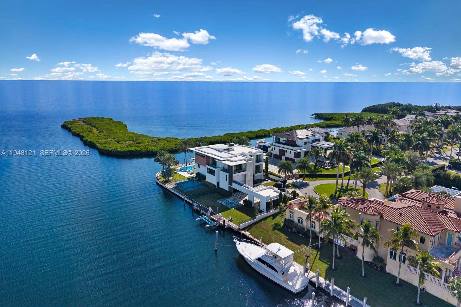 Spectacular bayfront modern family home on a rare corner point lot with 300 feet of prime waterfront in an unbeatable location.