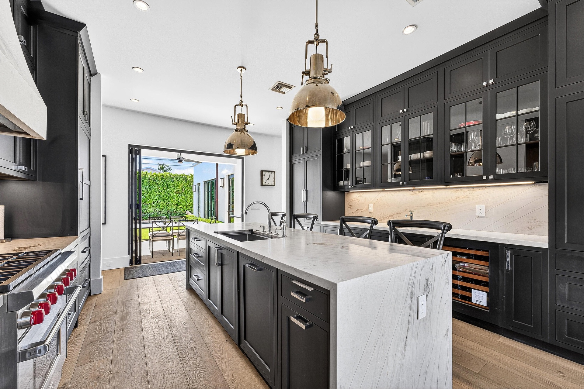 Features include 10-foot ceilings, expansive casement windows, European wide-plank oak floors, insulated interior walls for a remarkably quiet interior, and abundant natural light throughout. The kitchen is equipped with Sub-Zero and Wolf appliances, complemented by a whole-home water softener and purification system.