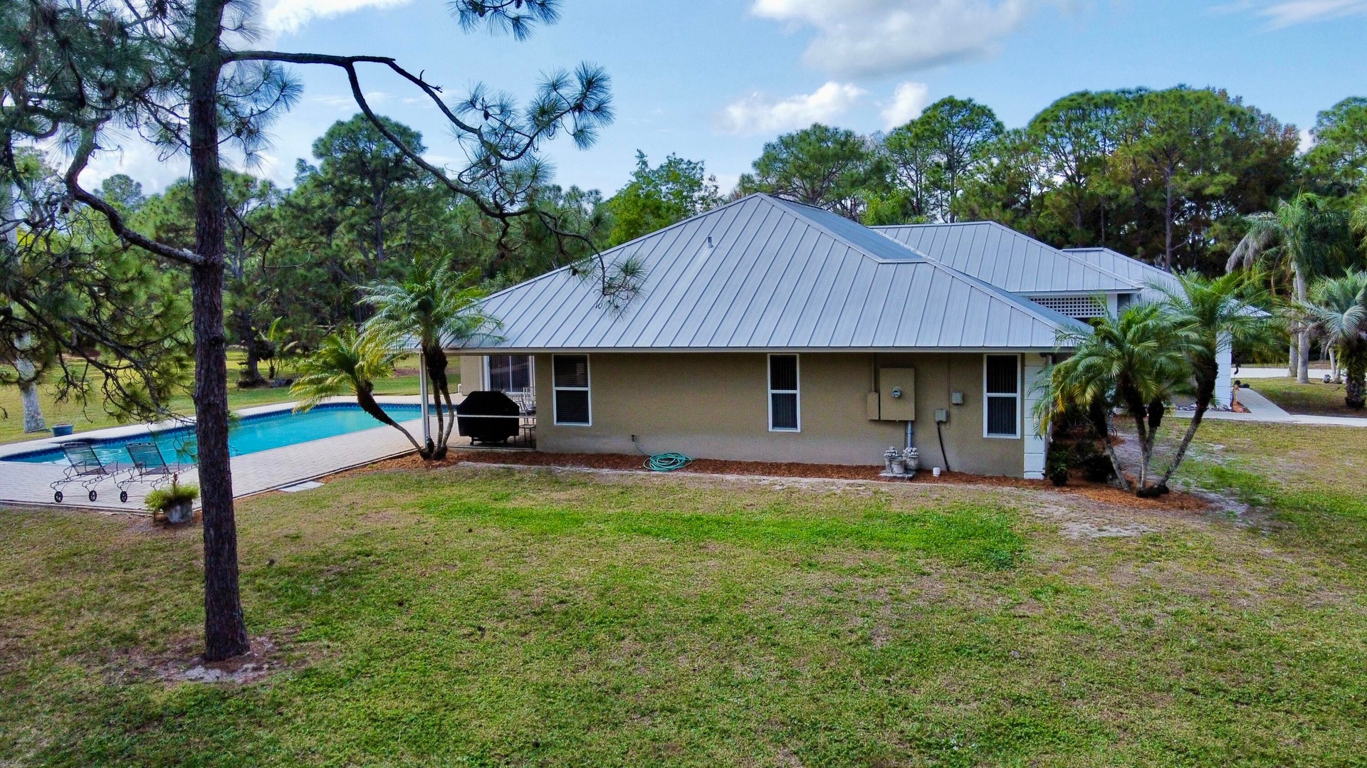 Original owner/builder of this superbly built home on 6.79 high & dry Acres in Jupiter ensured that EVERYTHING was done to the highest caliber of construction. Impeccably maintained this home has 4 Bedrooms PLUS Office 2.5 Bathrooms 3 Car Garage, 20'x40' POOL, standing seam METAL roof, complete storm protection, high vaulted ceilings, impact skylights, cabana bathrooms. An exceptional floor plan & thoughtful placement of glass doors & windows provides your own private views of nature from almost every room in the house. Open to the family room a very functional kitchen with more than enough space, separate living room & dining room for a bit of privacy, split bedroom floor plan, inviting entrance & circular concrete driveway. Located in the exclusive Gated community of Ranch Colony.