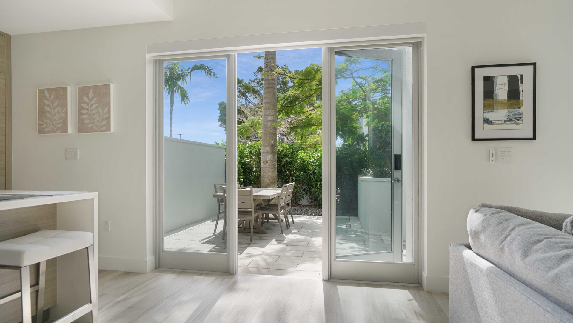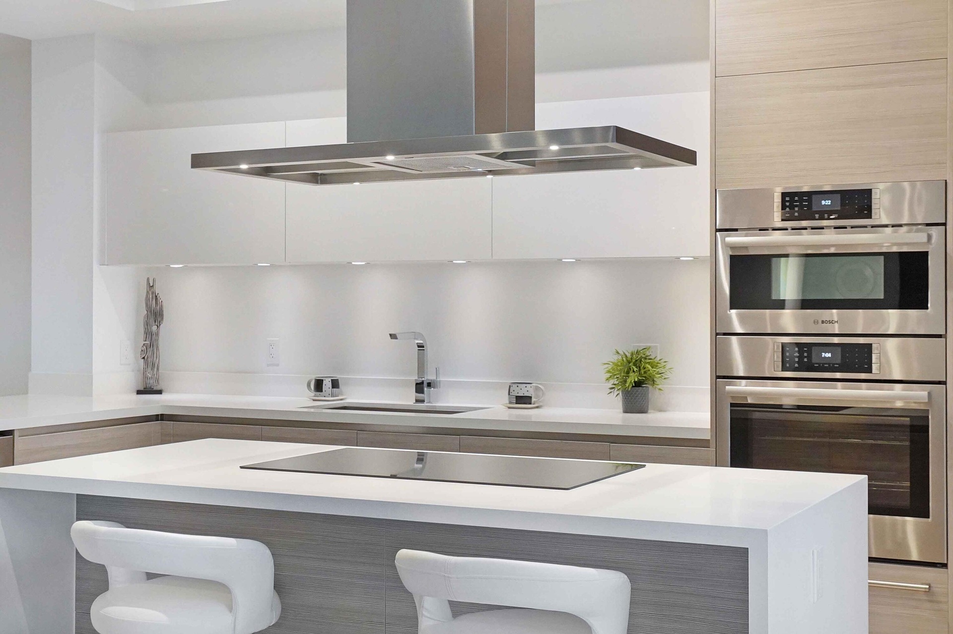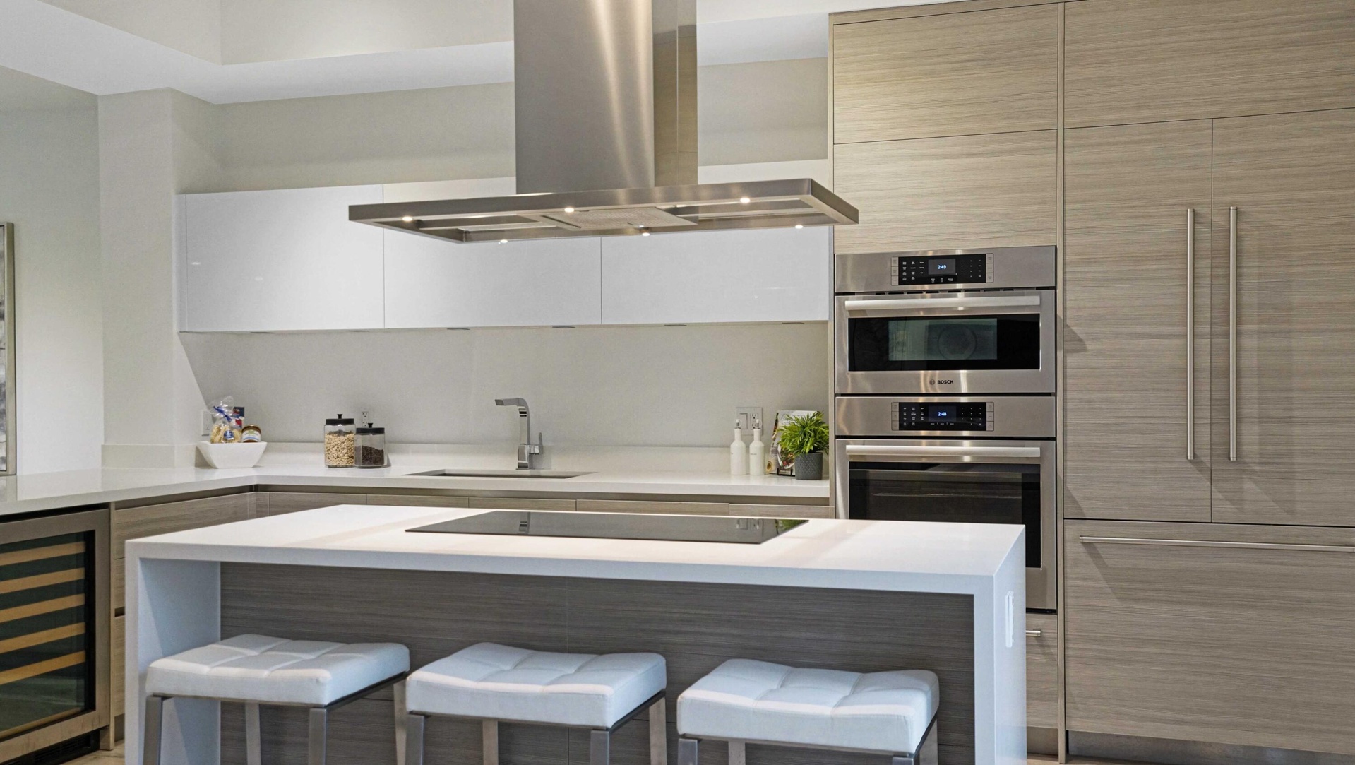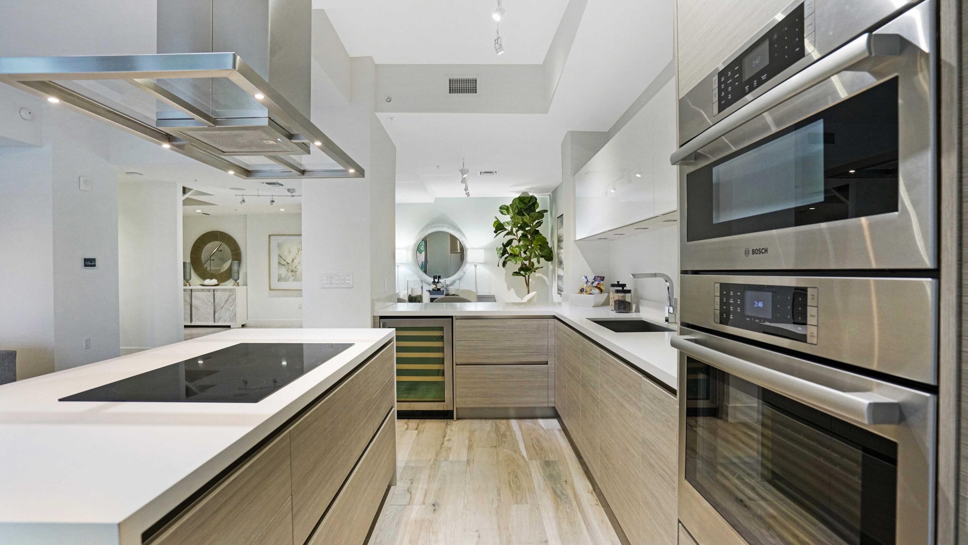 The interior features Italian porcelain tile flooring, 10-foot ceilings, and a chef's kitchen appointed with handcrafted Italian cabinetry, quartz countertops, Sub-Zero refrigerator and freezer, double wall ovens, wine refrigerator, and an oversized center island designed for both daily living and entertaining.