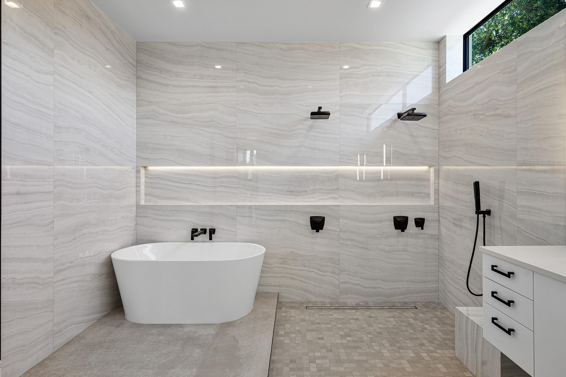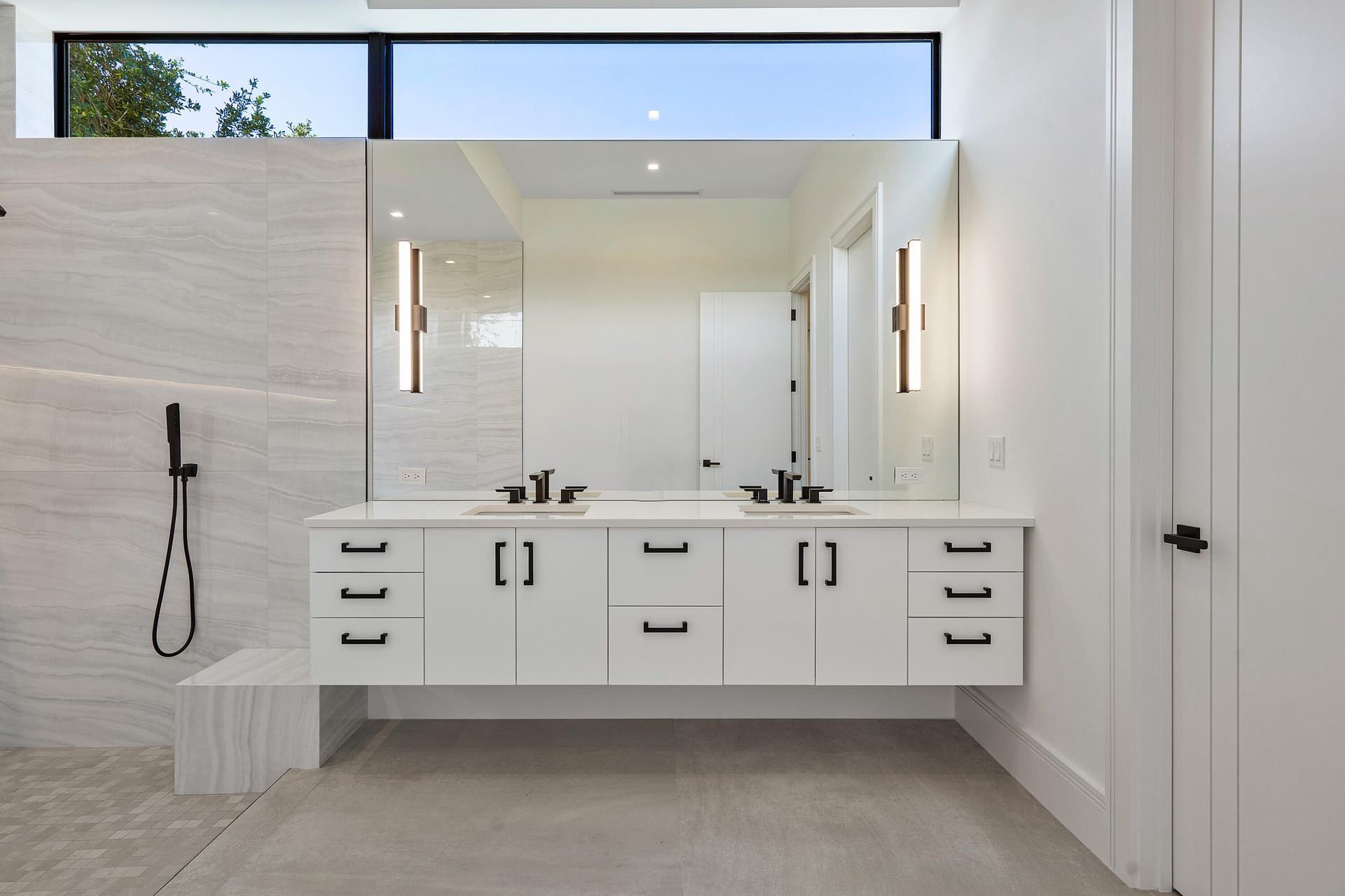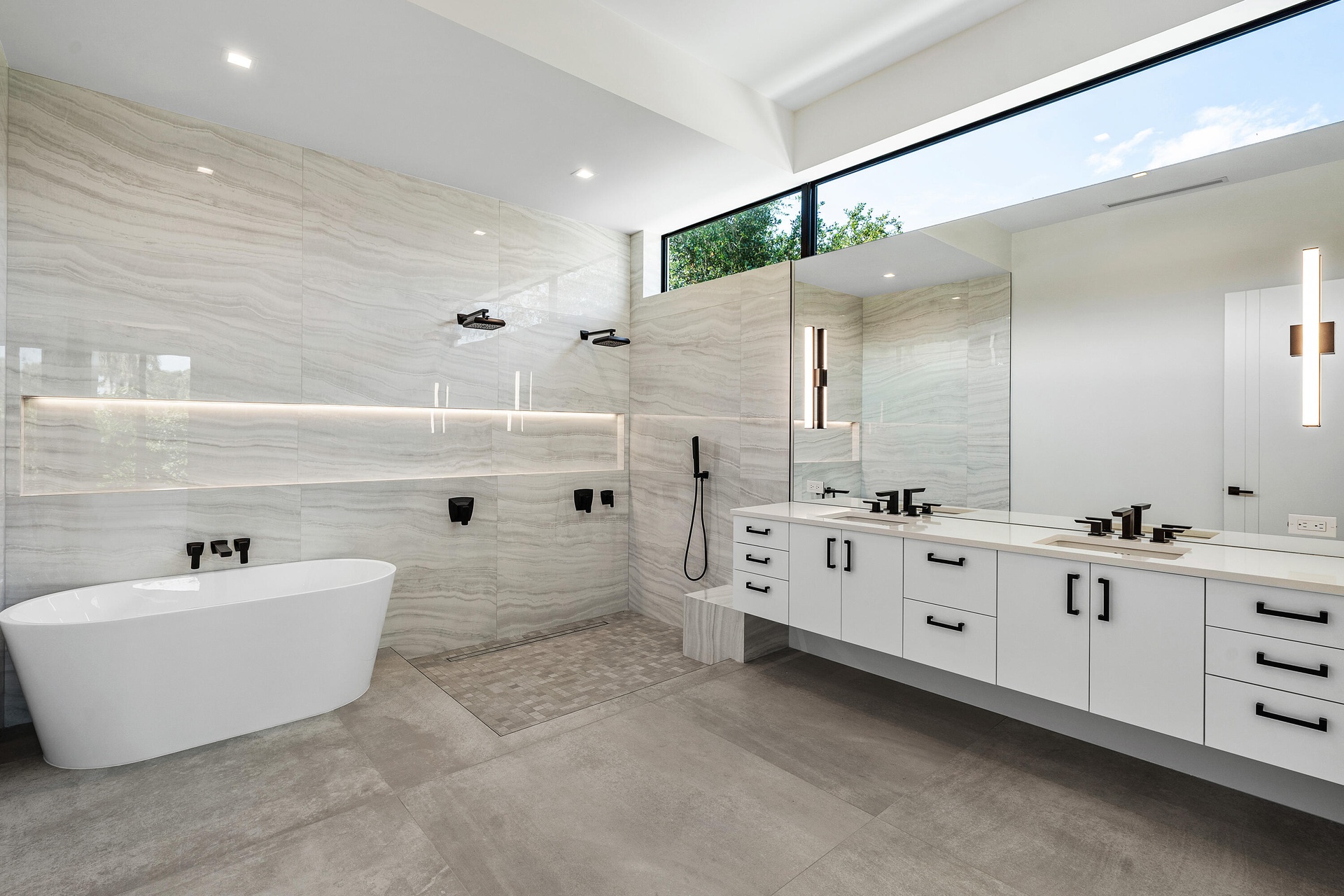 Two sets of large sliders open to a covered patio and alfresco dining area, automated screens for year round enjoyment, leading to a generously sized pool and outdoor summer kitchen. The primary suite offers a true retreat with a spa-style bath featuring a wet room, double vanity, transom windows, and separate his-and-her closets. Automated blackout window treatments provide comfort and privacy.